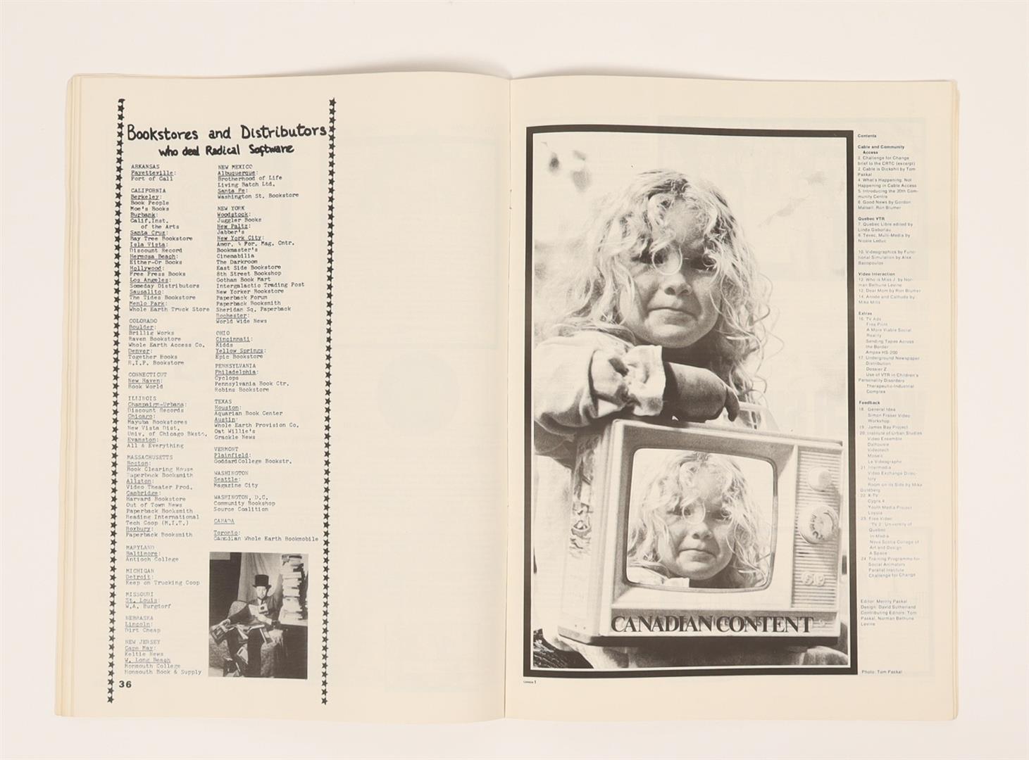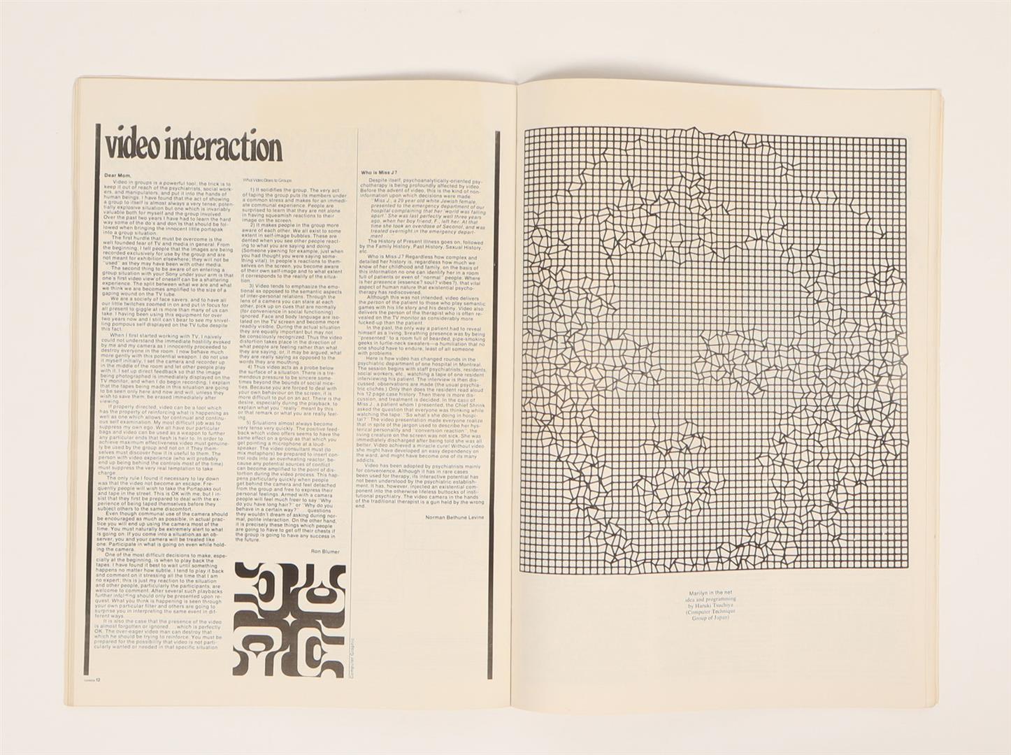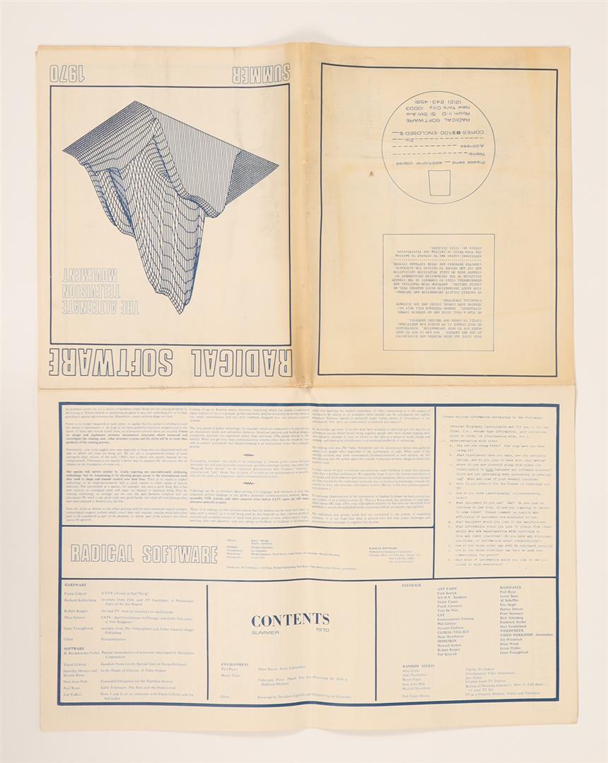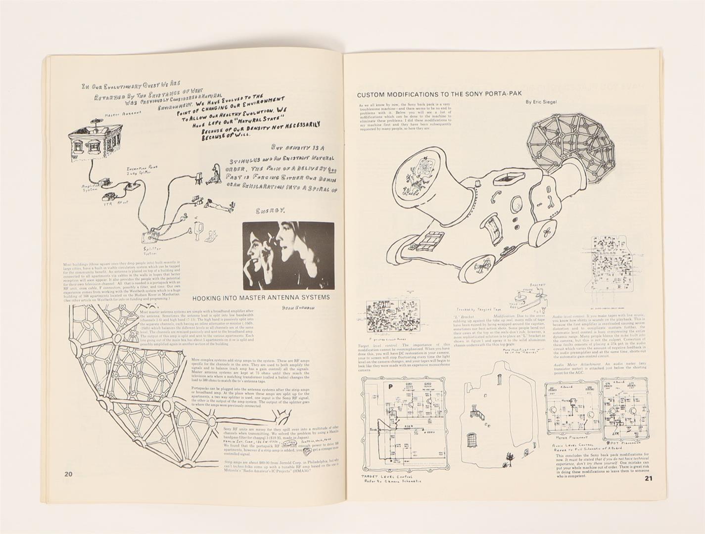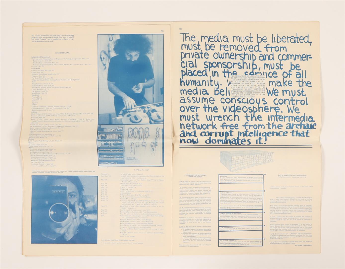 (1) Vol 1. No. 1 Summer 1970. The alternative television movement. Tabloid, 36.5 x 29 cm, 48 pp. printed in blue. Edited by Beryl Korot and Phyllis Gershuny. Contributions by Nam June Paik, Frank Gillette, Paul Ryan, R. Buckminster Fuller, Aldo Tambellini et al. Age-related wear on exterior sheets and tear along top right fold. (2) Vol 1. No. 4 Summer 1971. Tabloid, 39.5 x 28 cm, 76 pp., cover in blue and orange, interior b/w. Edited by Beryl Korot and Megan Williams. Contributors include Parry Teasdale, Frank Gillette, Louis Jaffe, the Videofreex and many more. Crisp copy. (total 2)