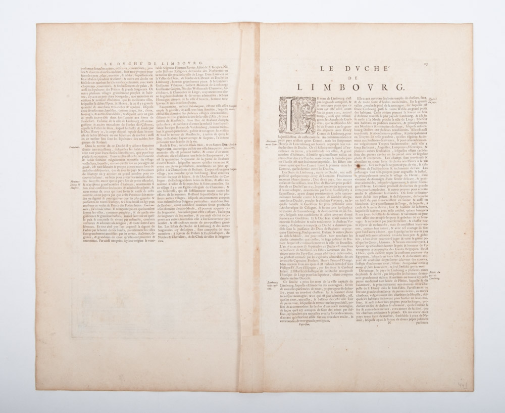 Cf. Koeman 2:213.1.LJ. Le Duché de Limbourg, copperengraving, 38x50cm., original colouring, middle folding line as published, allegorical cartouche. mile indicator bottom right, with e.g. the cities of Maastricht, Sittard, Heerlen, Kerkrade and Valkenburg. In very good condition.