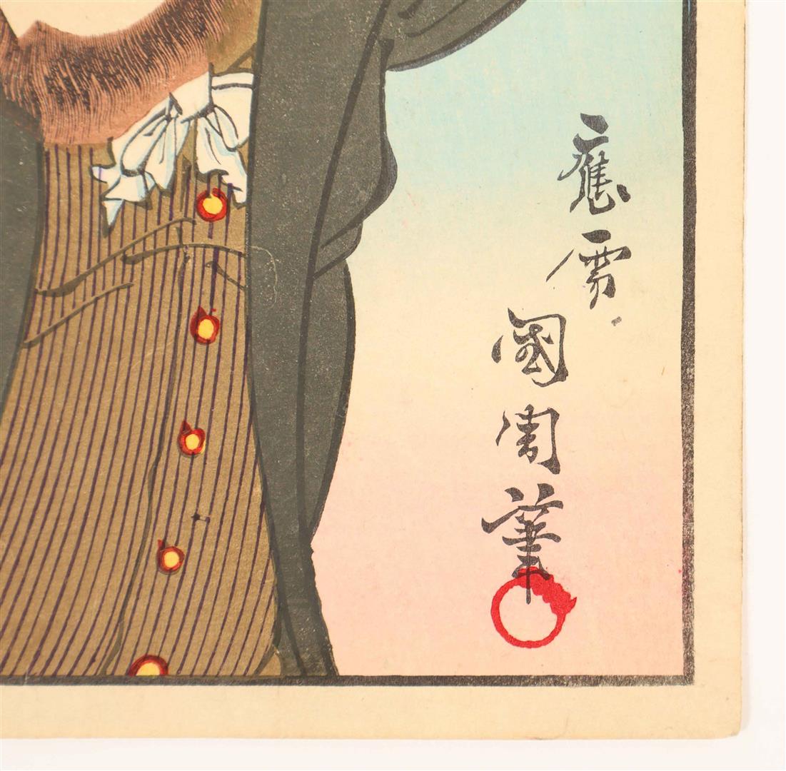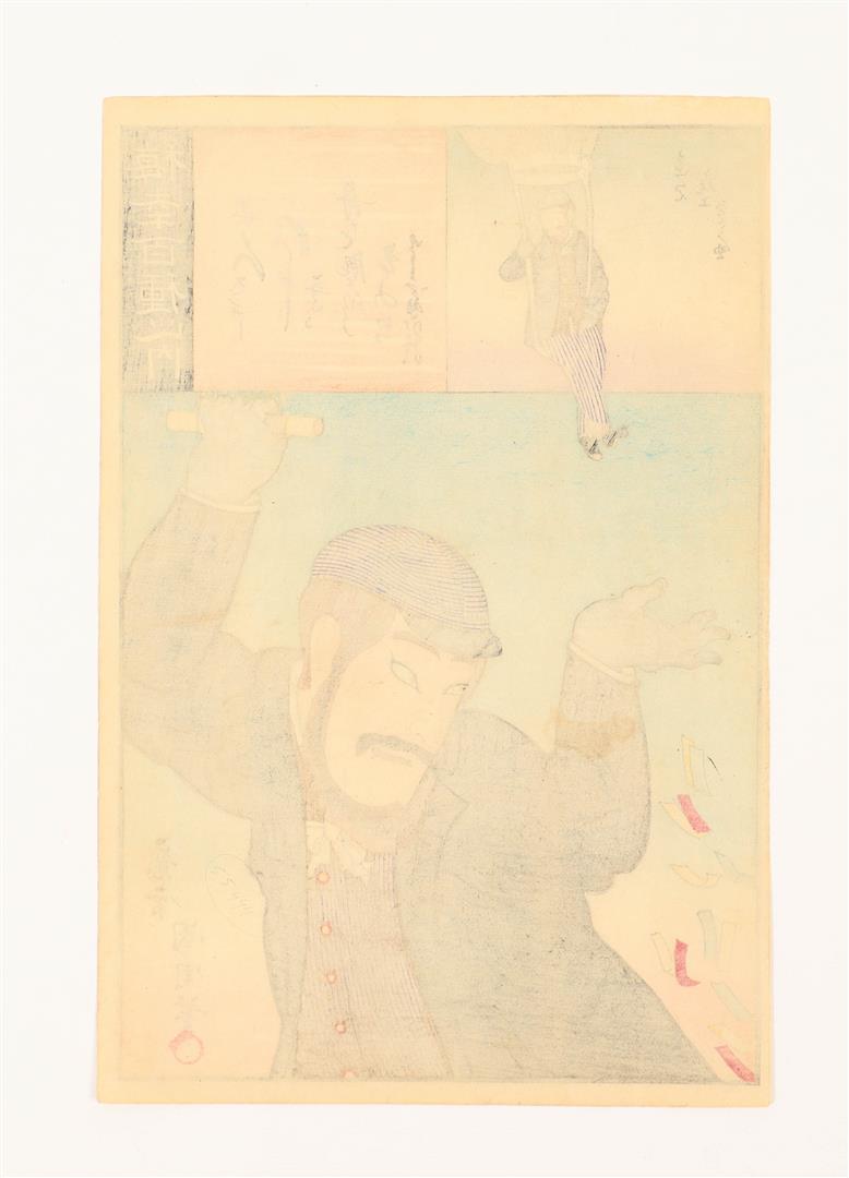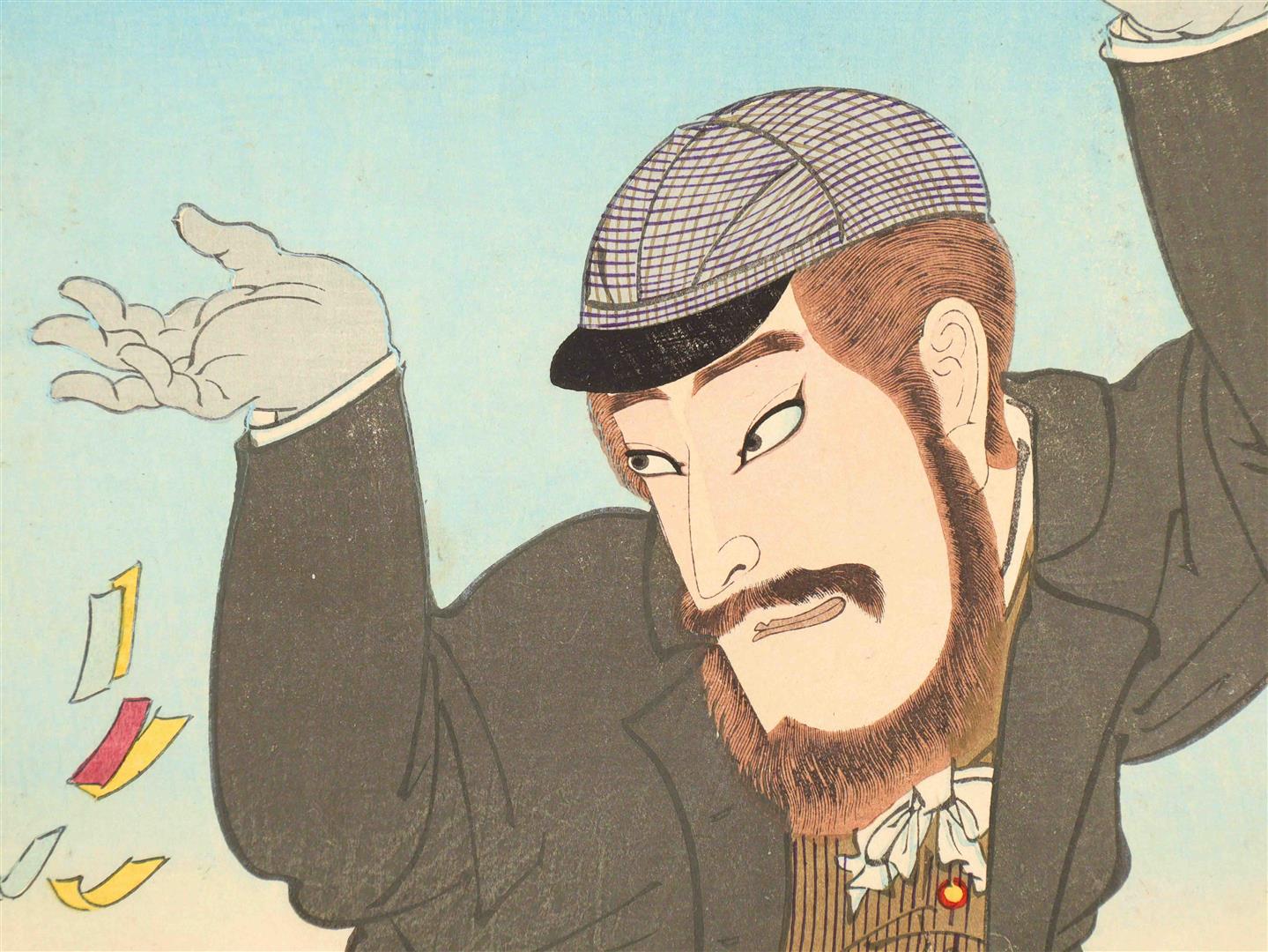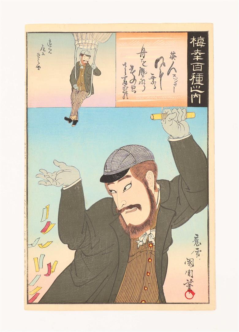 Onoe Kikugoro V as the Englishman Spencer and Onoe Ushinosuke II as Spencer in the play Riding the Famous Hot-Air Balloon. Col. woodcut Oban, signed oju Kunichika-hitsu w. red toshidama ring, publ. Fukuda Kumajiro, 1893.