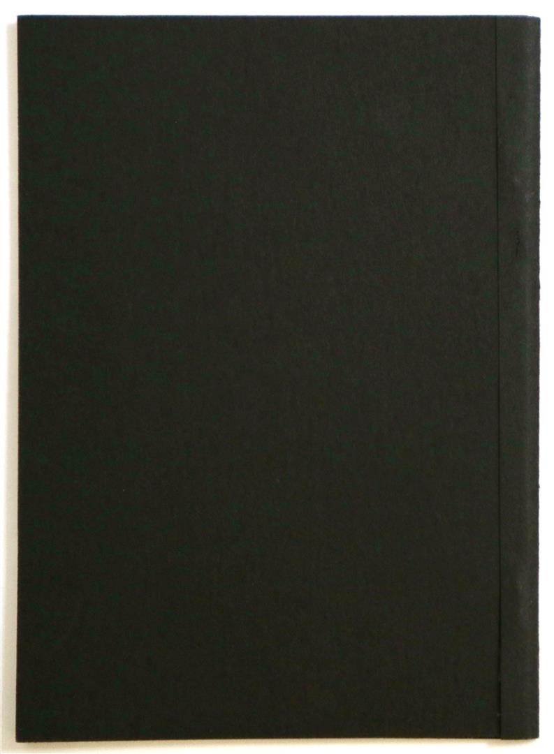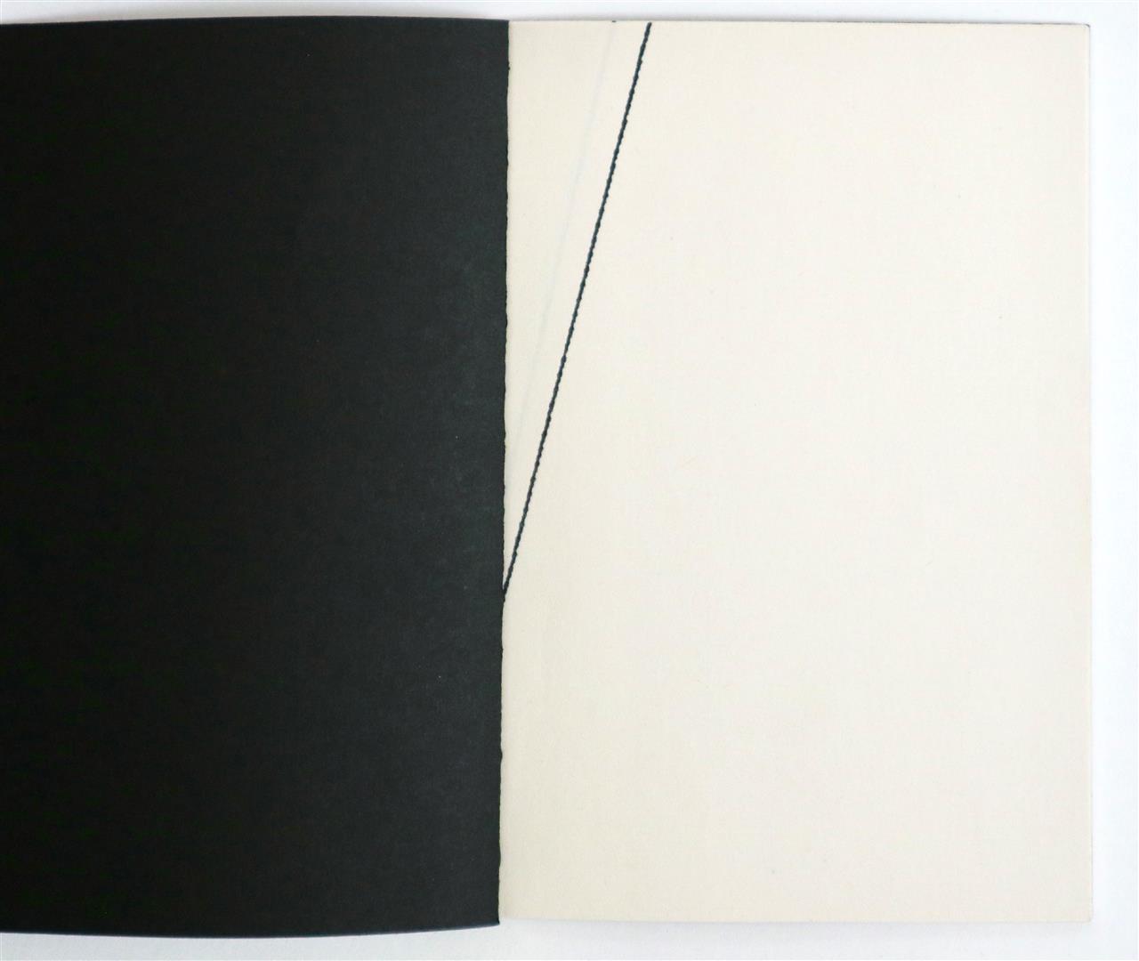 Staple-bound black paper covers with black paper spine, 15 x 10.7 cm. Contains 16 white sheets, each with a different hand-drawn diagonal line in black ink.