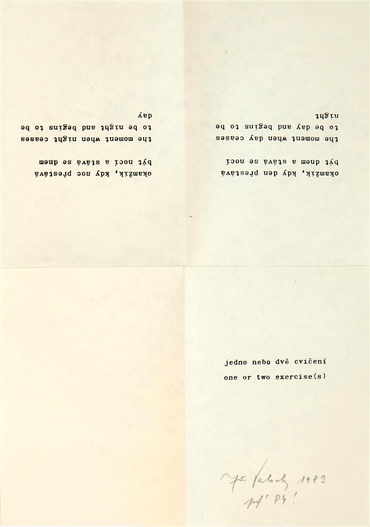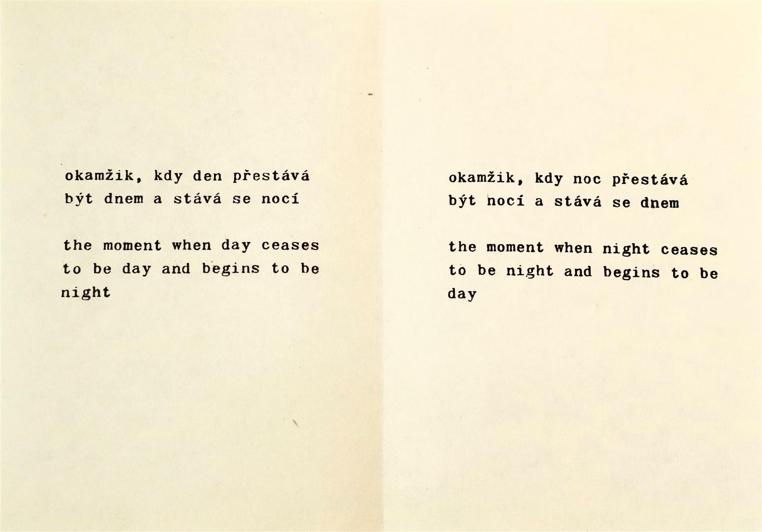 Texts in separate sections in both Czsechoslovakian and English read: 'one or two exercise(s)'; 'the moment when day ceases to be day and begins to be night'; 'the moment when night ceases to be night and begins to be day'. Excellent copy.