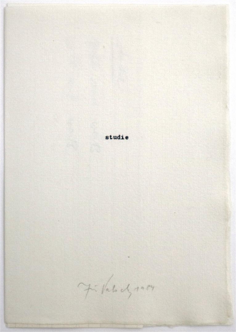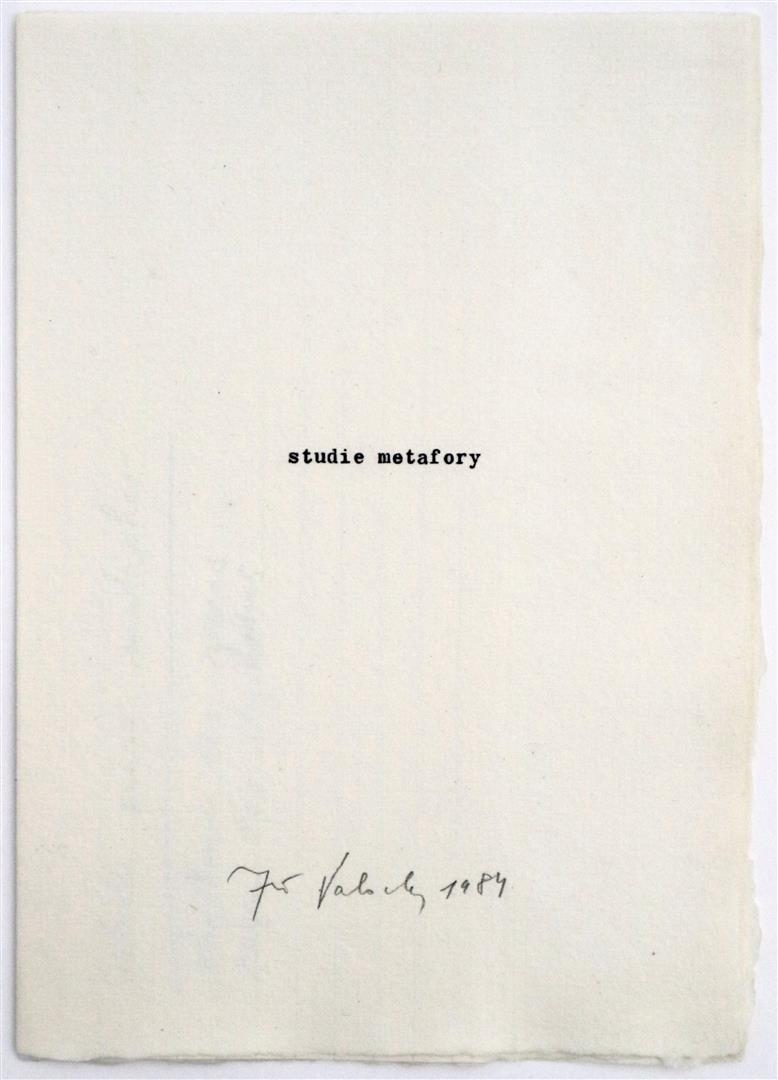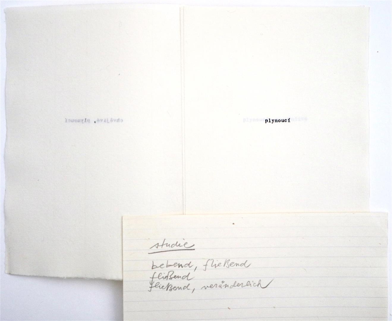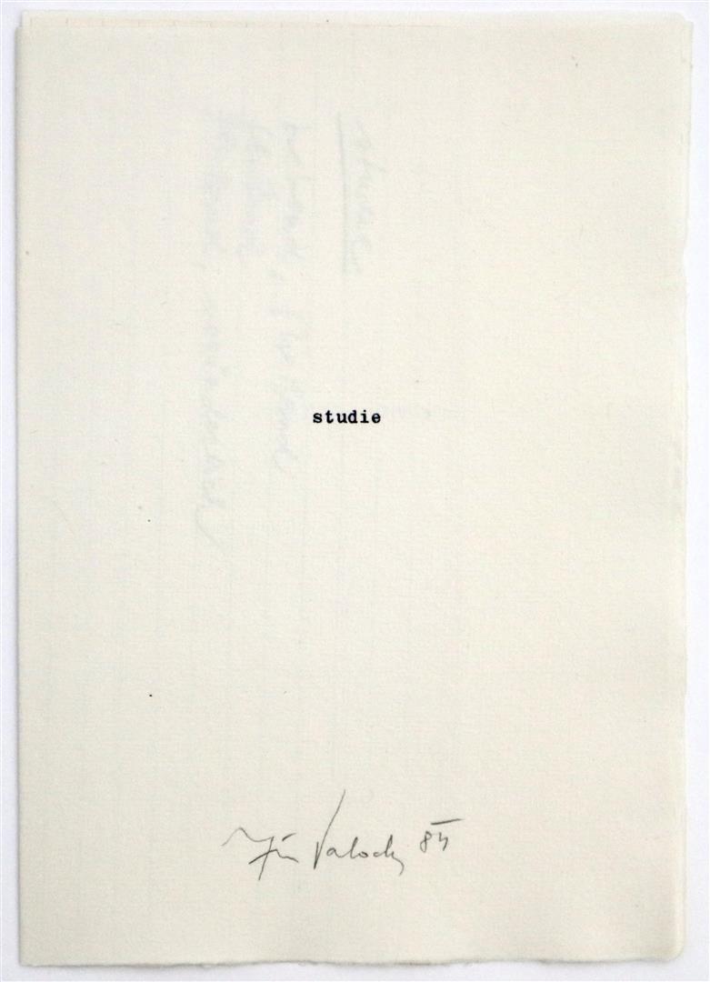 Series of eight concrete poetry works, printed black on wove paper, 21 x 15 cm. Each piece consists of 2 to 3 loose sheets, inserted into a folded cover sheet titled 'Studie', and signed 'Jiri Valoch 1984' in pencil. With loose inlaid German translation of the Czech texts.
