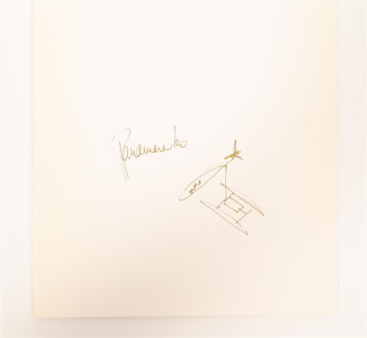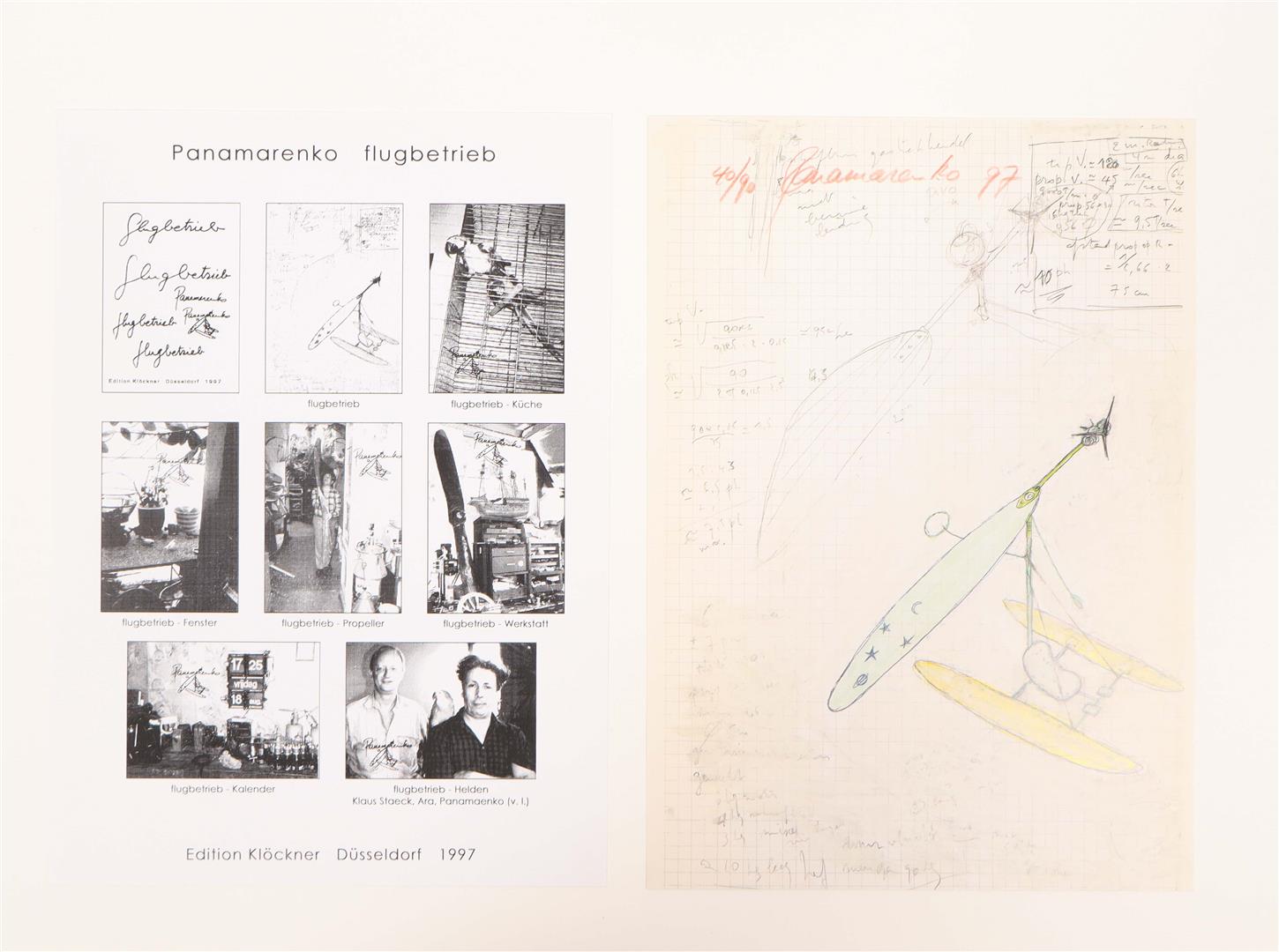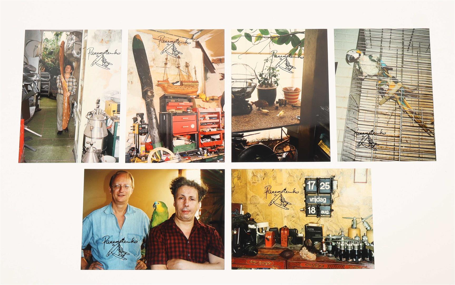 The litho is numbered 40/90, and hand-signed in red pencil. The C-prints are stamped with the artists' name and a small drawing, and depict luscious daily scenes from Panamarenko's home, including a portrait with parrot, and a picture of the artist walking through the house carrying an airplane propellor. In very good condition.
