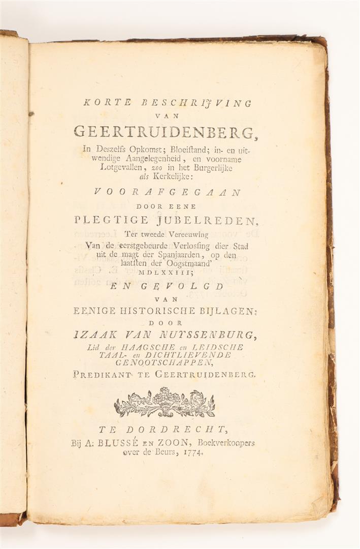 Rubbed at extremities, else in good condition. Description of the city of Geertruidenberg and it's (ecclesiastical history). The 2nd work is a collection of sonnets and poetry on the history of Geertruidenberg.