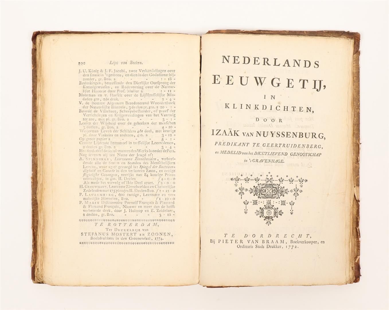 in deszelfs opkomst; bloeistand; in- en uitwendige aangelegenheid, en voorname lotgevallen, zoo in het burgelijke als kerkelijke: voorafgegaan door eene plegtige jubelreden, ten tweede vereeuwing van de eerstgebeurde verlossing dier stad uit de magt der Spanjaarden, op den laatsten der Oostmaand' 1623; en gevolgd van eenige historische bijlagen. Dordrecht, A. Blussé en Zoon, 1774. (10),200 p. Bound with: Idem. Neerlands eeuwgetij, in klinkdichten. Dordrecht, P. van Braam, 1772. With "Bijvoegsel". (16),27,(5) p.
