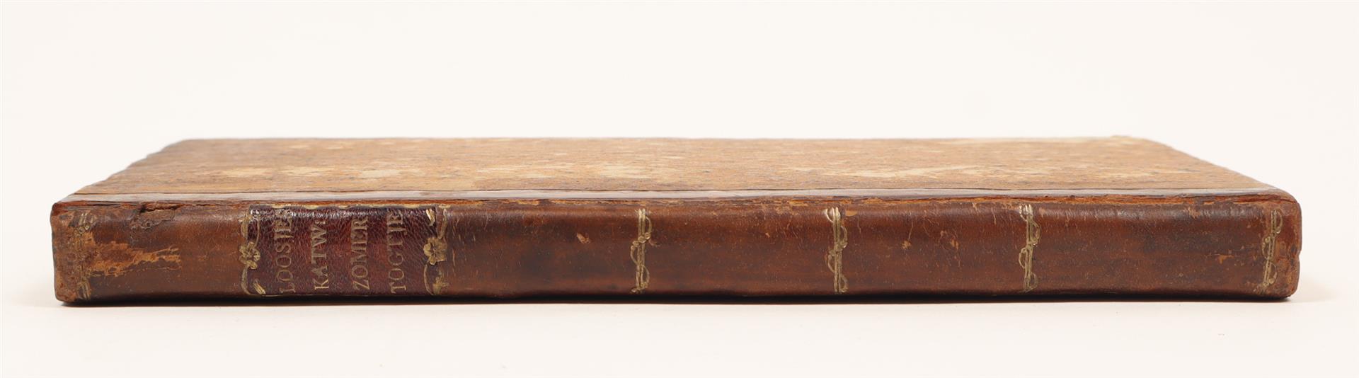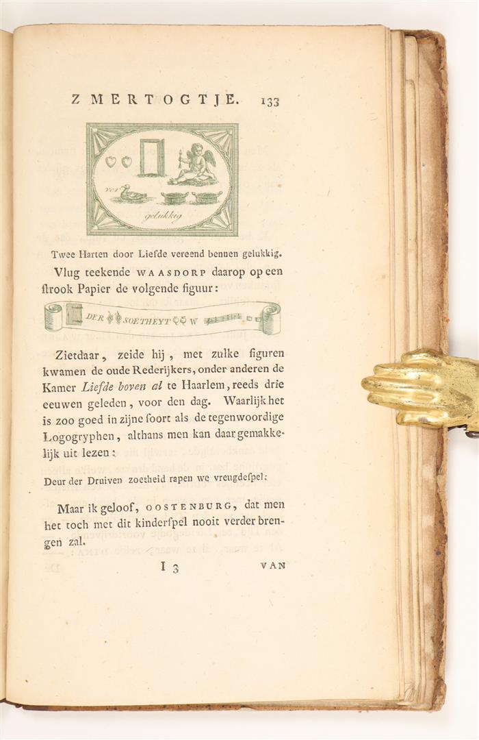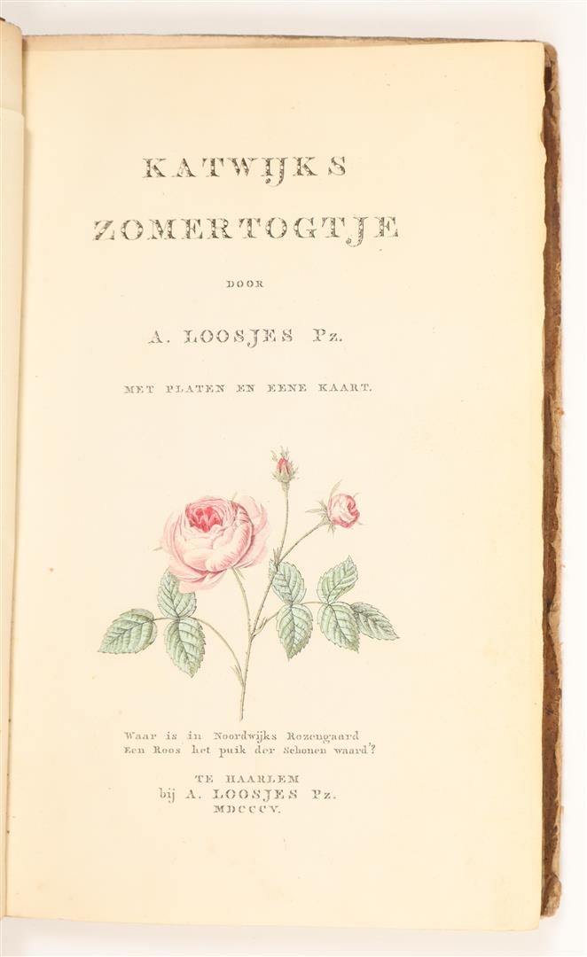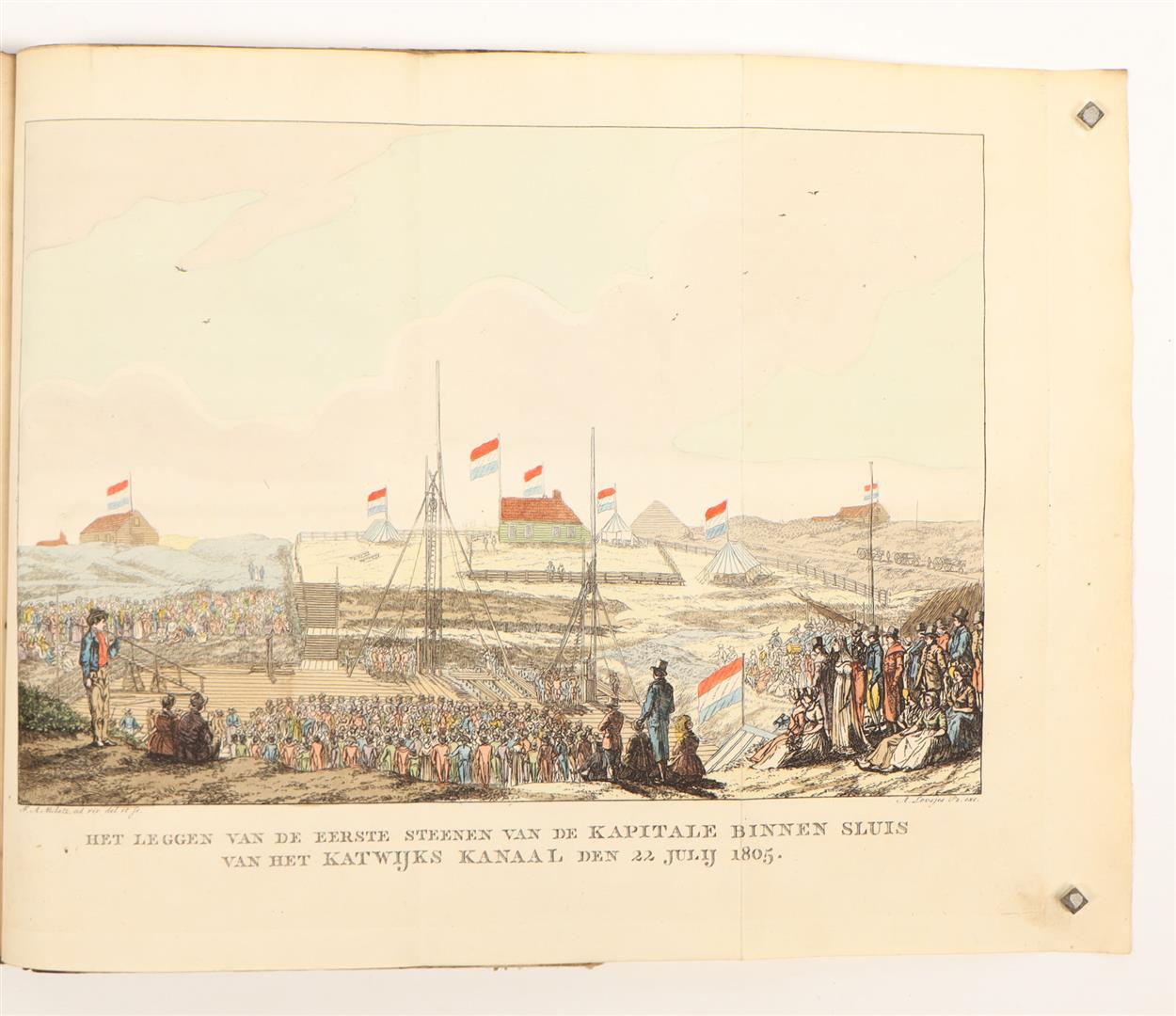Haarlem, the author, 1805. 1st ed., VIII,175,(2) p., engr. title-p. w. handcol. branch of roses, fold. map by D. Veelwaard, handcol. fold. plate of ceremonial prior to the work on the canal sluice, handcol. plate of a bouquet of wild flowers, and 2 engr. rebuses printed in green, plates printed on Dutch wove paper by Jan Kool, contemp. gilt hcalf w. mor. letterpiece.
