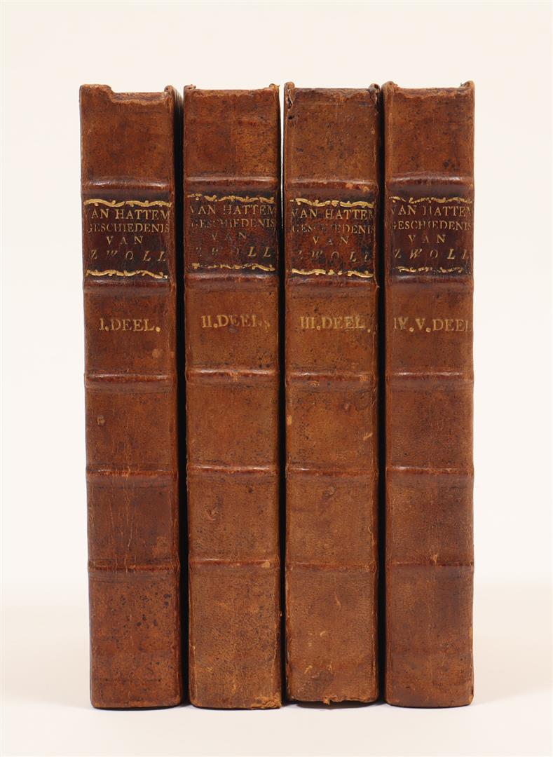 behelsende een verhaal van haar eerste beginselen, verheffinge tot een stad, en de merkwaardigste gebeurtenissen aldaar van oudsher, tot by na dese tyden toe, voorgevallen. Zwolle, S. Clement and J.A. van Santen, 1767-1776. 5 parts in 4 vols., contemp. unif. gilt hcalf w. mor. letterpieces.