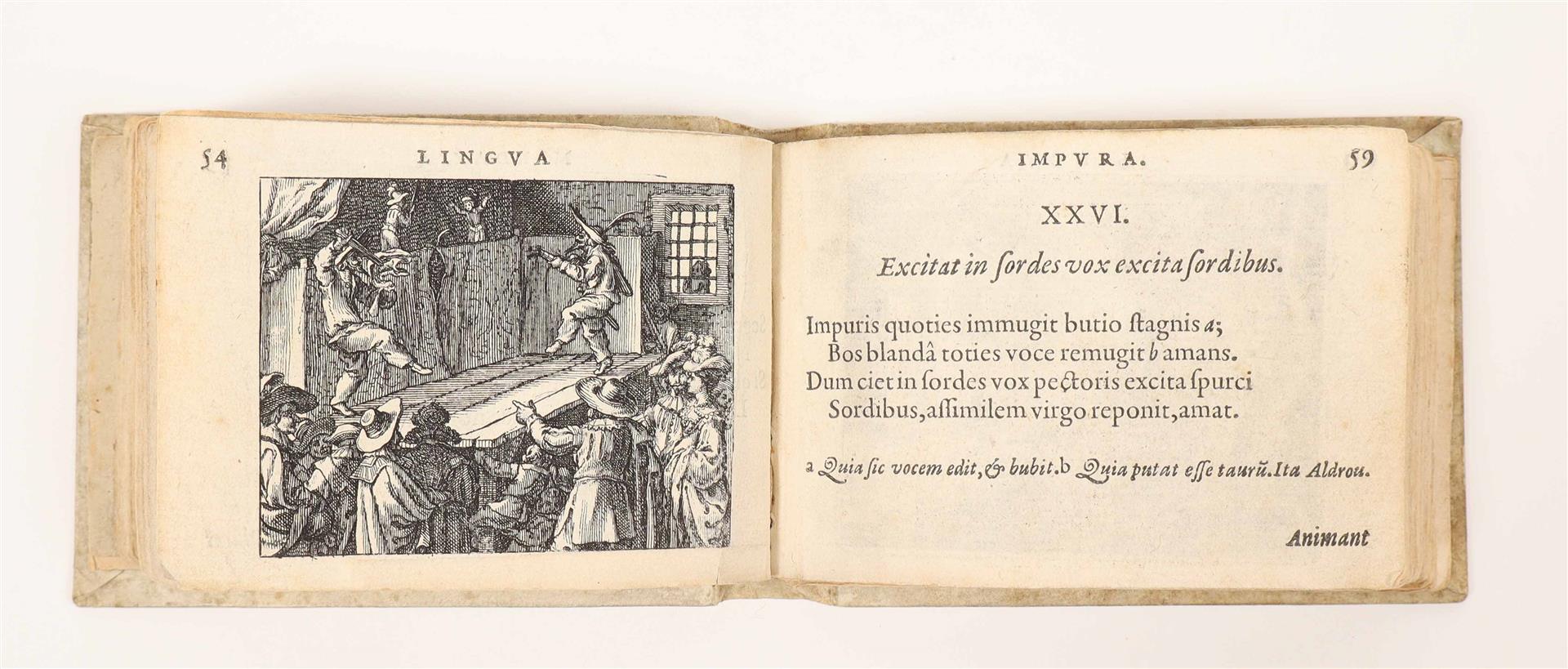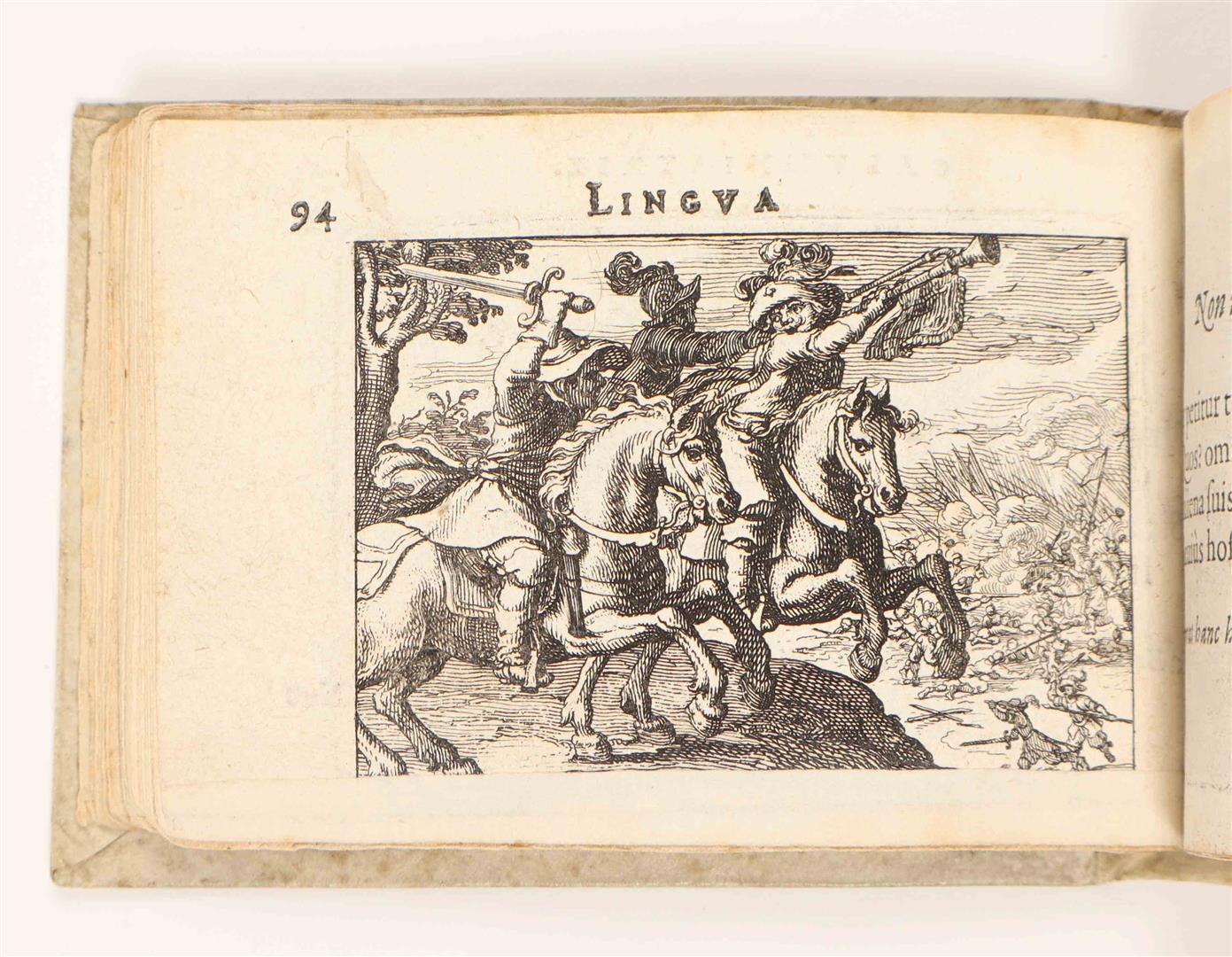 Johannes Cnobbarus. Antwerp. 1631. 16mo (75 x 100 mm). Modern vellum, spine w. gilt title, marbled endpapers. Allegorical engraved frontispiece w. title, (18),191 p. With 92 engravings by Abraham van Diepenbeeck and accompanying text by Antoine de Bourgogne. Some leaves trimmed cut short. Scarce emblem book.