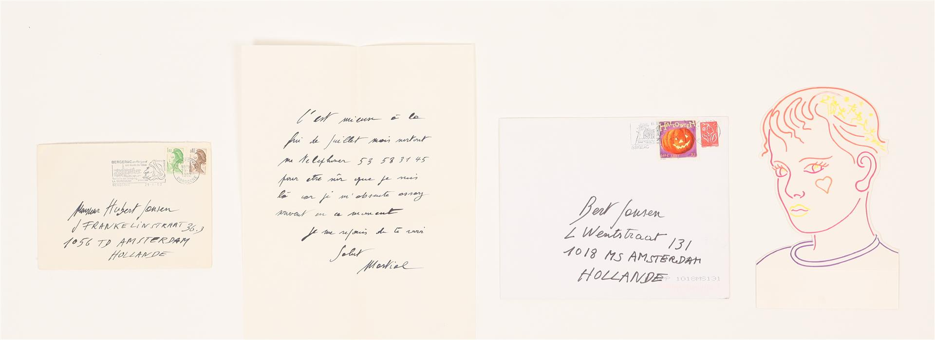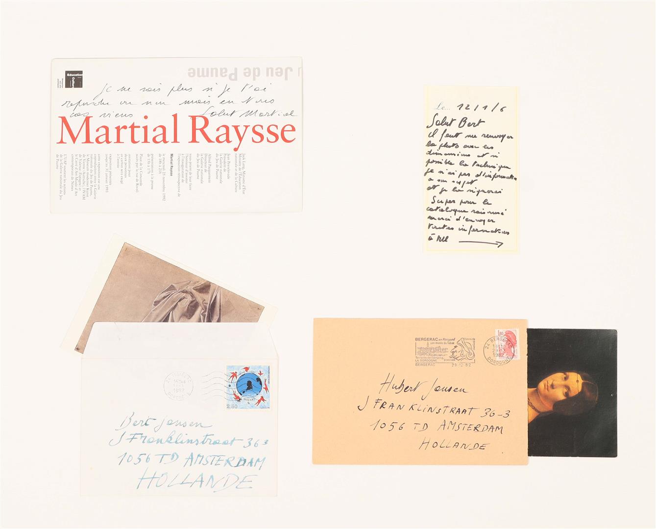 (1) Rare invitation card printed purple on silver mirror stock, 23 x 17 cm, announcing the opening of the exhibition 'Martial Raysse 5 tableaux 1 sculpture' at Galerie Alexandre Iolas in Paris on 27 April 1967 (undated). Excellent copy. (2-8) Seven letters, notes and cards sent by the prominent Nouveau Realist artist Martial Raysse (b. 1936) to the Dutch art critic Bert Jansen in 1982, 1992, and 2004-2006.