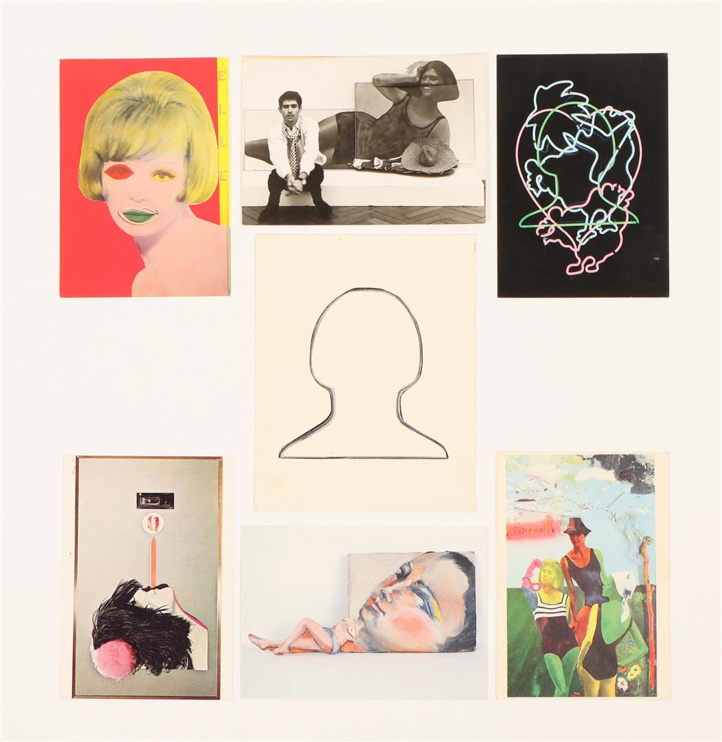 (9-29) Twenty b/w photographs, one colour picture, and one Kodak Ektachrome. Most pictures feature reproductions of works, some with labels and stamps on rear, deriving from the Stedelijk Museum Amsterdam, Jeu de Paume Paris, and Alexandre Iolas New York/Paris/Geneva. Includes four amazing installation photos showing exhibitions at Alexandre Iolas Gallery New York 1962, Dwan Gallery Los Angeles 1964, and Stedelijk Museum Amsterdam 1965. (30- 36) Six postcards with reproductions of works, and 1 invitation card for a preview of the Raysse exhibition at the Stedelijk Museum Amsterdam in 1965. (total 36)