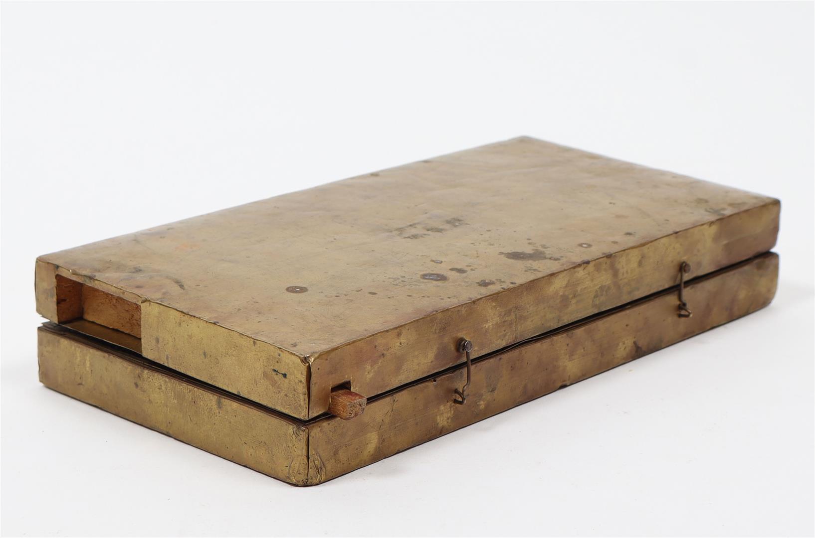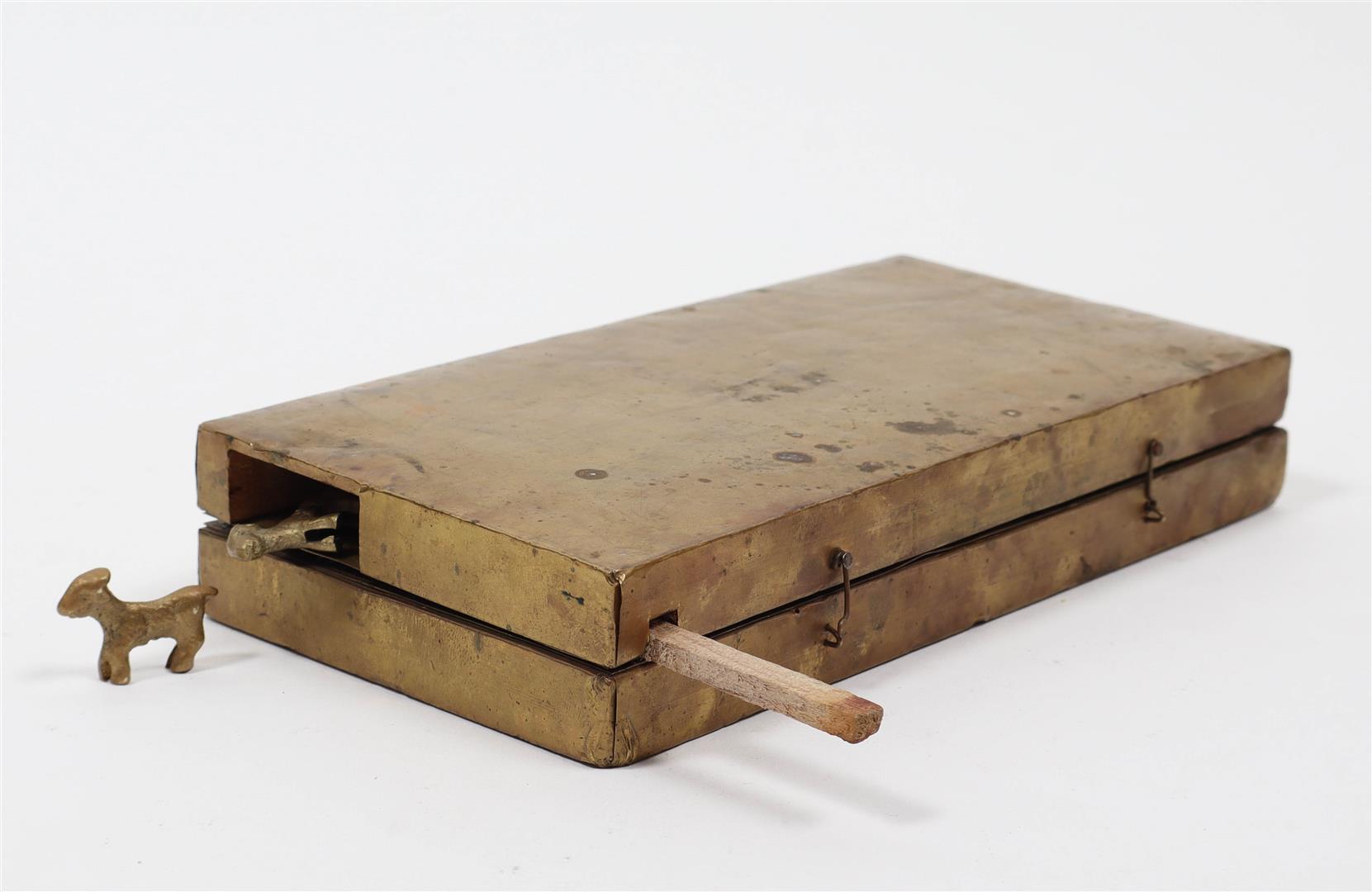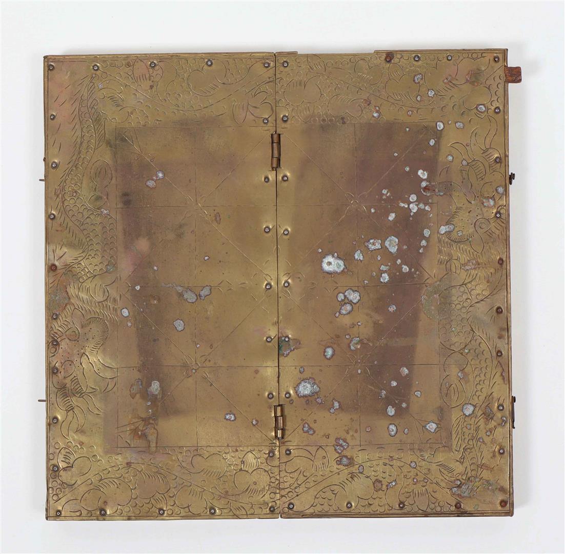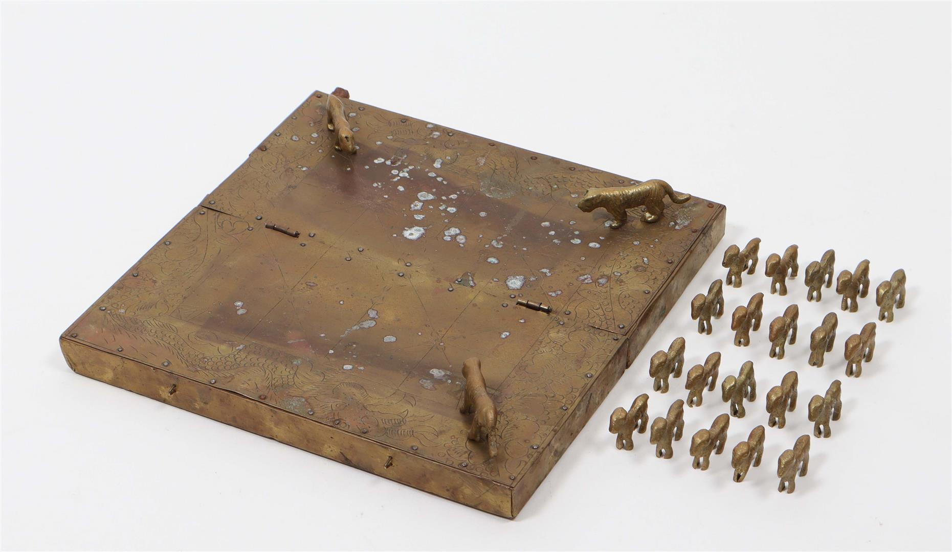 Engraved brass playing-board over wood, 20.5 x 20.5 cm (in open state, the board can be closed w. 2 sm. hooks), w. wooden peg revealing an inner compartment for storing the miniature three brass tigers and 20 brass goats, Nepal, probably first half 20th cent. Brass w. corroded/ stained spots.