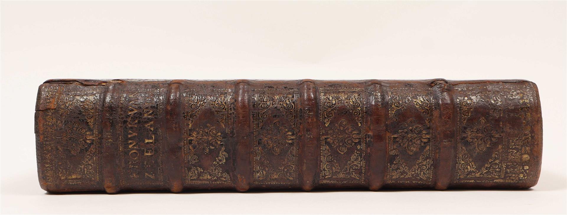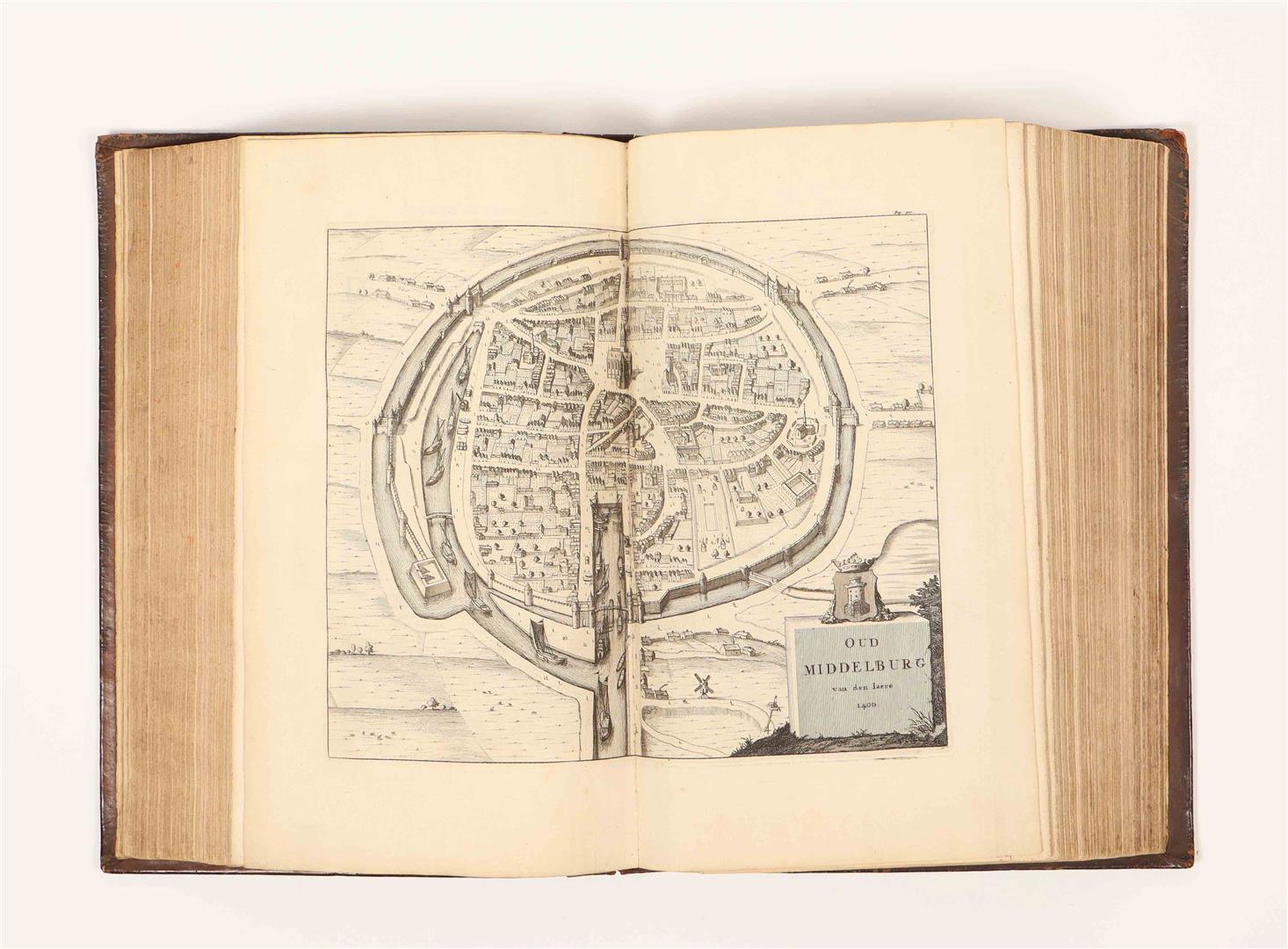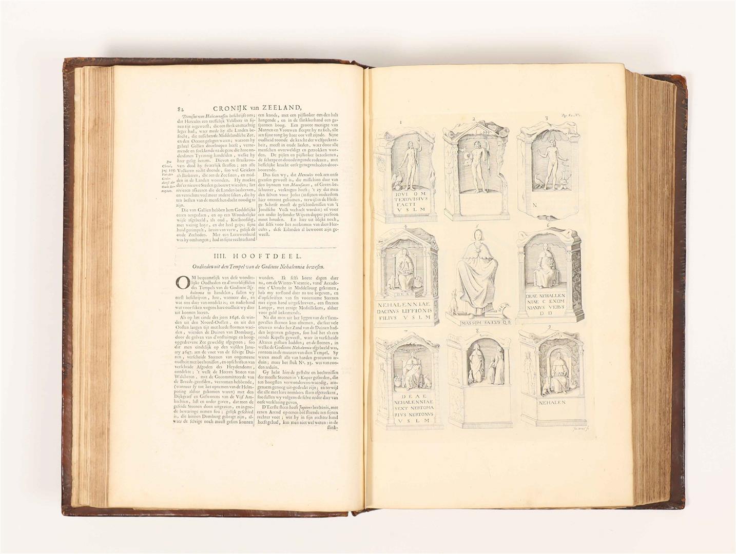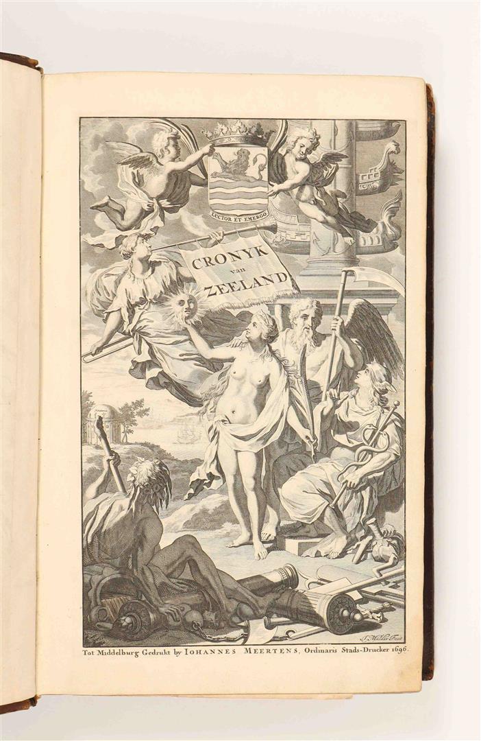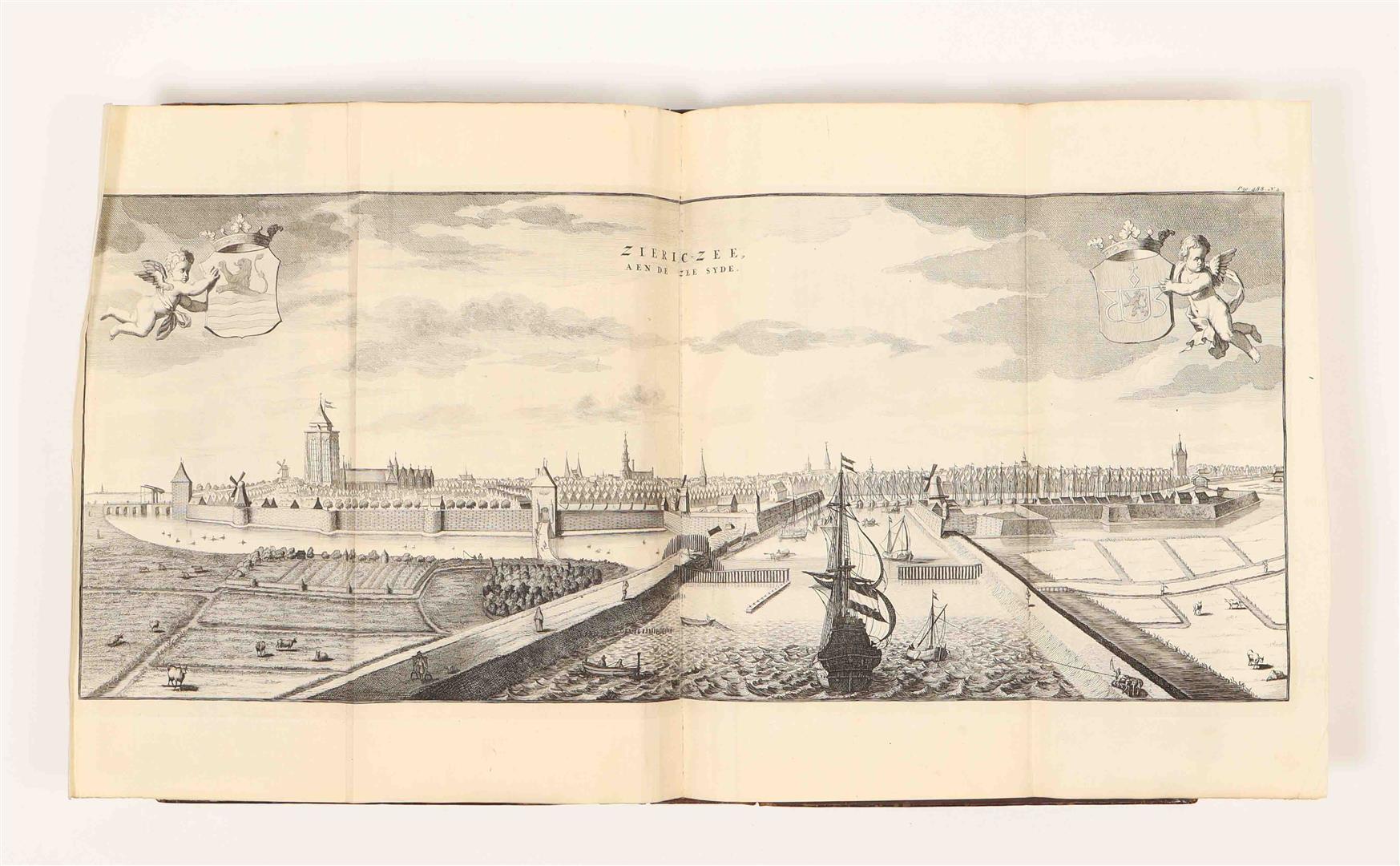 Eerste deel (=all publ.). M. Smallegange. Middelburg/Amst., Joannes Meertens/Abraham van Someren, 1696. (6), 774, (24) p. With frontispice, 14 maps of which 2 fold., and 76 engr. plates of which 6 fold. city views. Contemp. calf w. ribbed spine.