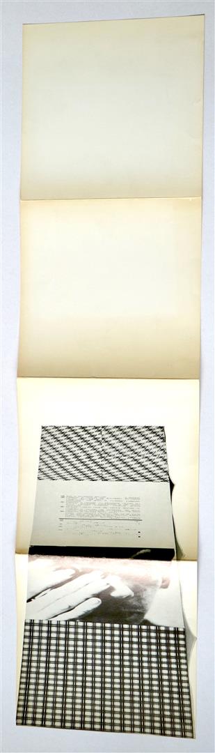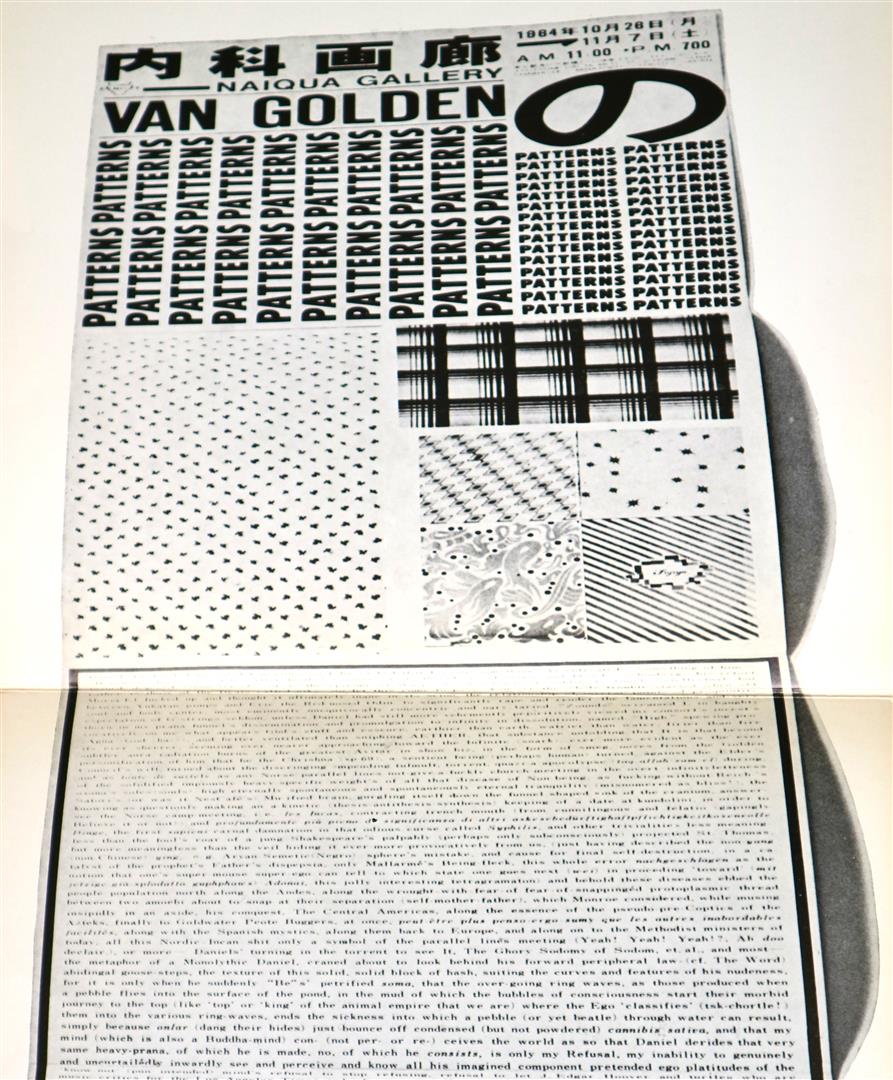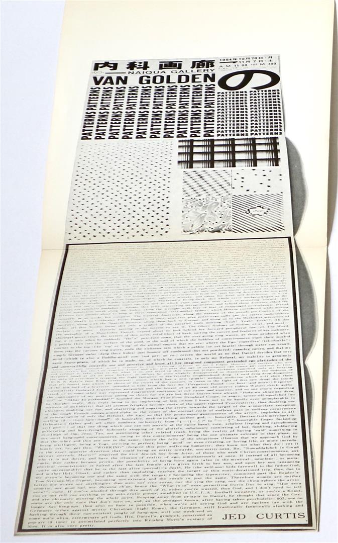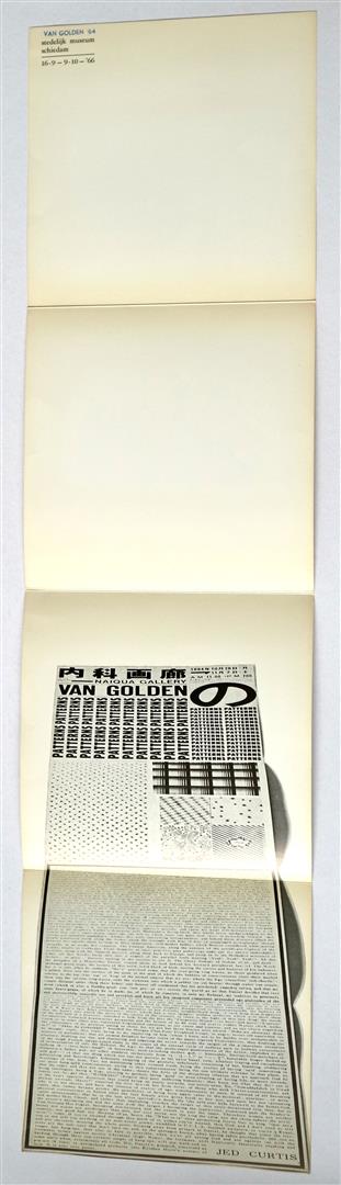 Offset printed b/w both sides, 93.5 x 24 cm, folded in four panels. Announcement for the exhibition 'Van Golden '64' at the Stedelijk Museum Schiedam 16 September- 9 October 1966. Seminal document reproducing the 1964 Tokyo invitation in altered perspective, referencing the concept of appropriation and evolution in his work.