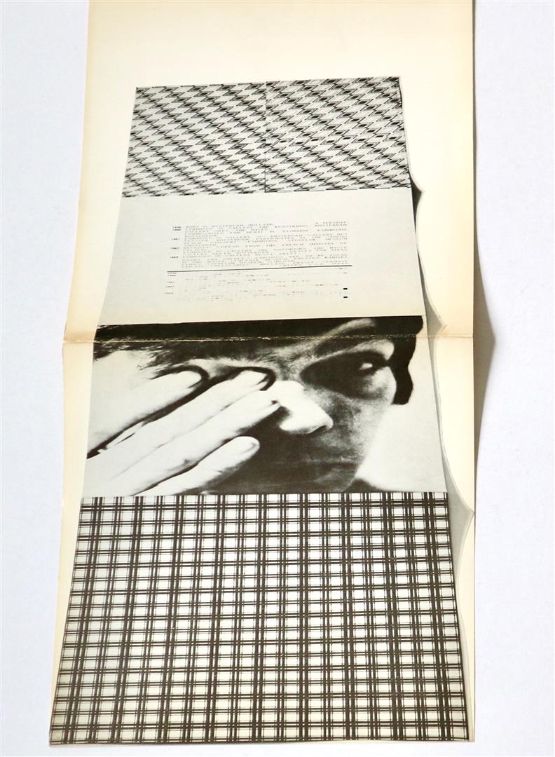 The folder has the same format as the 1964 Tokyo invitation, and depicts a b/w photographic image of the Tokyo brochure shot at an angle from above and pictured as an object receding into space. Recto with basic exhibition information printed in blue and black at upper left, and an image of the front of the Tokyo invitation. Verso with an image of the reverse of theTokyo invitation. Age toning to outer margins, minor rubbing to folds, generally a fine copy. Extremely rare. Ref.: Daan van Golden, Apperception, Wiels/ Roma 2012, p.139; Daan van Golden, Boymans-Van Beuningen retrospective cat. 1982, p. 11; Daan van Golden, The Pencil of Nature 1999, p.30.
