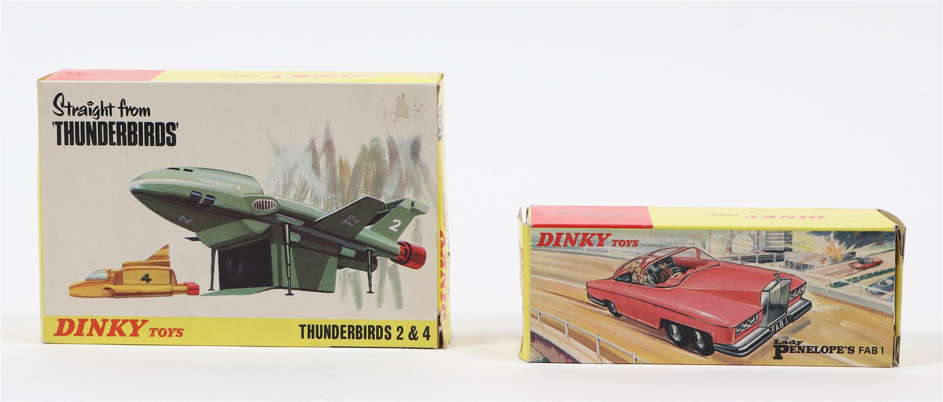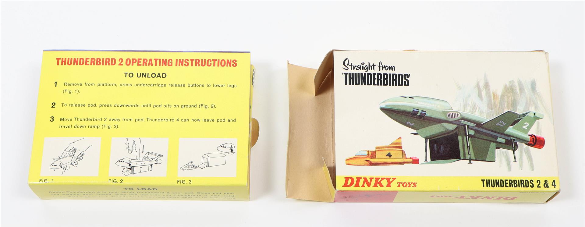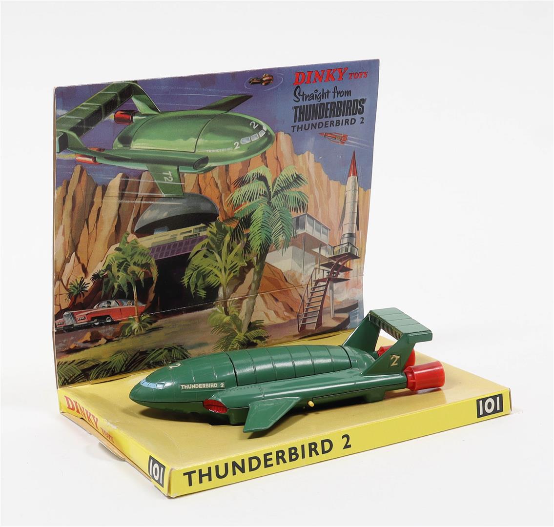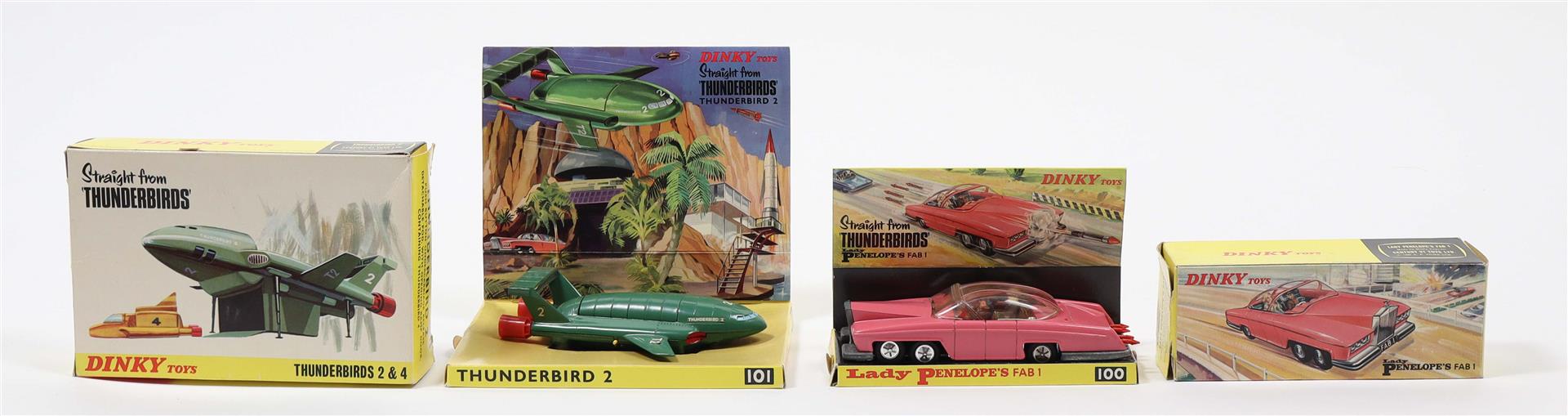 Dinky Toys, ca. 1966. In near mint condition, one lid slightly dam. (removed store sticker and small tear due to opening of the box). Including the all too often missing missiles. With: (2) Thunderbirds 2 & 4. Dinky Toys 101. In original Box. Near mint.