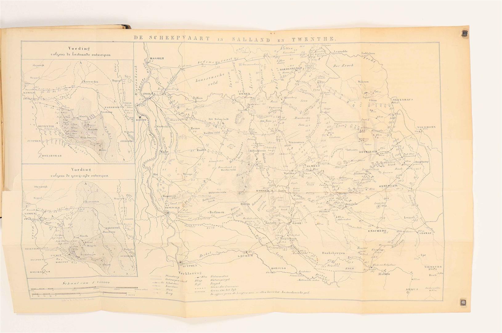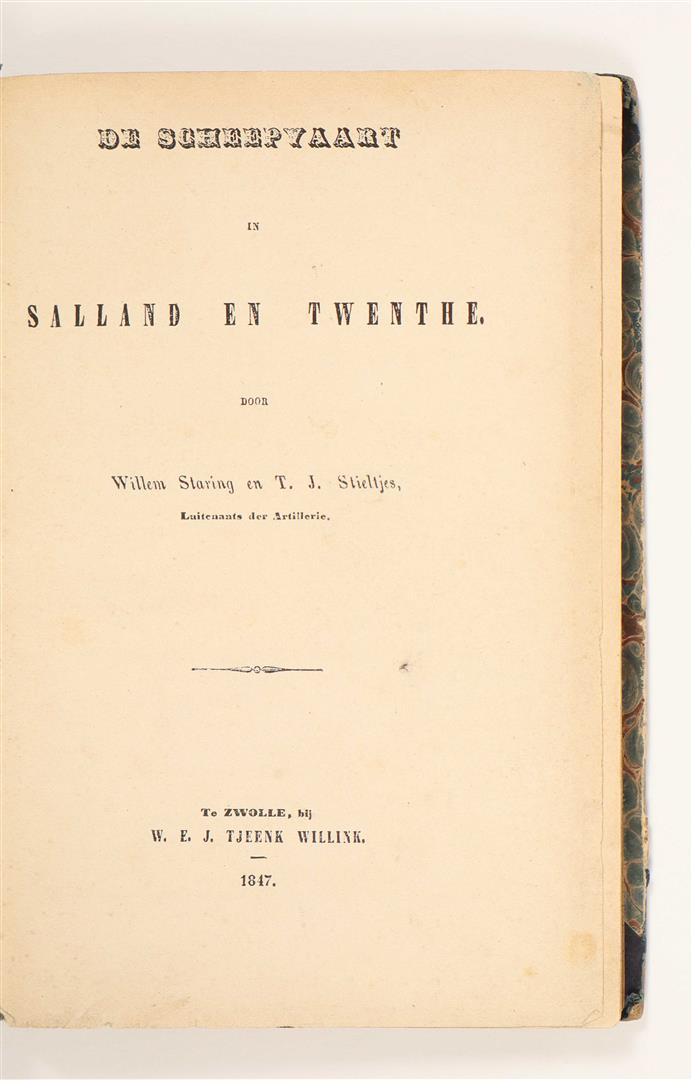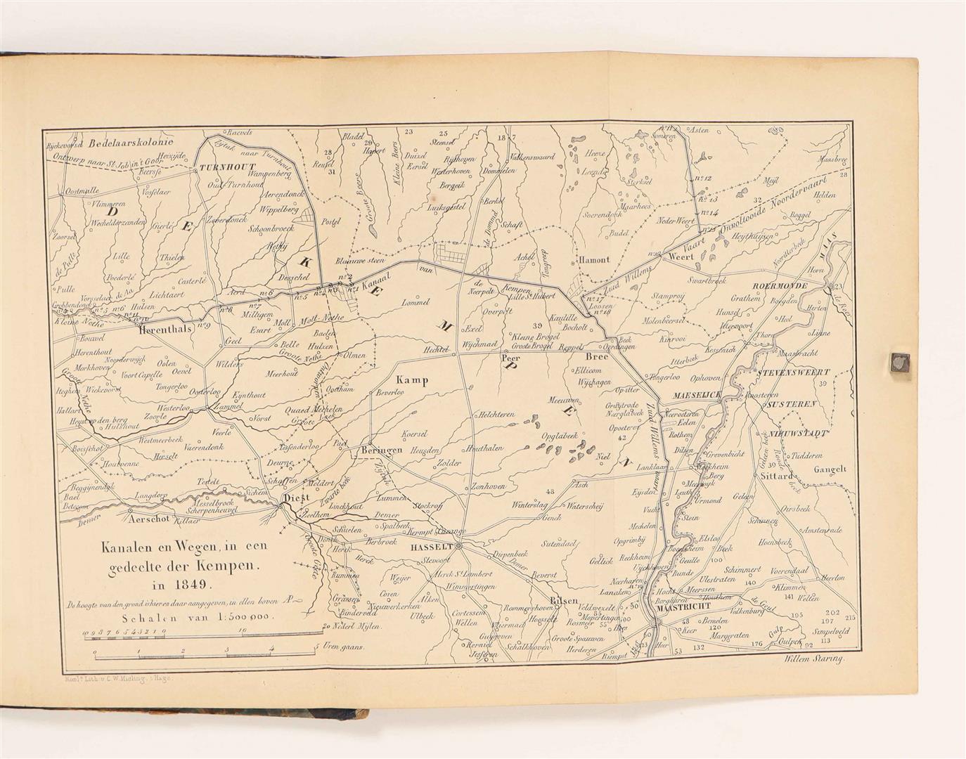 Zwolle, Clement, de Vri en van Stégeren, 1826. (4),28,XVI,283,(5) p., engr. title w. circular view, full p. engraved plate, both by A.L. Zeelander after J. Schoenmaker Doyer, 1 fold. engr. table. Contemp. boards. Binding rubbed, corners bending, hinges sl. splitting, foxing as usual. With (2): Staring, W. and Stieltjes, T.J. De Scheepvaart in Salland en Twenthe. Zwolle, W.E.J. Tjeenk Willink, 1847. 3 parts in 1 vol. 57,(1); 41,(4); (4),80,(4) p. w. 2 large fold. lithogr. plates. Bound with: Staring, W. and Stieltjes, T.J., De Rijn-Wezer-Vaart. Zwolle, W.E.J. Tjeenk Willink, 1850. W. a large fold. lithogr. map. And: Advertisement for the 'Tijdschrift voor staathuishoudkunde en statistiek' and 'Haubner's gezondheidsleer der landhuishoudelijke huisdieren'. And: Staring, W. De Belgische Kampen. Arnhem, G.J. Thieme, 1850. W. 2 large fold. lithogr. plates. Contemp. boards. Small 8vo. Binding sl. worn, otherwise in good condition. - and 1 other.