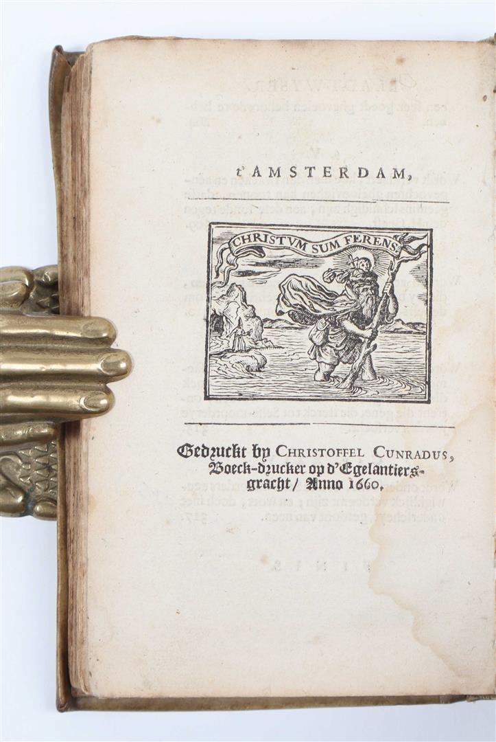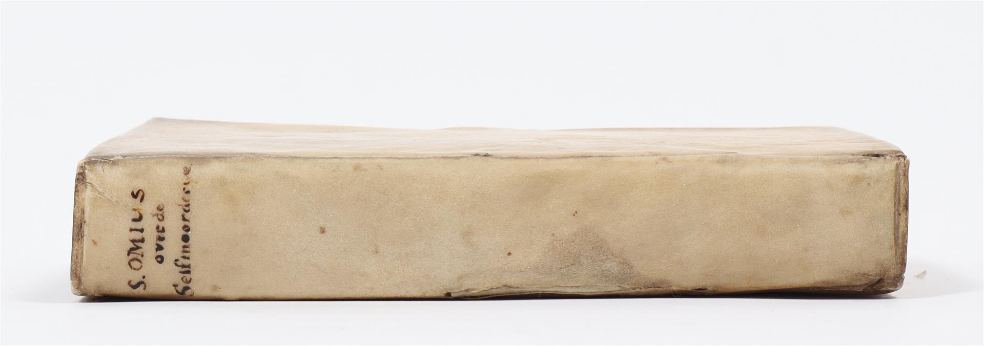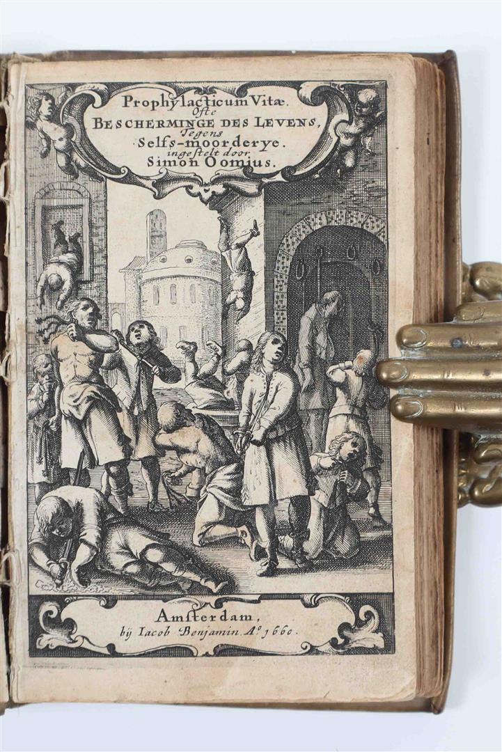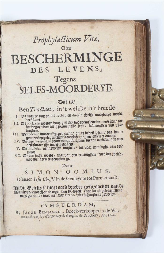 Dat is, Een Tractaet, in 't welcke in 't breede I. De nature van de indirecte, en directe Selfs-moorderye wordt verklaert. II. De oorsaken worden voor-gestelt, door dewelcke de menschen, tot het begaen van dit grouwelijcke feyt, bewooghen zijn gheworden. III. De redenen worden by-gebracht, om te bevestighen, dat het in geenderley gelegentheyt geoorlooft is, hem selven te dooden. IV. De tegenwerpingen beantwoordt worden, die tot verdedinghe van dese sonde, zijn voort-gebracht. V. De middelen aengewesen worden, tot voor-kominghe van dese sonde. VI. Onder-socht wordt, wat van de eeuwighen staet der Selfs-moordenaers te gevoelen zy. Door Simon Oomius. In dit Geschrift wort oock breeder gesproocken van de Wanhope, ende Sonde tegen den H. Geest, ende by die gelegentheyt wort getoont, wat men van Franc. Spira behoorde te gevoelen. Amst., printed by Christoffel Cunradus for Jacob Benjamin, 1660. (16),336,(8) p. W engr. frontisp., woodcut printer's mark at the end, contemp. overlapping vellum, sm. 8vo. Num. old. marg. annots. in pen in the 2nd half, minor other imperfections. A very good copy of a very rare work.