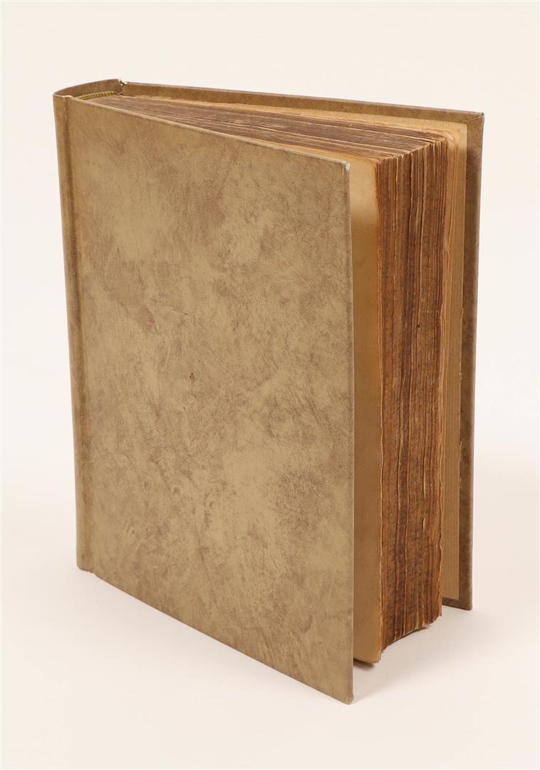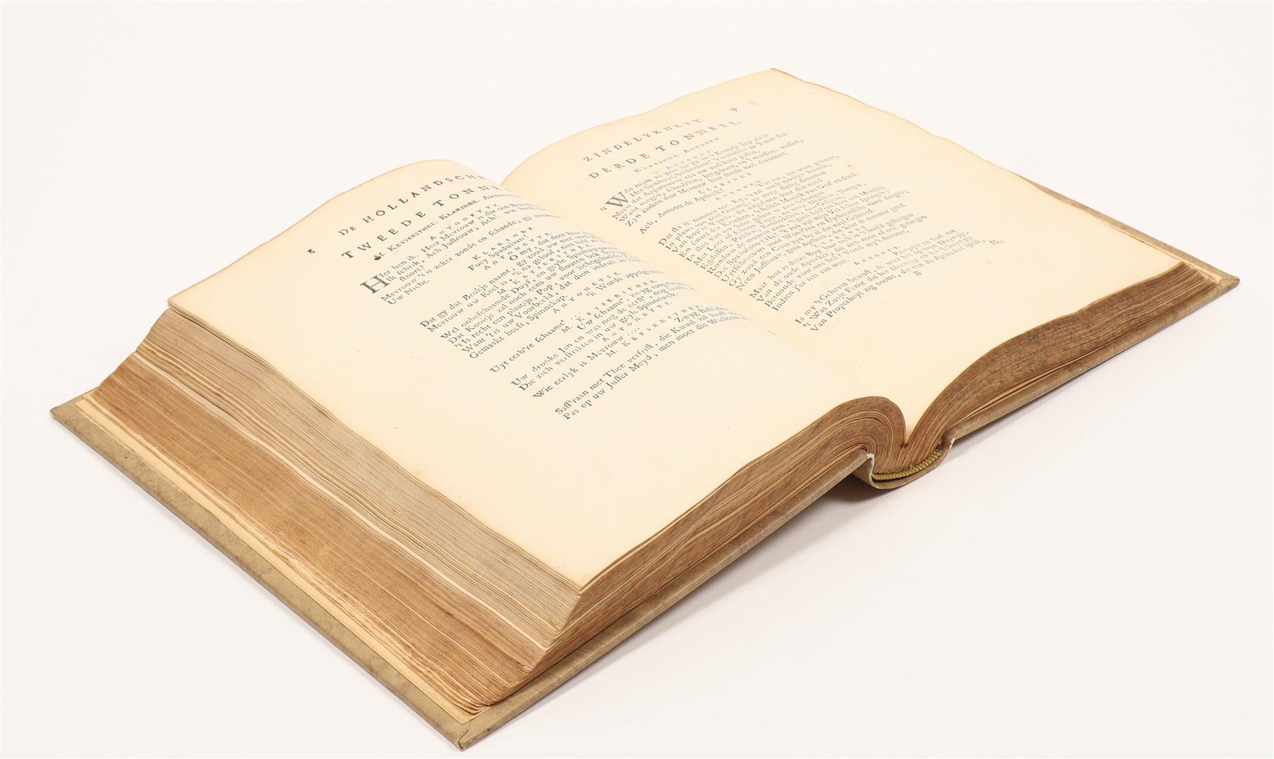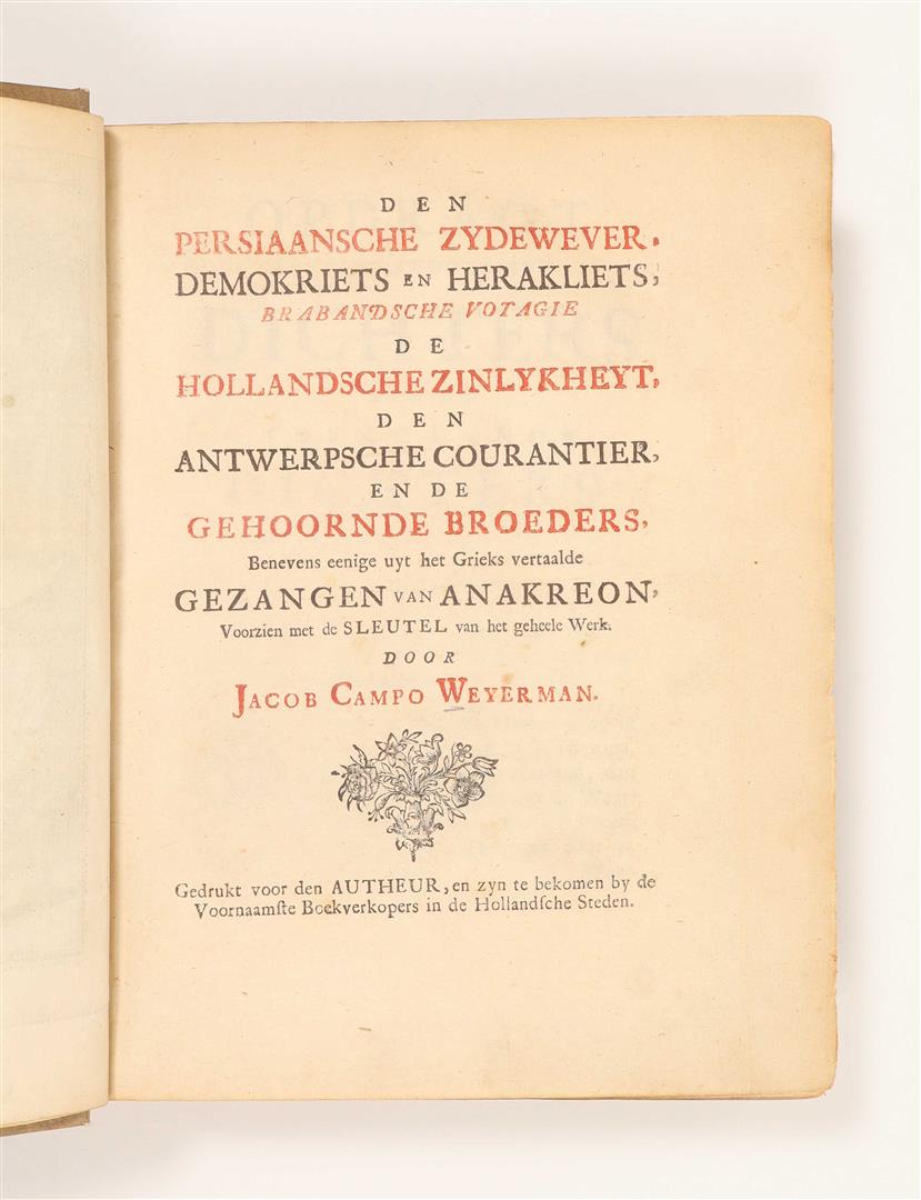 Demokriets en Herakliets, Brabandsche voyagie, de Hollandsche zinlykheyt, den Antwerpsche courantier, en de gehoornde broeders, benevens eenige uyt het Grieks vertaalde gezangen van Anakreon, voorzien met de sleutel van het geheele werk. No pl., no publ., ('Gedrukt voor den autheur, en zyn te bekomen by de voornaamste boekverkopers in de Hollandsche steden'), n.d. (1727). 5 parts in 1 vol. (16),140; (8),108; 100; 96; 104., title p. printed in red and black, engr. frontispiece, num. woodcut tailpieces, modern binding. 4to.