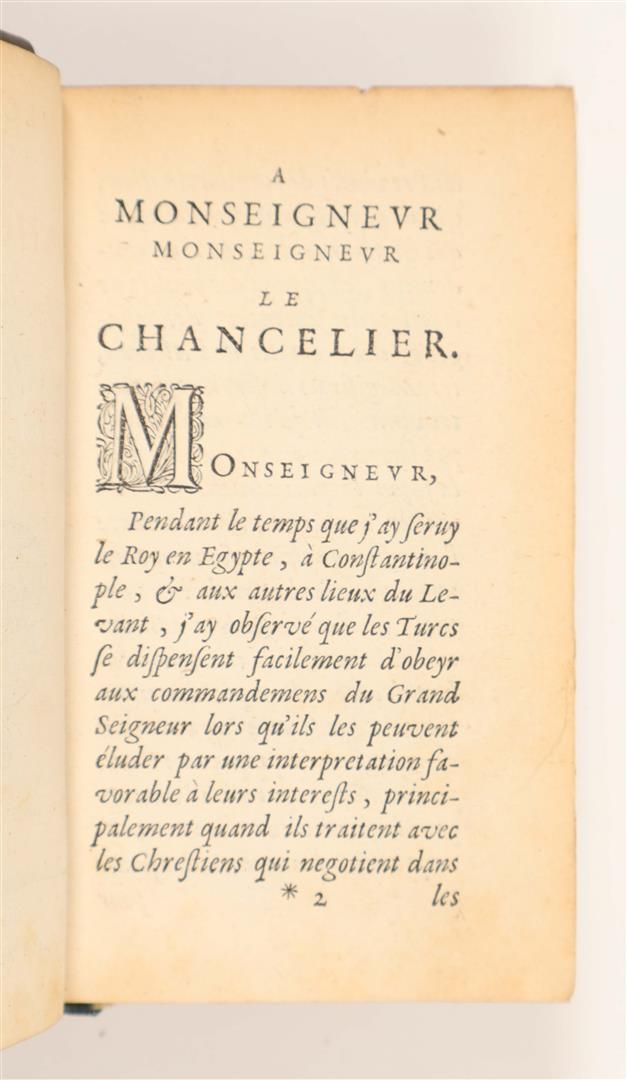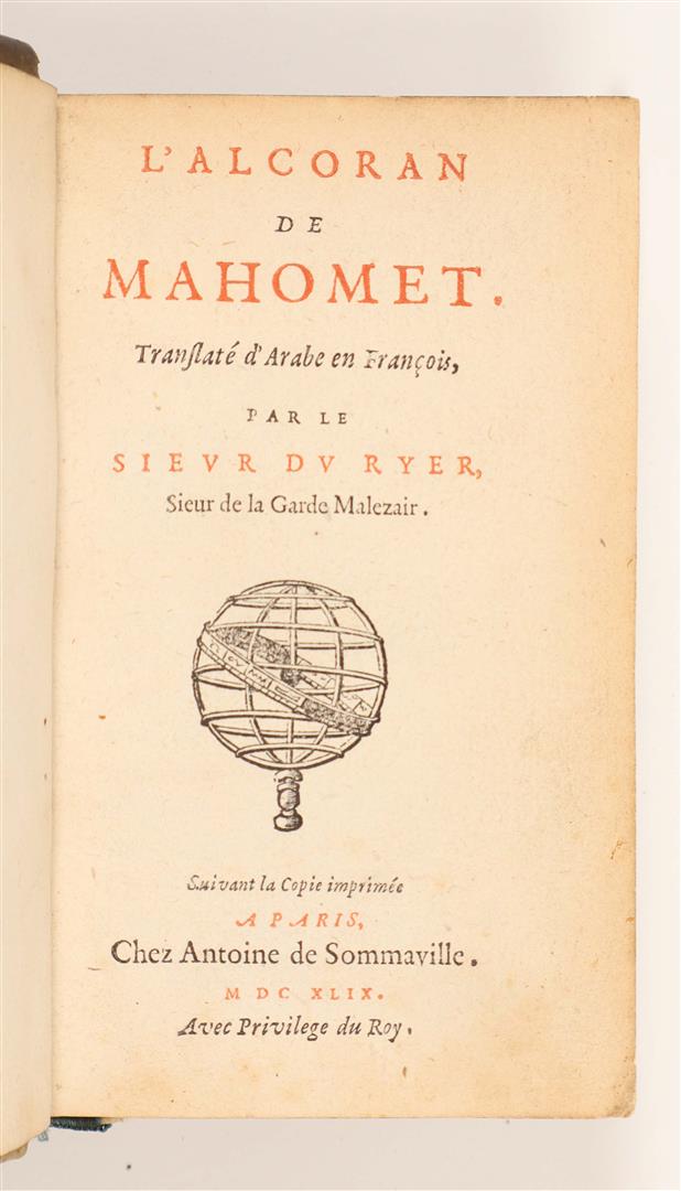 Pastedowns loose, ex libris to first pastedown, else fine. First Elzevier edition of one of the most important 17th-cent. Quran translation - the first vernacular version made directly from the Arabic. This is the first issue, with the two dedication leaves to Séguier which were suppressed in later copies.
