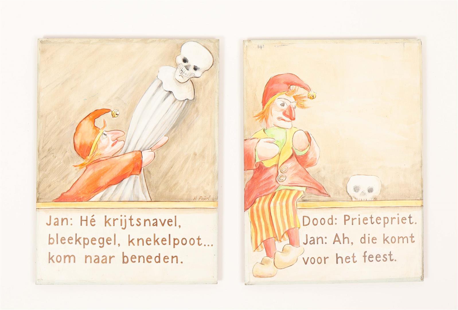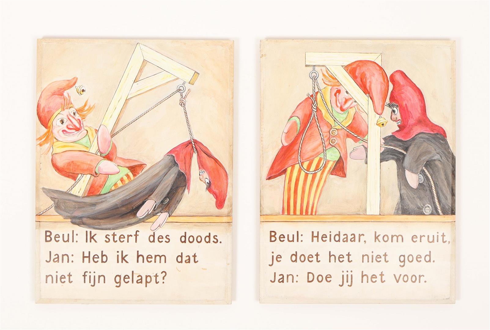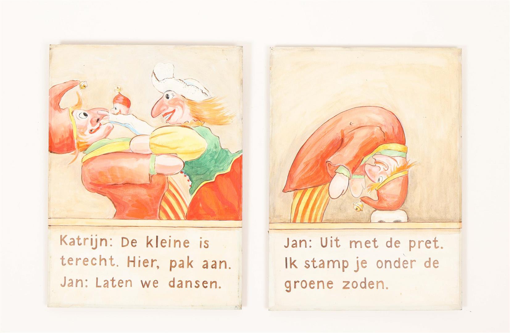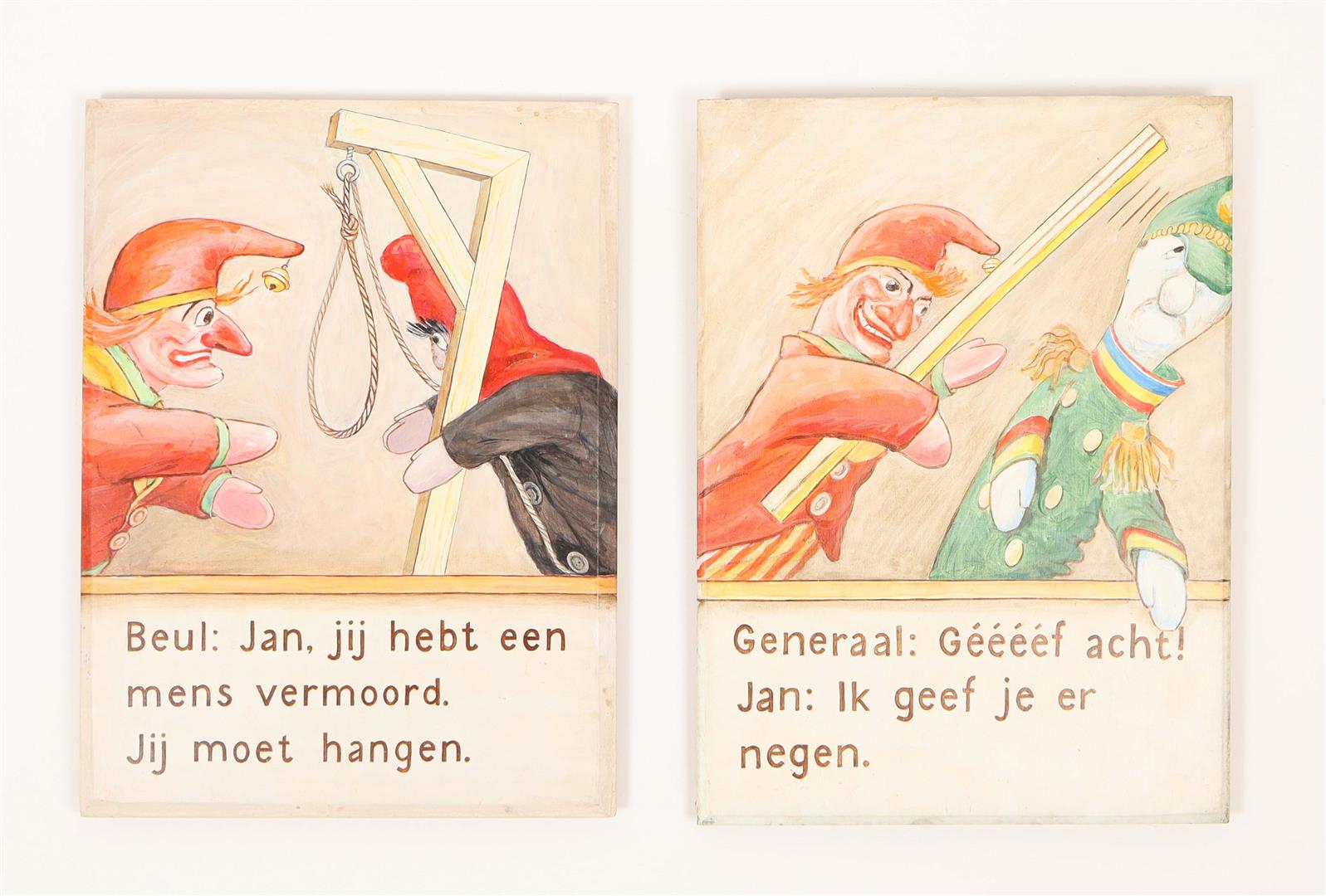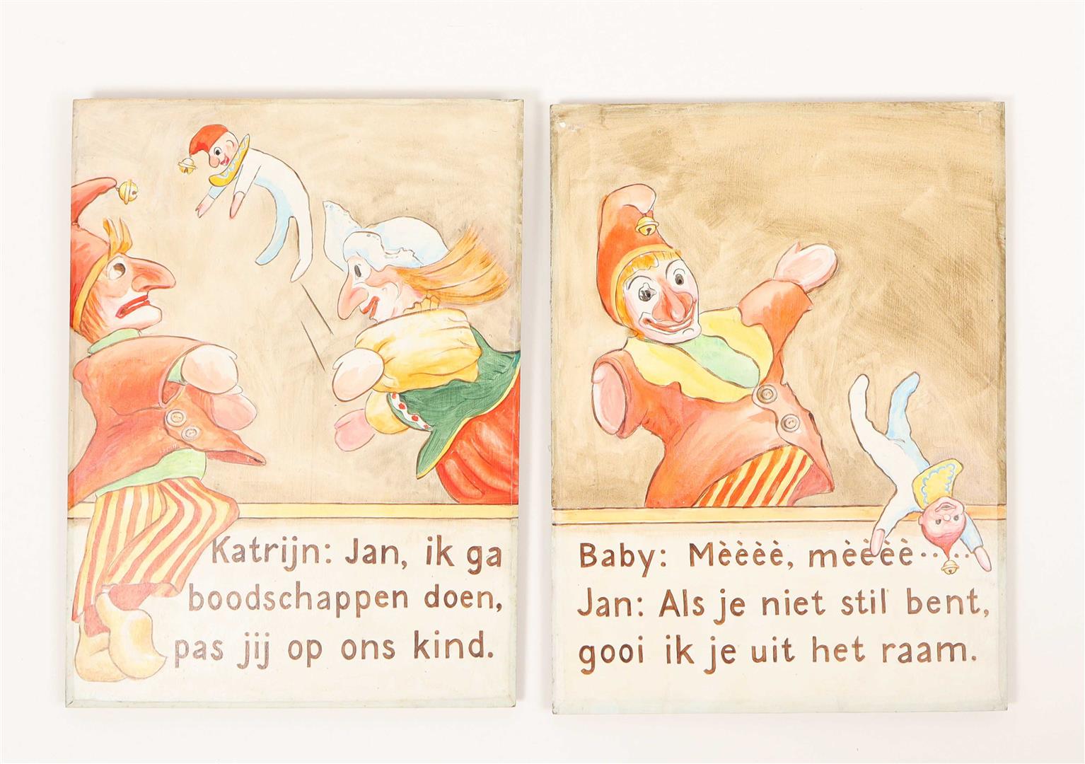 Twelve tableaux on Jan Klaasssen , painted on wooden panels by puppeteer Hetty Paërl. Each 39 x 29 cm. Signed, dated on verso 'Amsterdam, 1997' Wooden presentation strip mounted on most signatures verso side.