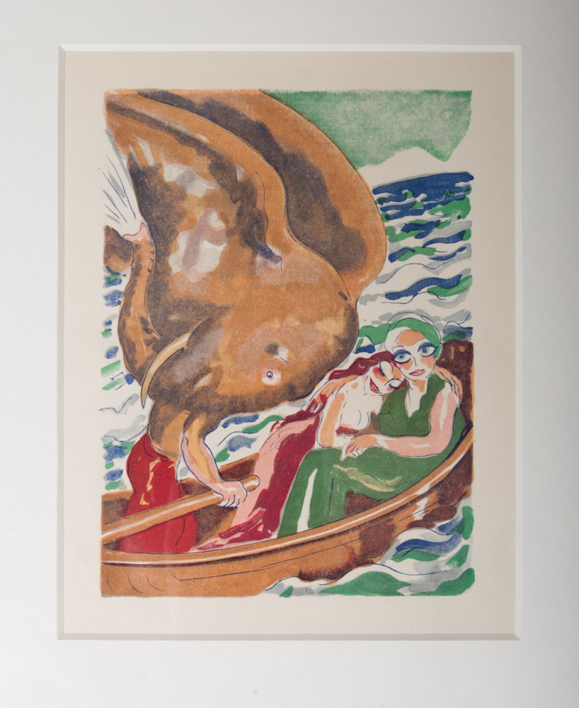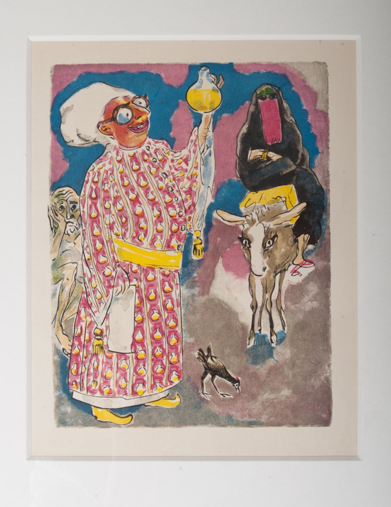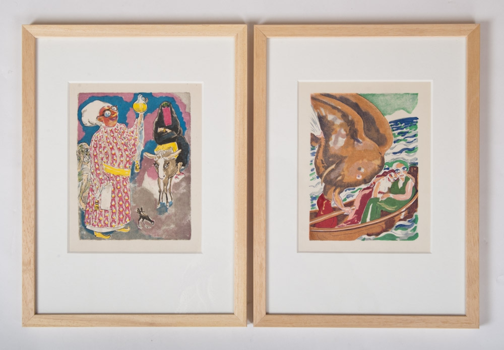 Two woodcuts, Livre de Mille Nuits, 1955. Les Le Nautonier a oreilles d'éléphant. 15 x 20 cm. - and Le Médecin Persan, 15 x 20 cm. Both framed under glass.
