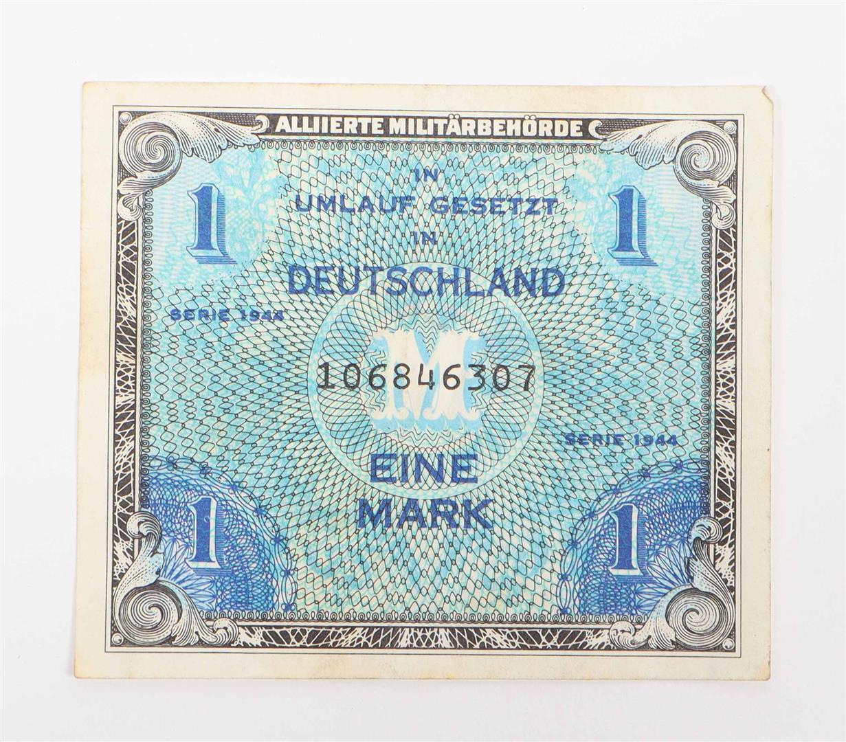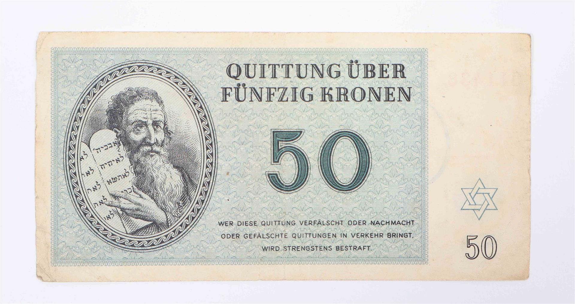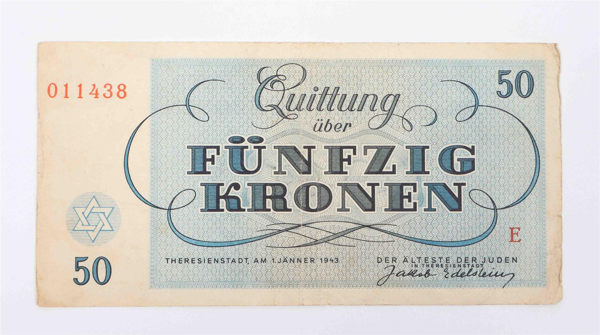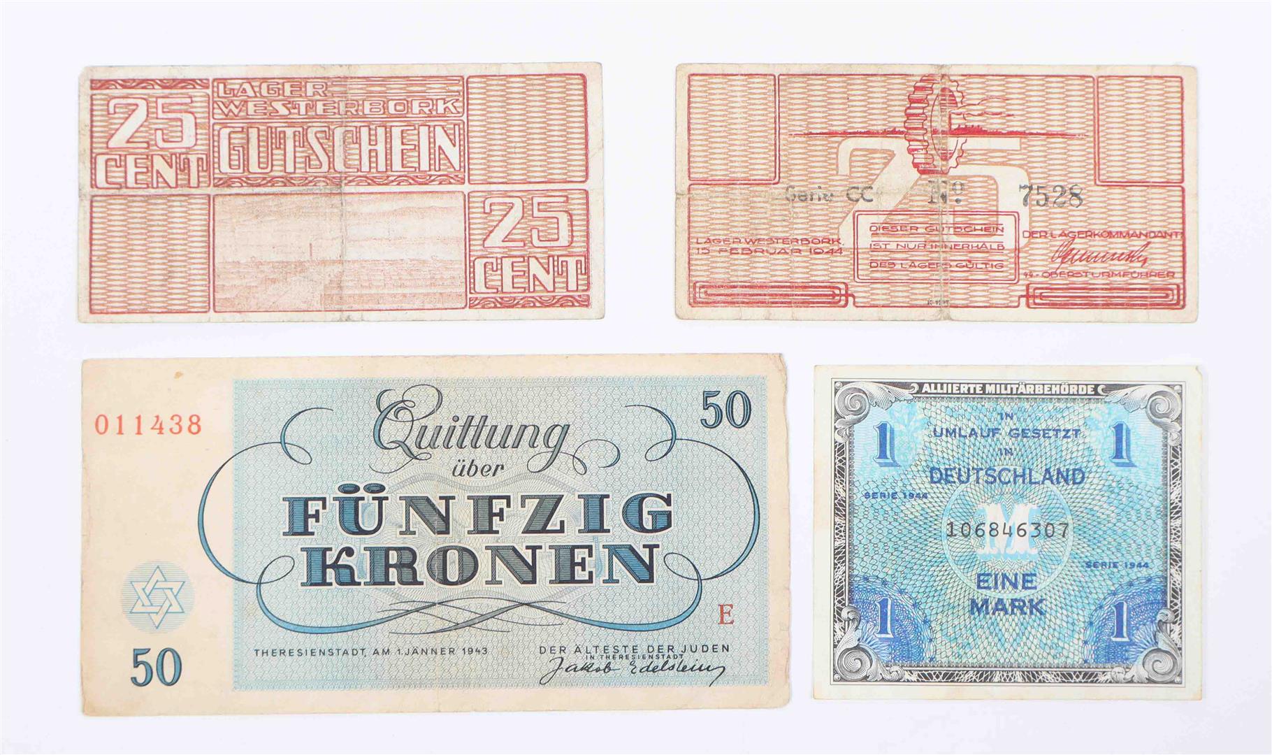 1944 Series AA and CC. Both sl. dam. With: (2) Quittung über Fünfzig Kronen. Theresiënstadt, 1943. (3) Alliierte Militärbehörde. Eine Mark. Issued in Germany, Series 1944.