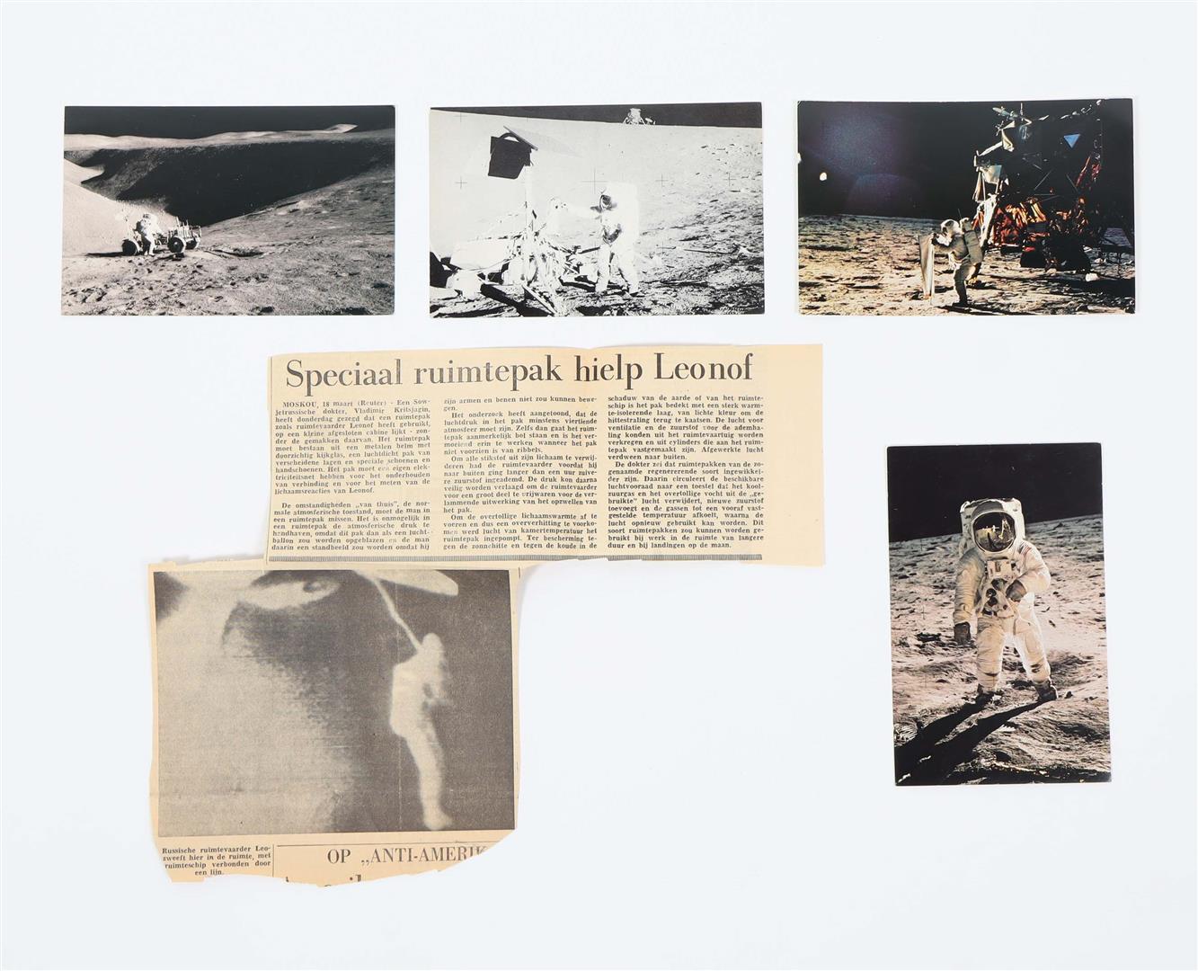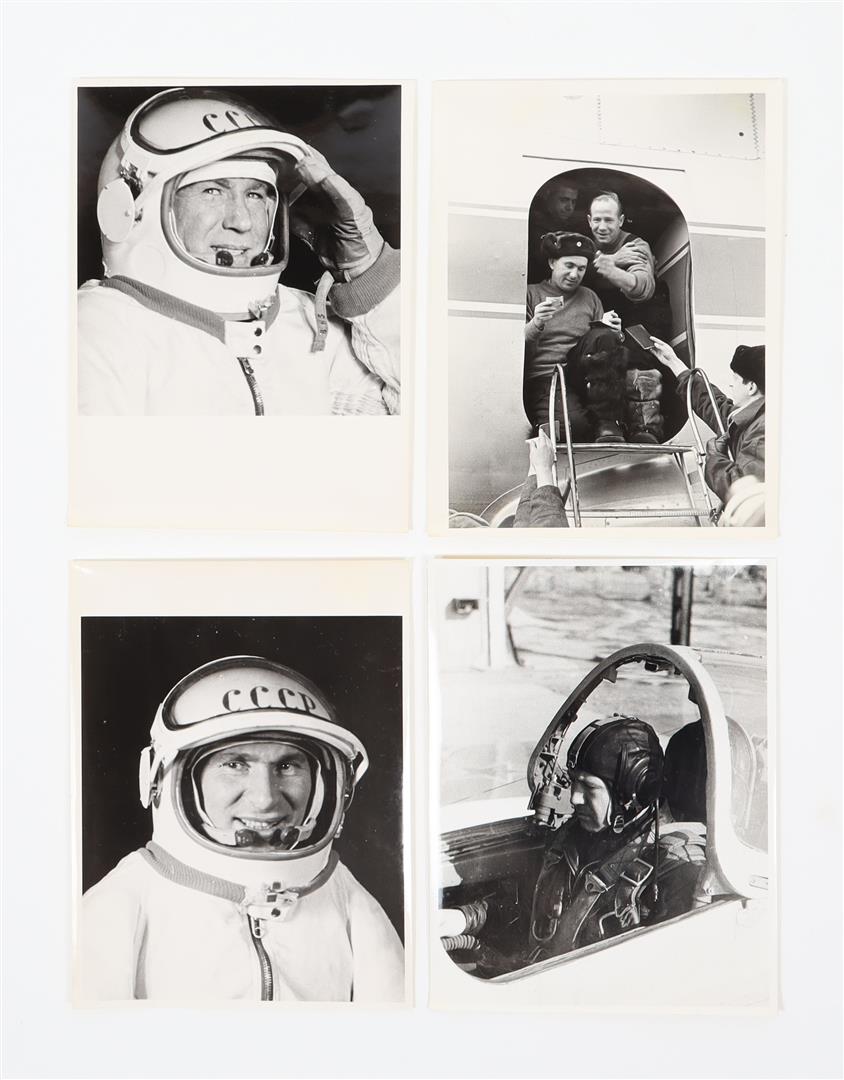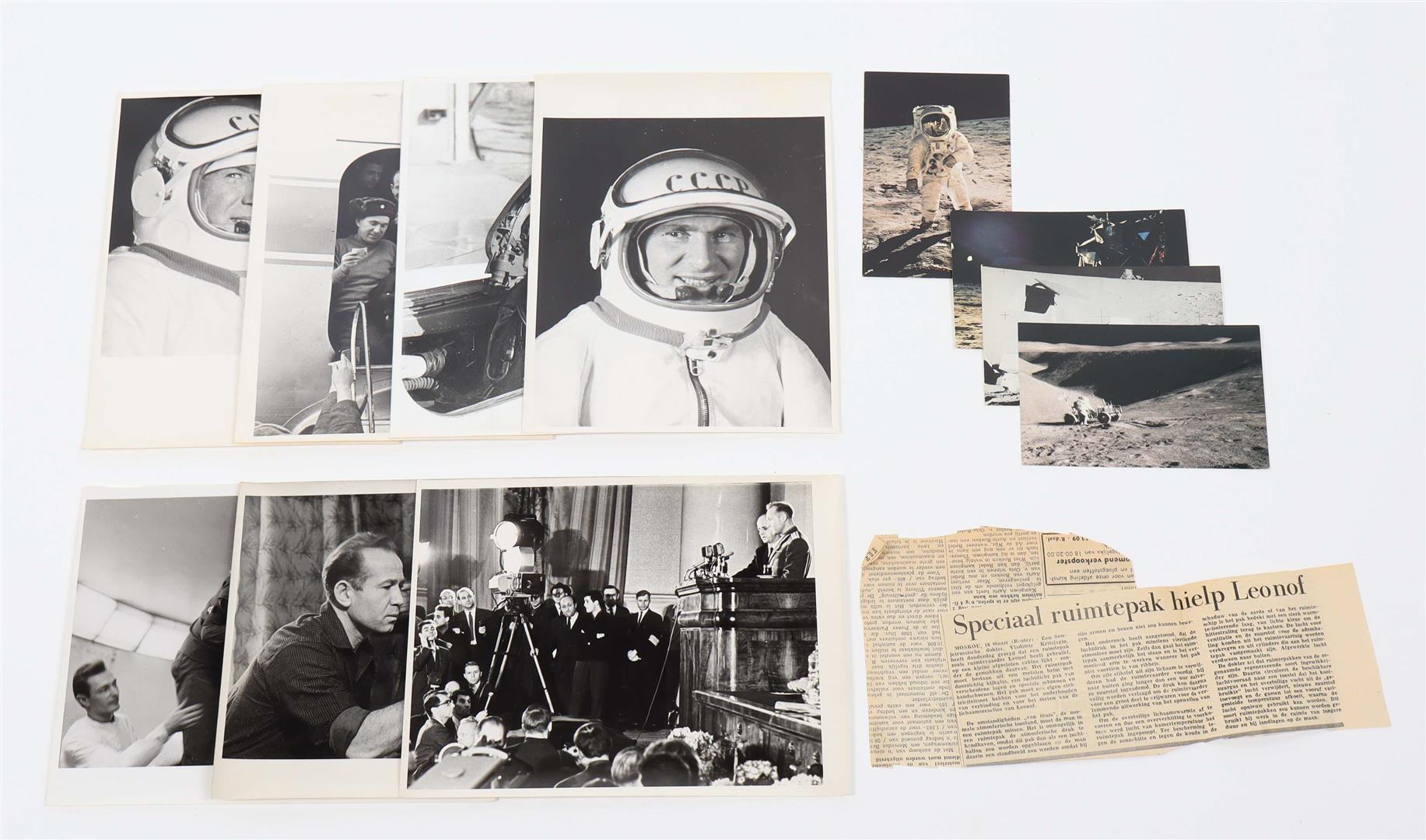 Lot of seven vintage gelatine silver prints, 1965. Each 23.5 x 18 cm, text strip in Russian on verso. Including photos of Pavel Belyayev and Alexei Lechov working on the Voskhod 2 Mission, a press conference for the space program in Moscow, 1965. With: a news paper clipping on Leonov and 4 colour picture postcards of the American moon landing.