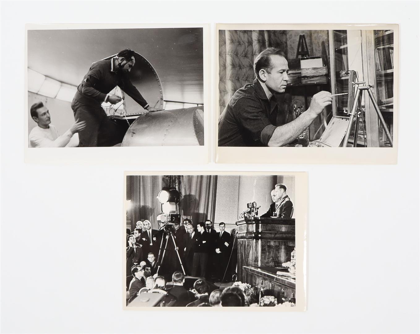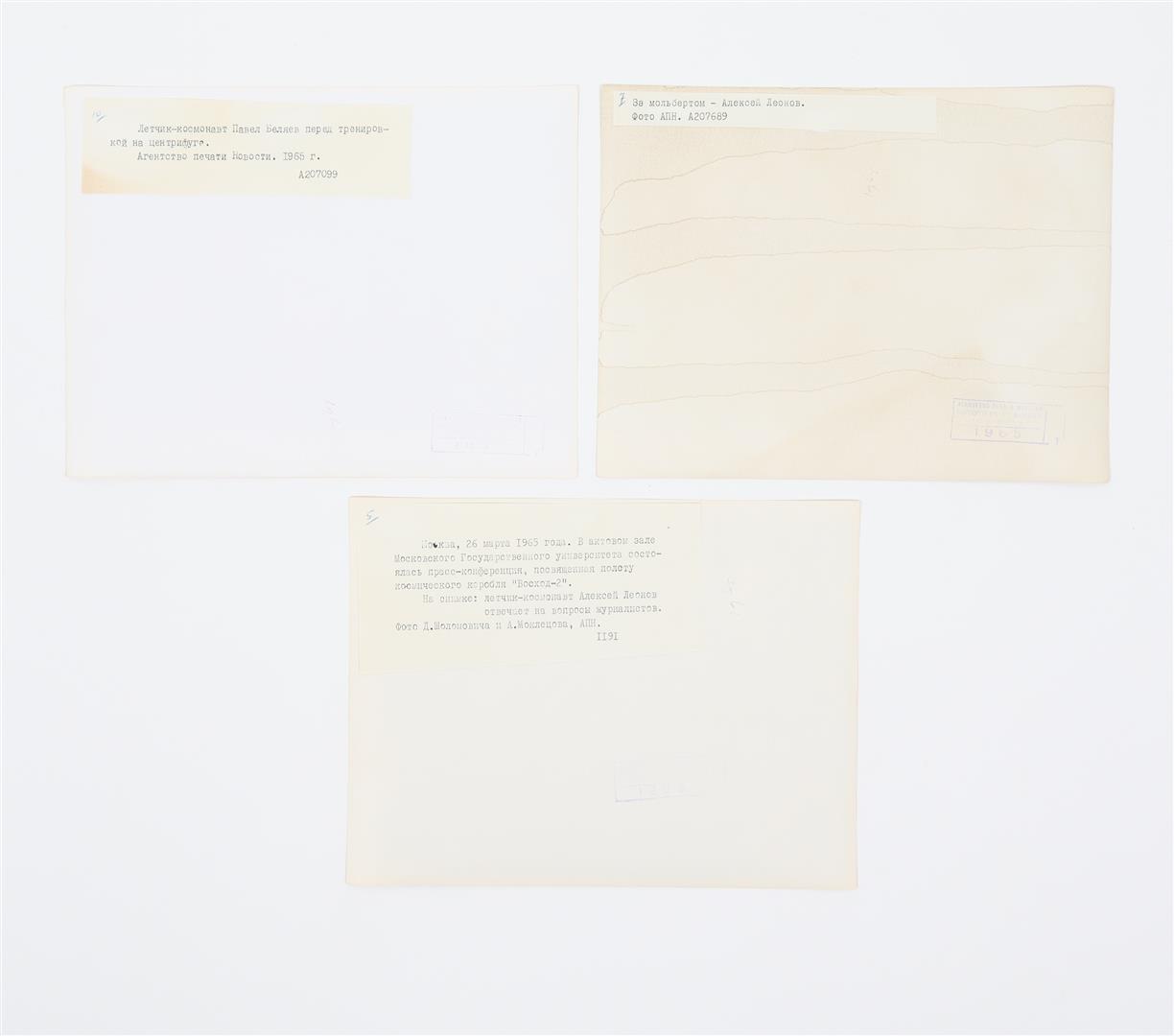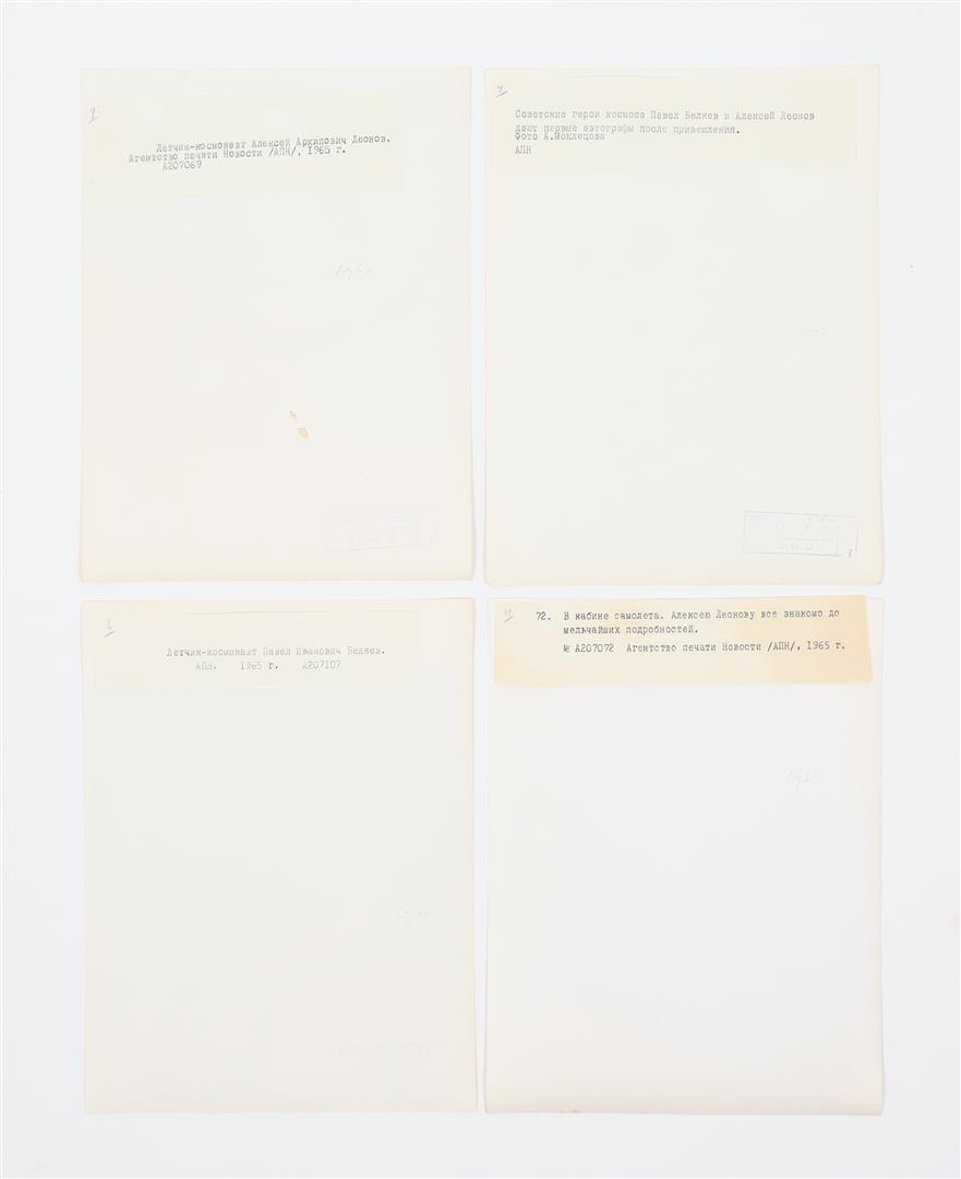 Lot of seven vintage gelatine silver prints, 1965. Each 23.5 x 18 cm, text strip in Russian on verso. Including photos of Pavel Belyayev and Alexei Lechov working on the Voskhod 2 Mission, a press conference for the space program in Moscow, 1965. With: a news paper clipping on Leonov and 4 colour picture postcards of the American moon landing.