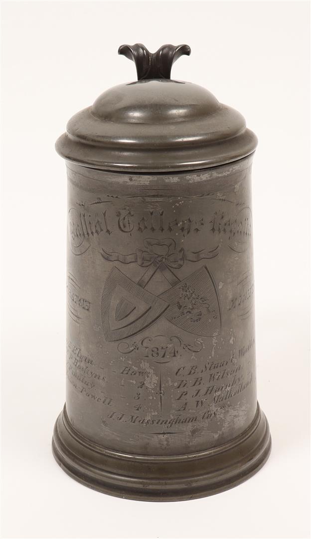 Commemorative pewter thankards with glass bases, awarded as prizes for the 'Scratch Eights' rowing competitions. Height 20.5 cm, Ø 12 cm. Each engraved with details of the respective college regatta crew.