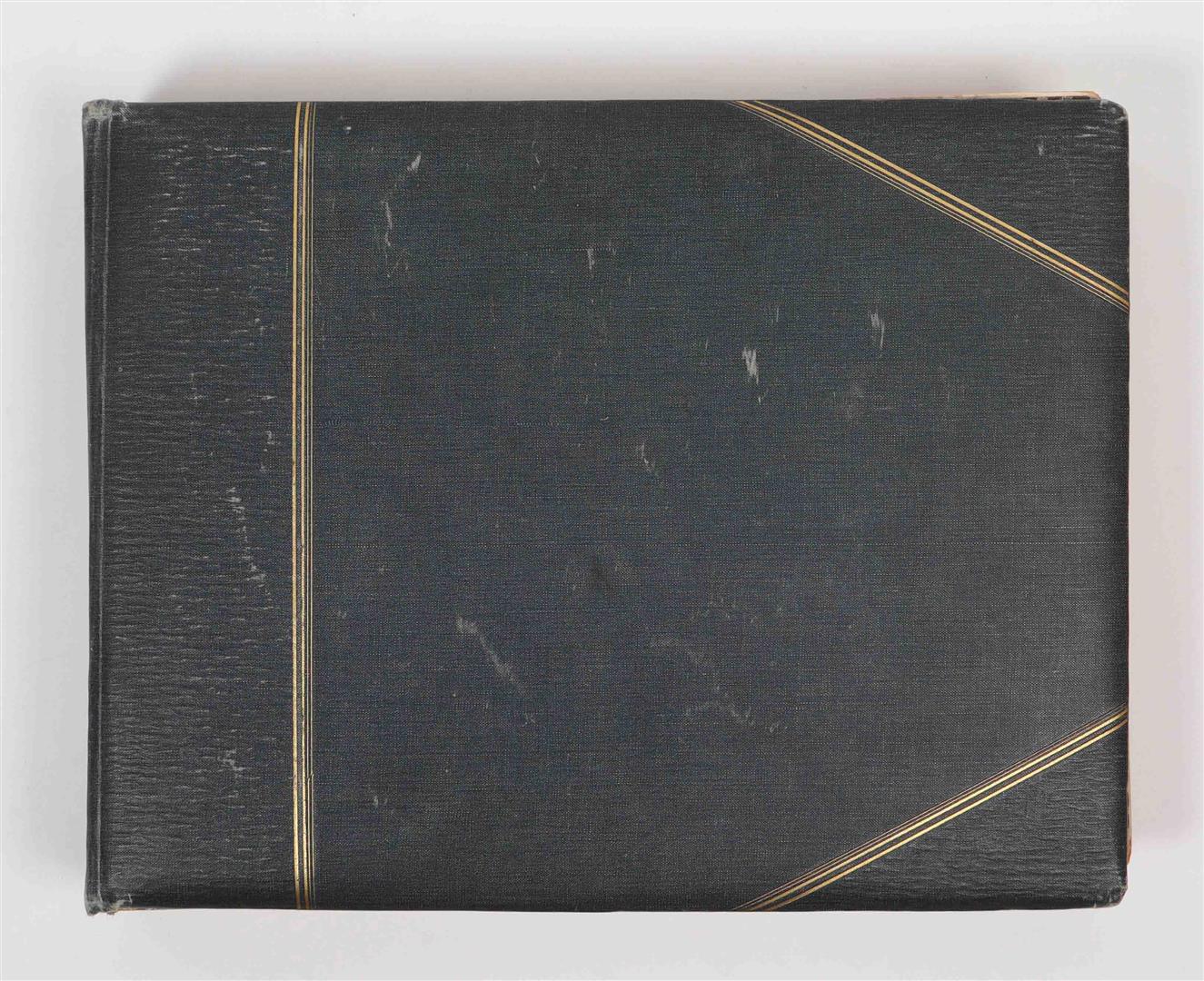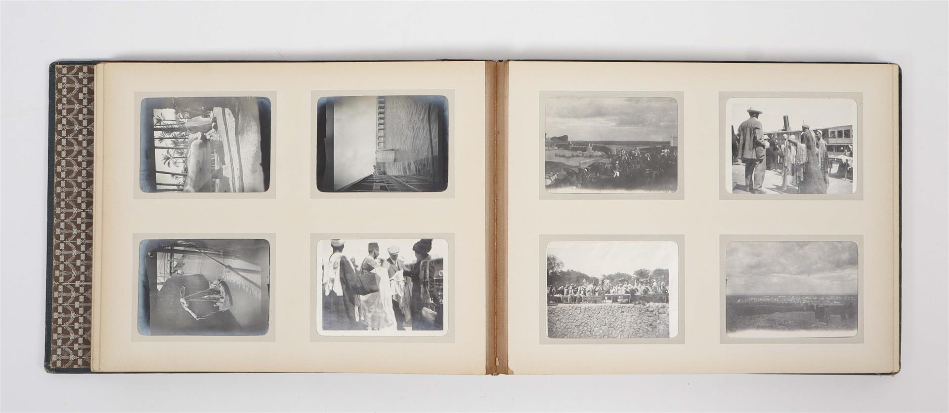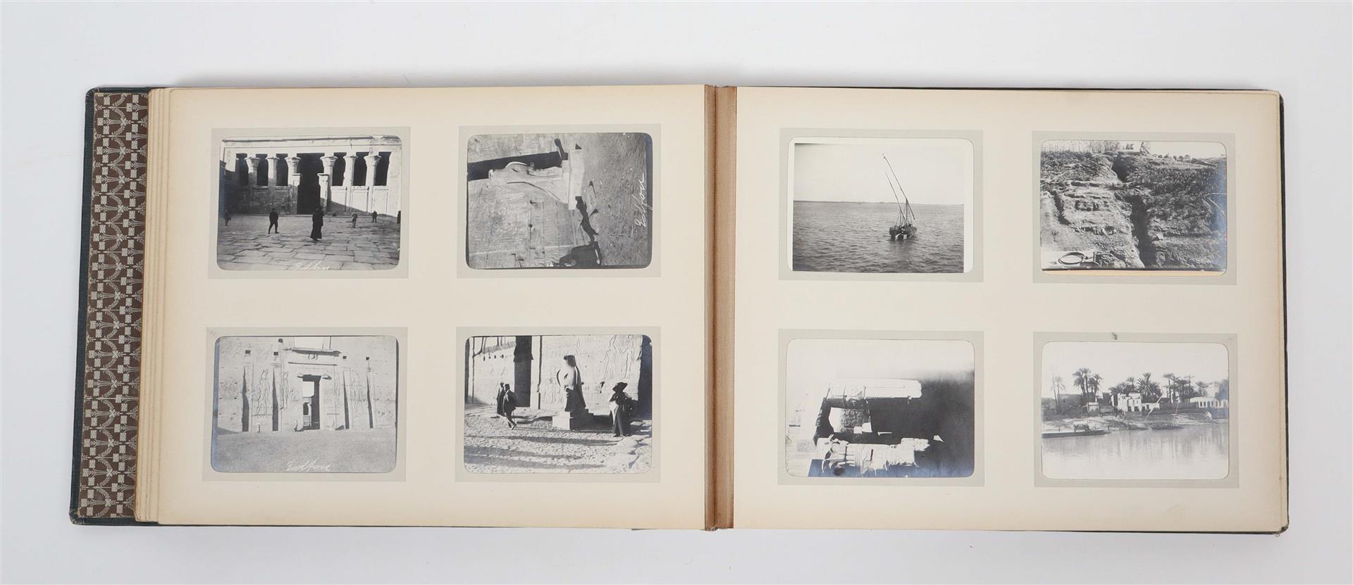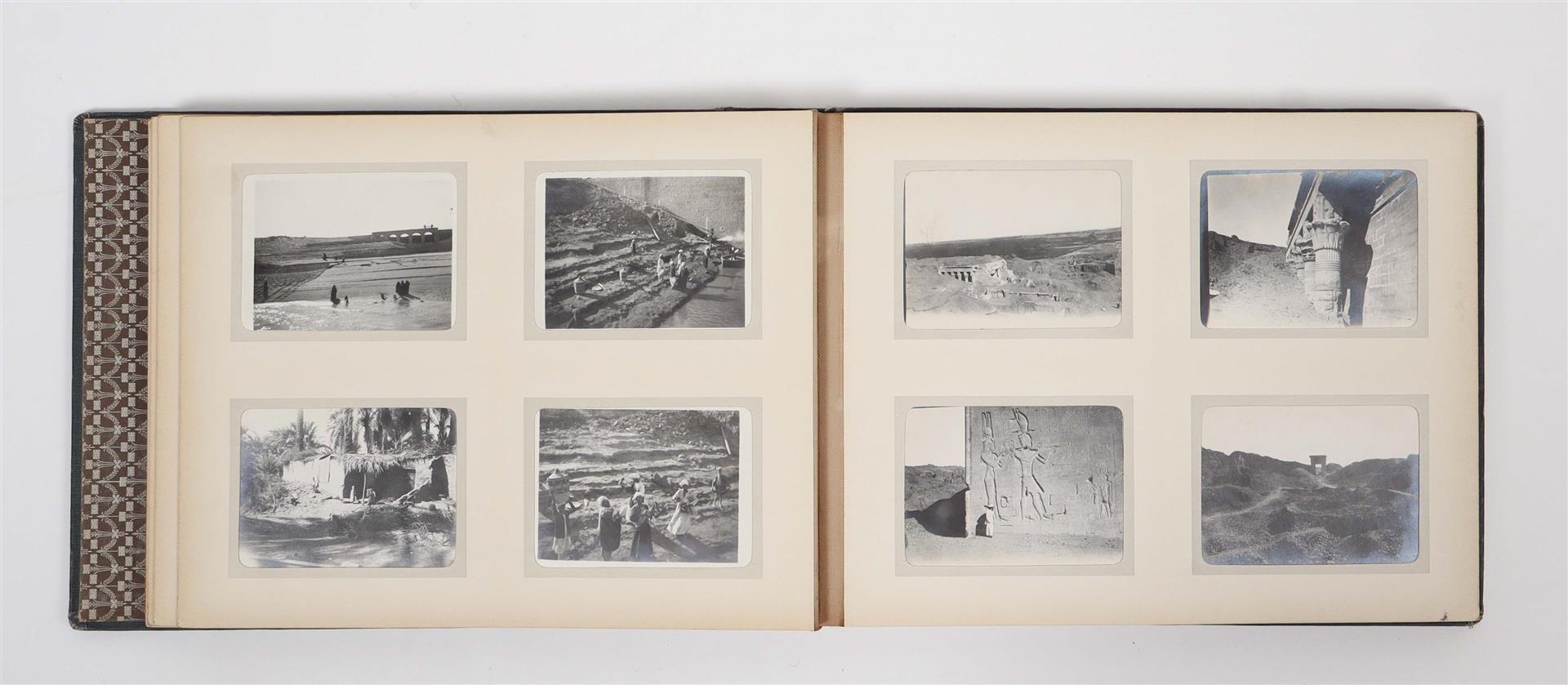 With 180 inserted photos of a trip (partly by boat) to Egypt by a European family, including views of temples (partly uncovered), other archeological sites, local inhabitants in villages, etc. Each photograph 8 x 11 cm. Front cover detached from bookblock.