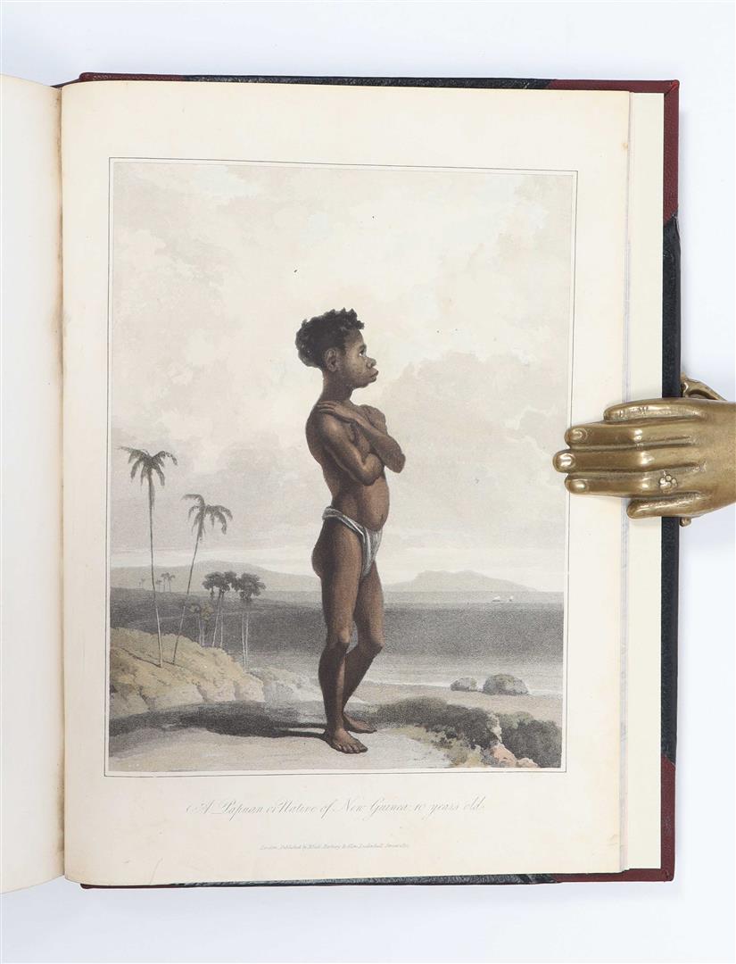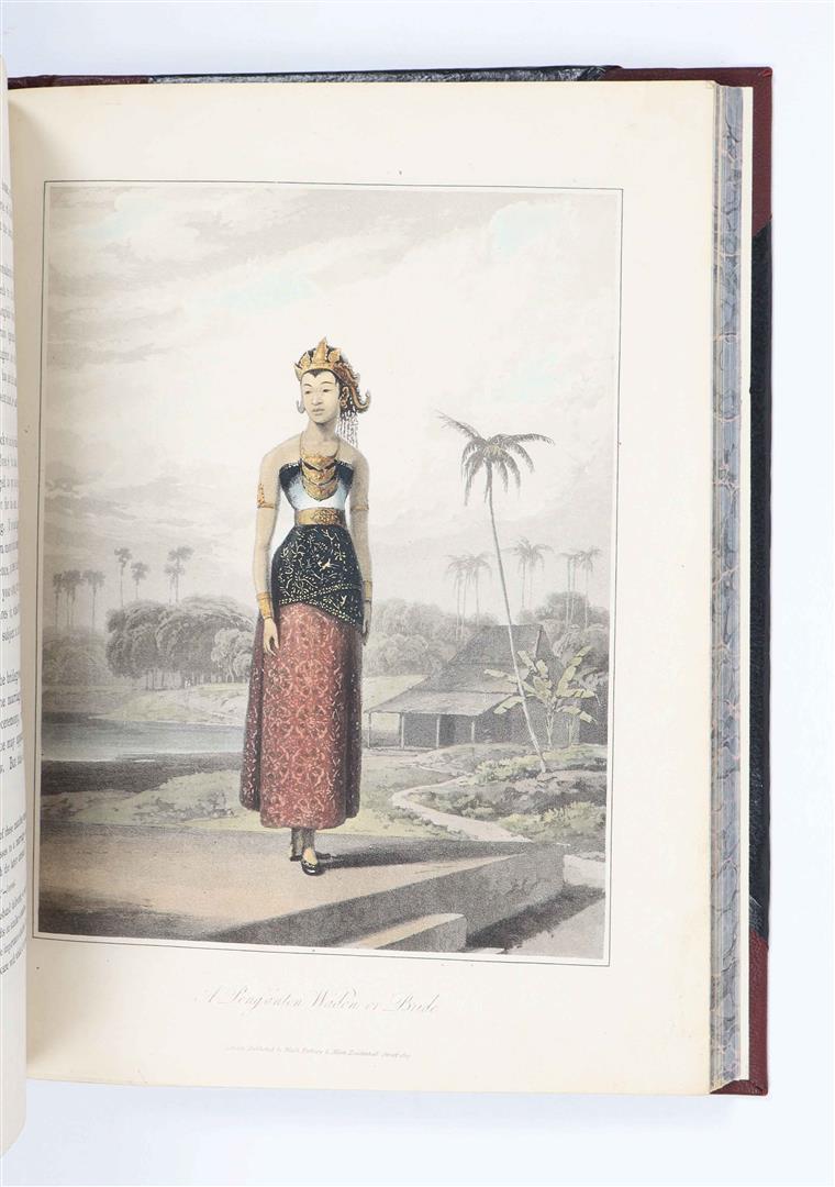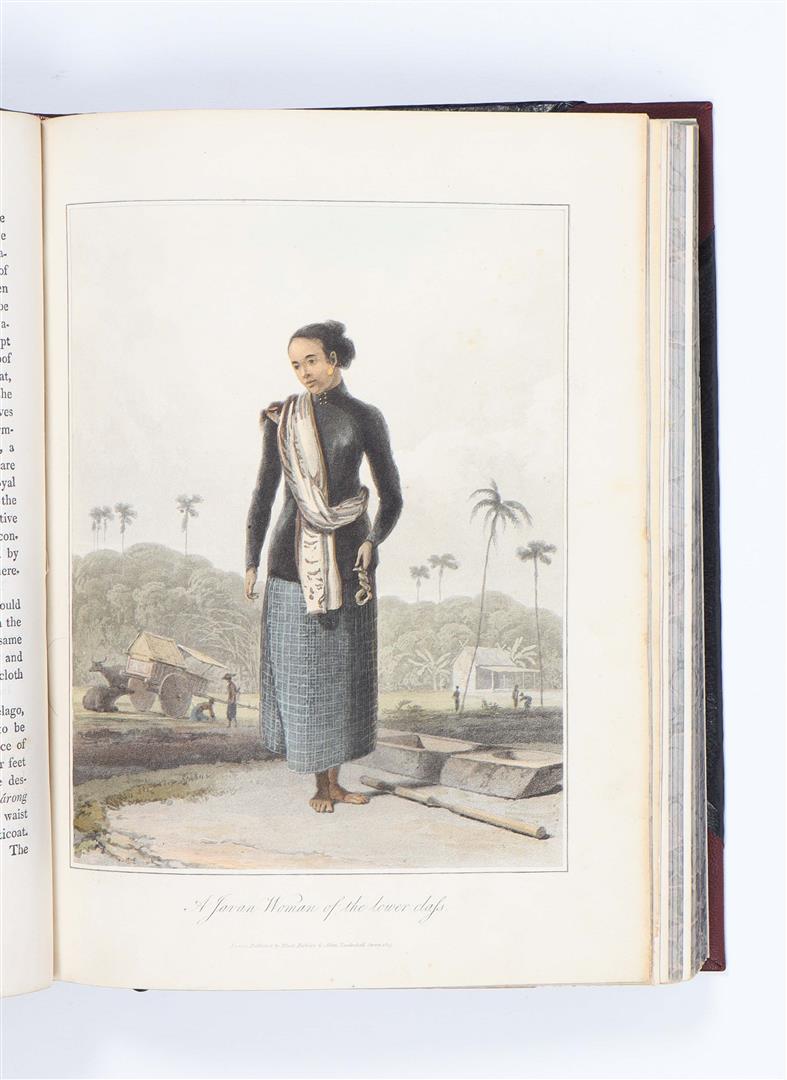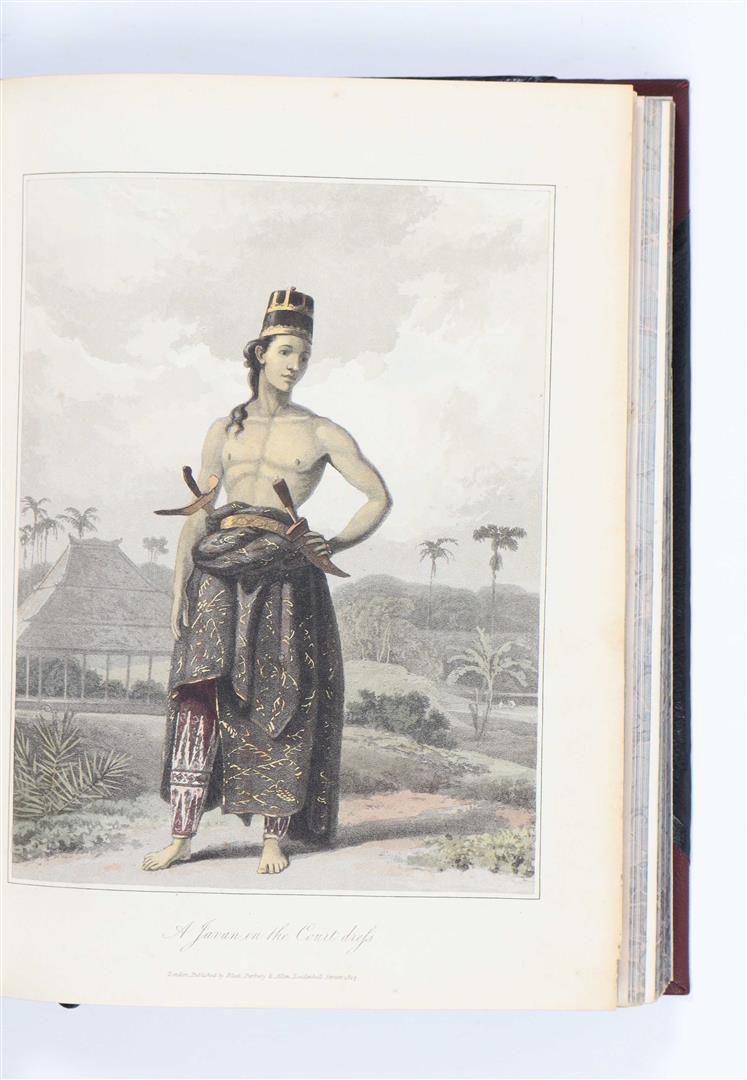 London, Black, Parbury and Allen ("Booksellers to the Hon. East-India Company"), 1817. 1st ed., 2 vols., XLVIII,479; VIII,288,(4),CCLX,(1 advert.) p. Nine handcol. aquatint costume plates, one handcol. plate of a Papuan boy and 55 monochrome (line/ softground) etched plates, engr. vignettes, fold. tables, modern half leather, 4to.