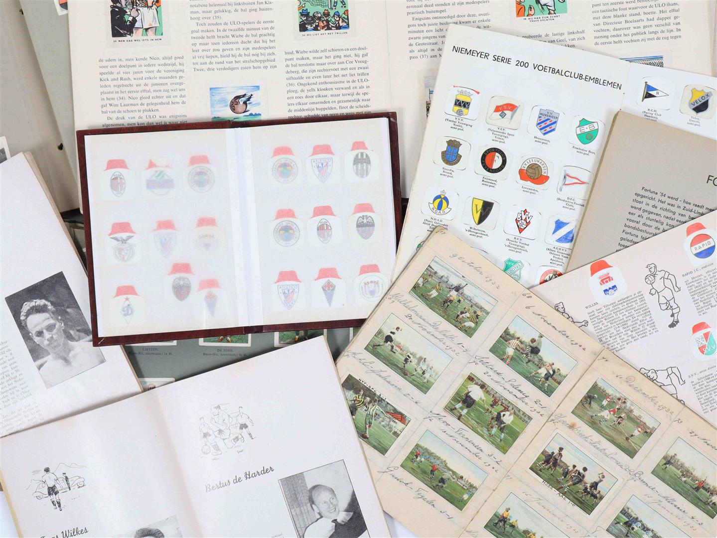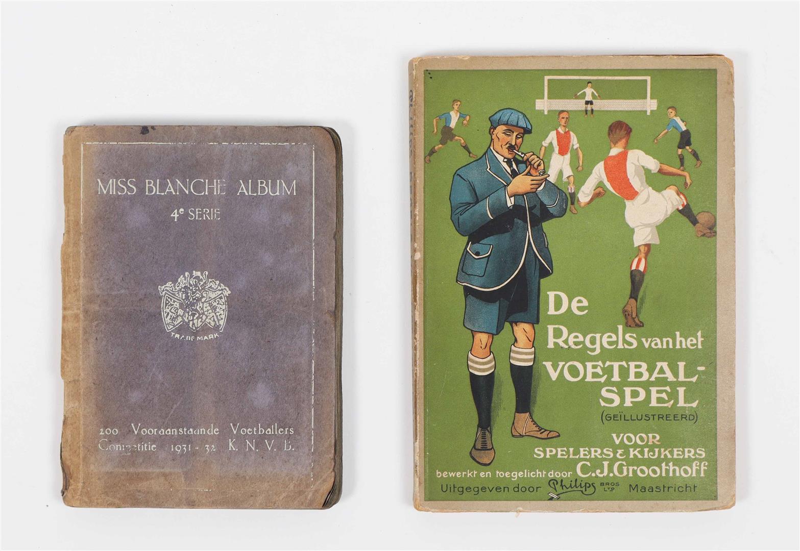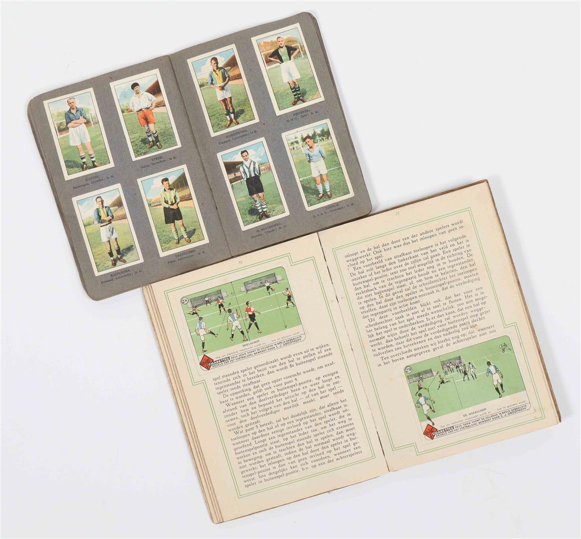 Spelfoto's. Vittoria Egyptian Cigarette Company, 1932. Folio album, hcl. Complete. Name of first and second owner on pastedown. (2) C.J. Groothoff. De Regels van het Voetbalspel voor Spelers & Kijkers. Philips Cigarettes, Maastricht, 1924. Complete. (3) Miss Blanche Album 4e serie. 200 Vooraanstaande Voetballers Competitie 1931-32 K.N.V.B. Complete -and 13 others incl. two albums with mounted soccer cards (Monty etc.)
