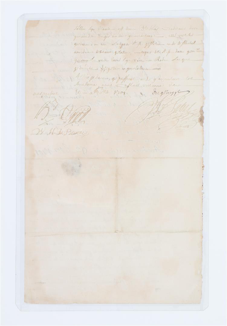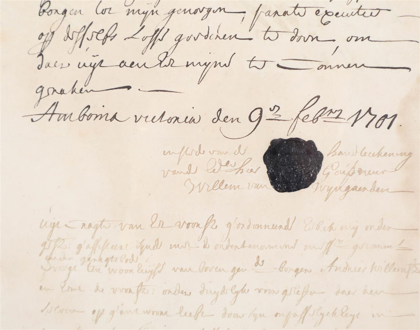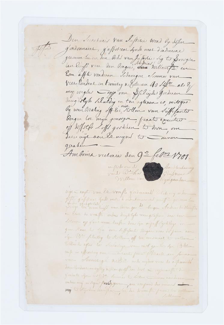 by the "Secretaris va Justitie" (...) "Geassisteert sijnde met d'ordinaire gecommt.en den bode van Justitie", 1 folio leaf, recto and verso (31 x 19.5 cm), for an amount of "Vierhondert en twintig gulden en 90 stuivers", dated "Amboina [Casteel] Victoria den 9e febr. 1701", with black wax heraldic seal surrounded by the words [in a different hand and lighter ink than the debt claim]: "... van de hanteeckening van de ed. heer Gouverneur Willem van Wijngaarden". Folds and other minor defects, kept in sealed plastic. A well-preserved original VOC document from fort Victoria at Amboina, when Willem van Wijngaarden was governor (1697-1701). Below the seal an extensive addition written in the same hand and ink as the words surrounding the seal, stating that Andries Willemsz. "door sijn onpasselijckheit" cannot fulfill the debt, but is allowed to pay a first term of 70 guilders, with his goods as a pledge to be be locked in a chest sealed with a red lacquer seal, the key handed over to the creditor. This part has three signatures below, unidentified by us (Hs. Croo (?), W.H.D. Bevere (?) and 1 other).