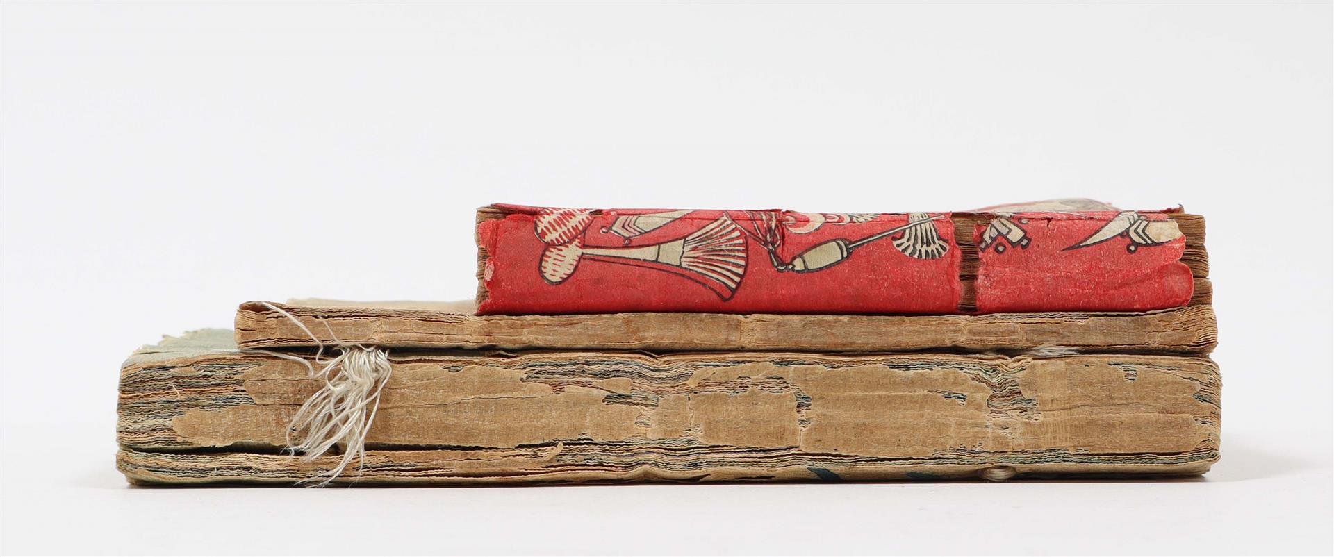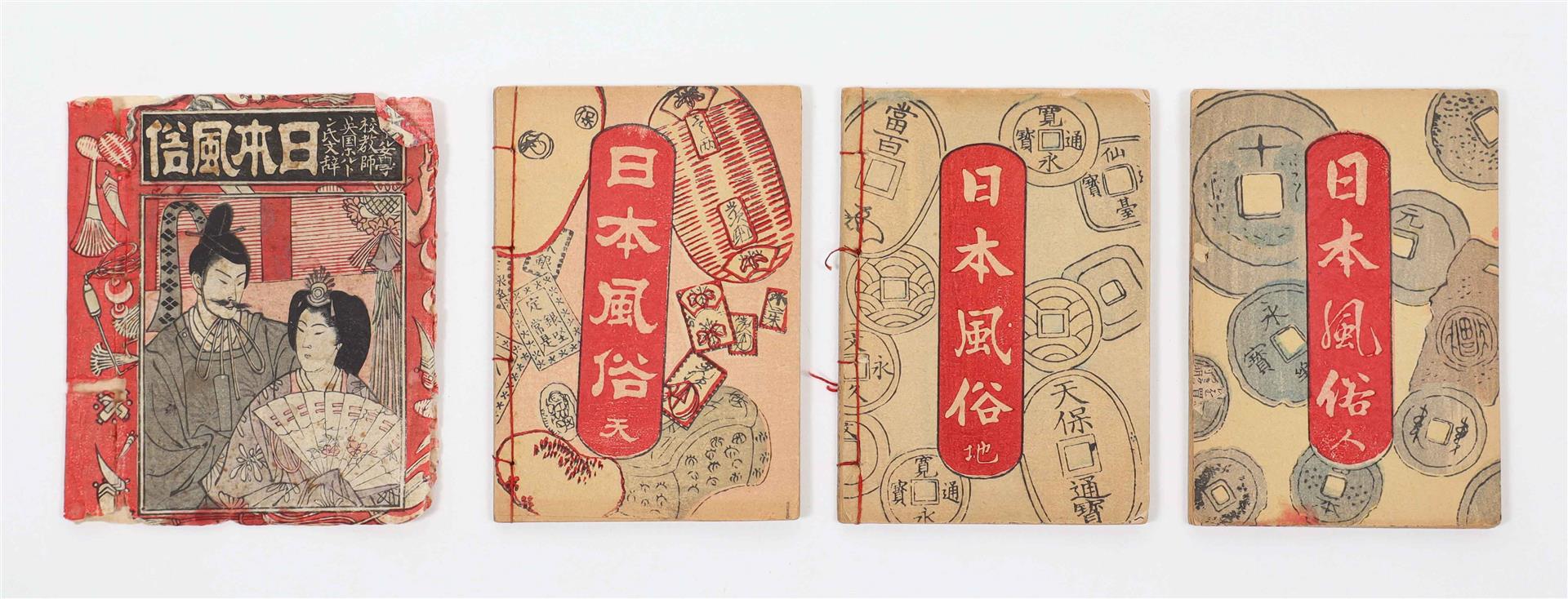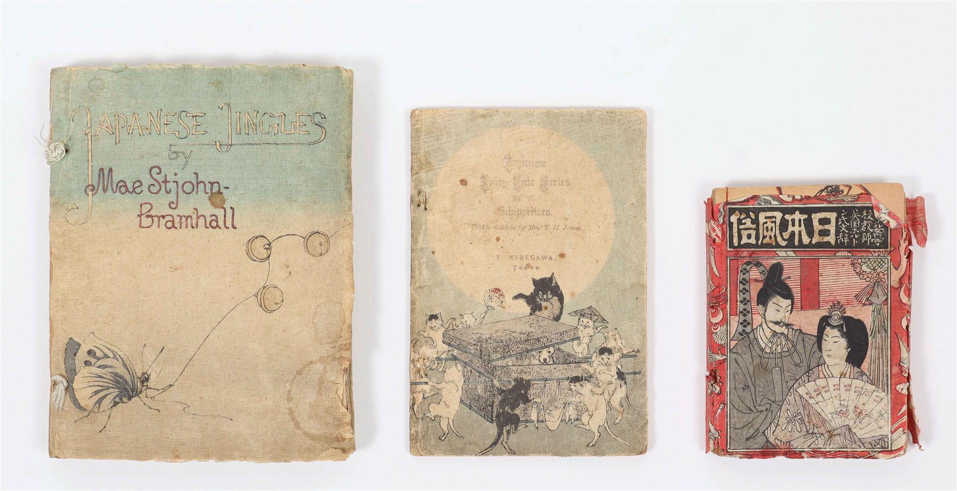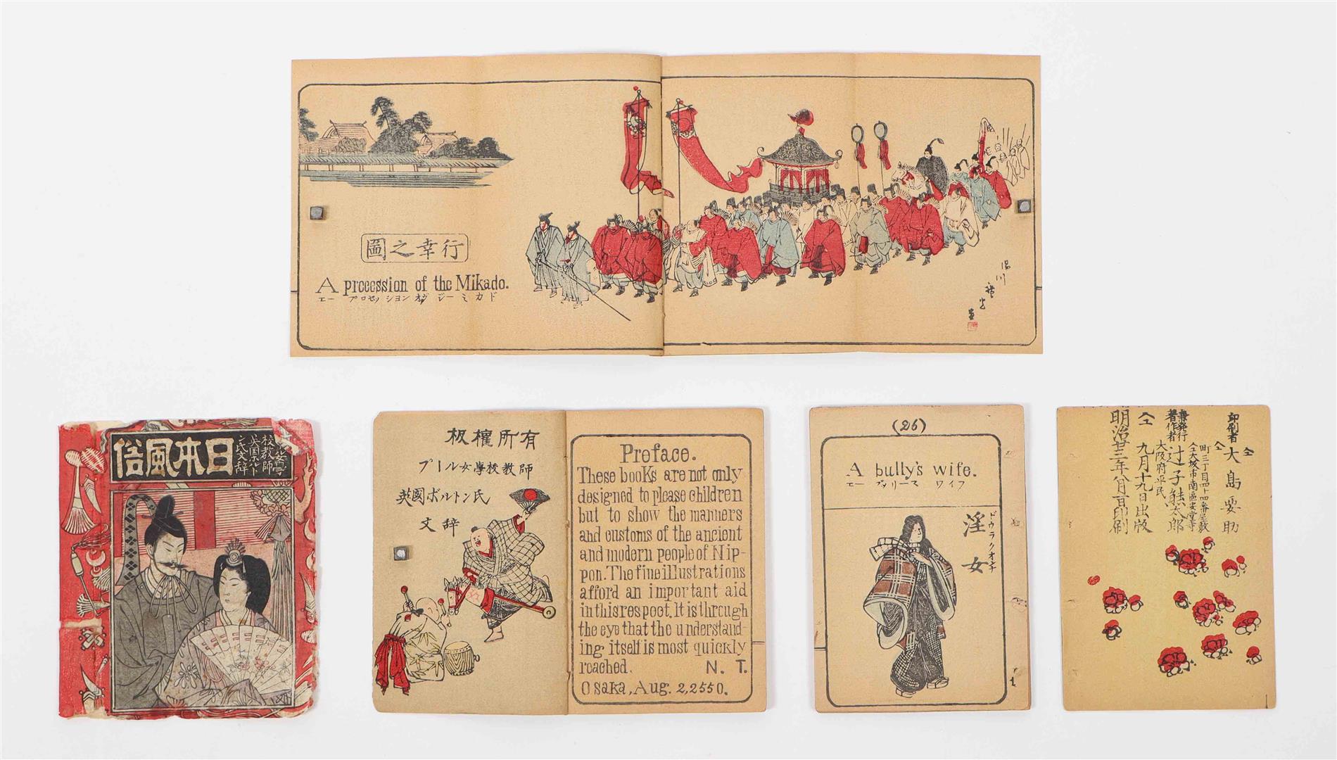 Osaka, Tsujiko Kumataro, 1890. Three vols..: The Daimyos Procession, The Procession of the Mikado, and The Bridal Procession of the Common People. 28; 27; 27, ( incl. one fold.) col. woodcut plates, showing military, servants, merchants, "a bully's wife", samurai, princes and princesses and more. In Japanese stab binding, in a printed wrap-around band, together in a single pictorial sleeve. 10 x 7 cm. With: Japanese Jingles by Mae St John-Bramhall. T. Hasegawa, Tokyo, 1891. Col. woodblock printed illustrations in the Japanese style. 66 p. -and one other.
