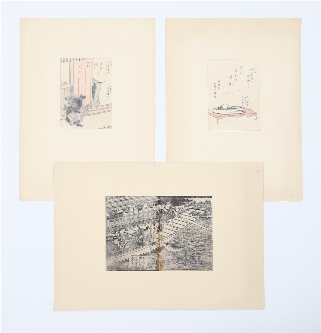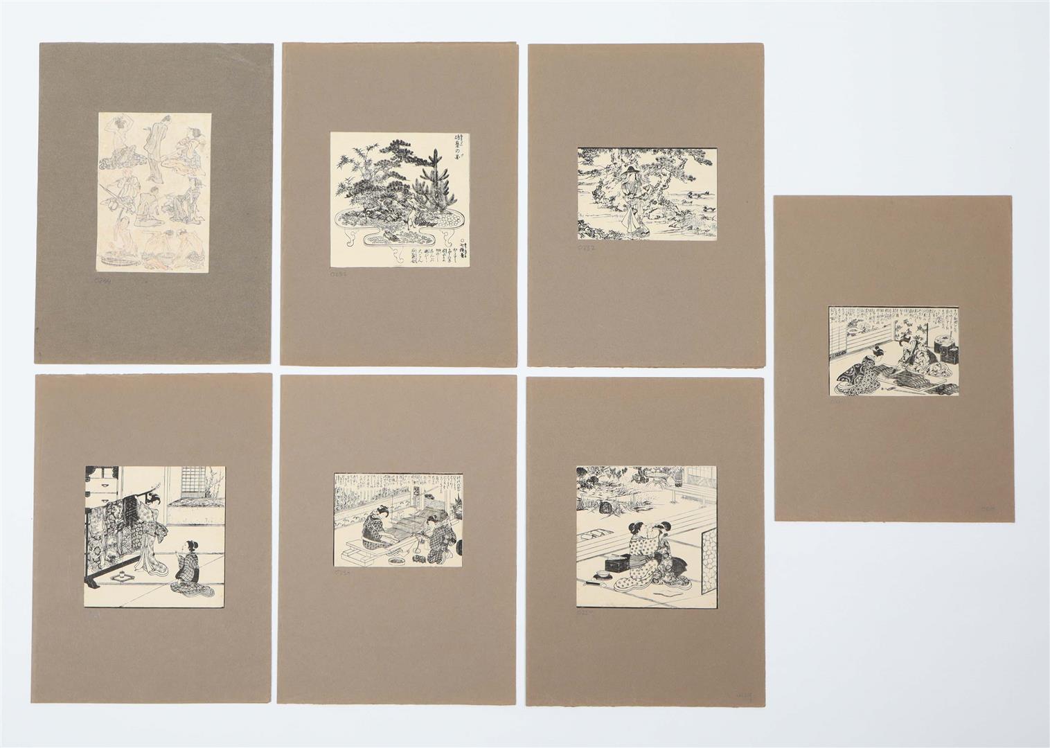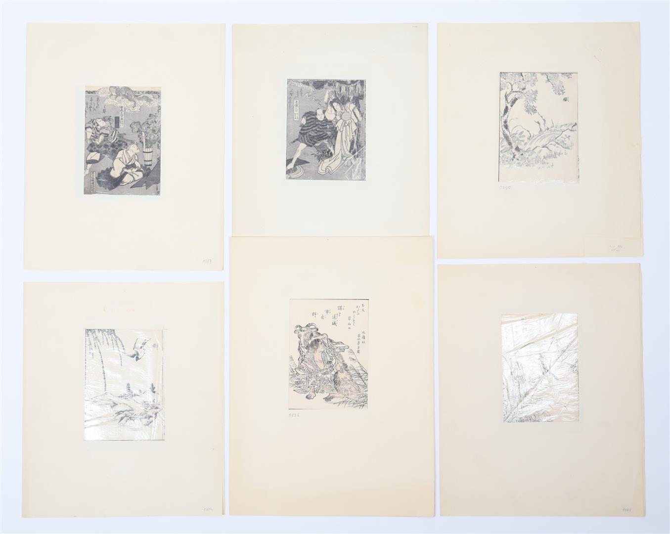 in var. sizes and subjects, all under simple passe-partouts, w. indication "uit Exercises pour l'Usage des Dames" (6x), "Utagawa-School ca. 1850" (5x, samurai and other subjects), "Kwa Cho" (3 landscapes), "Matora" (3x, var. subjects) and "Hokusai-Mangua" (1x).