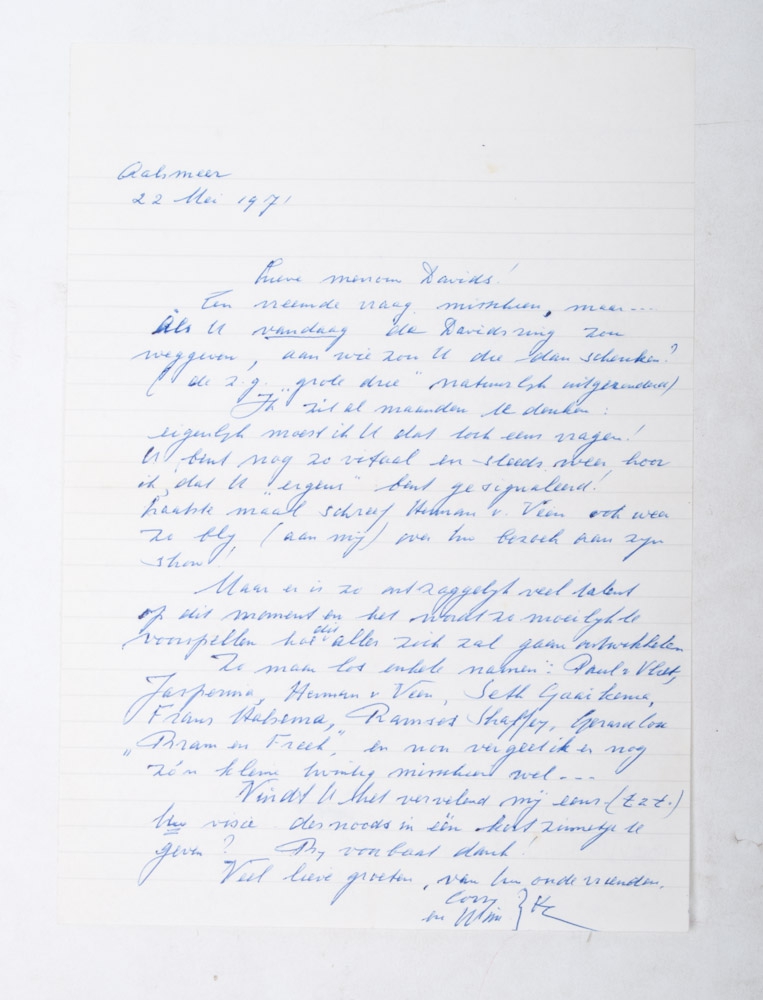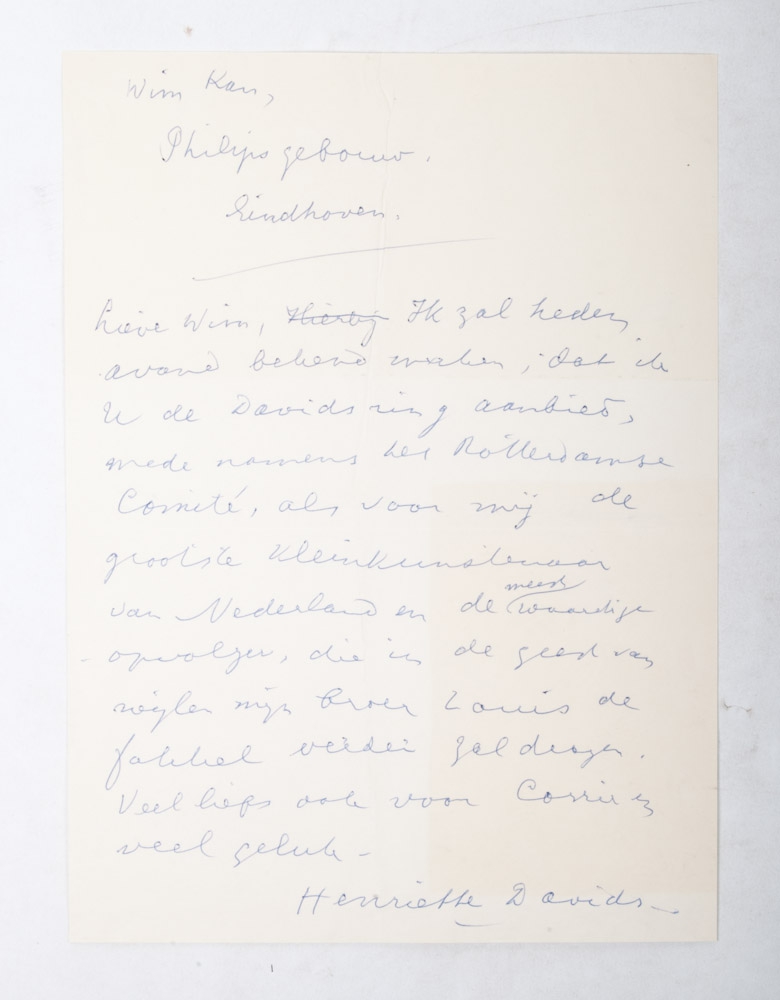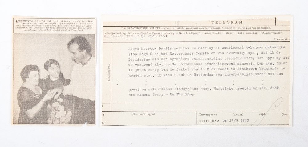 Handwritten letter dated "Aalsmeer 22 Mei 1971", to "Lieve mevrouw Davids", signed "Corry en Wim". Handwritten letter to "Lieve Wim", signed "Henriette Davids". Telegram from Wim Kan and Corry Vonk to Henriette Davids. Newspaper article with photo of Kan, Vonk and Davids at the awarding of the Davidsring.