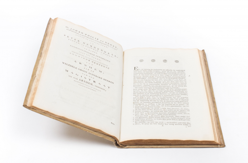 Request, en Remonstrantie, benevens de daar bij gevoegde, Deduktie, cum Annexis, op den naam van de Roomschkatolieke Gemeente van Arnhem, ter verkrijginge van een onbepaald Burgerschap aan de Weledele Grootachtbare Heeren van den Magistraat der Stad Arnhem, gepresenteert, en ter vergaderinge van Dezelve ingediend op den V. van Mey des jaars 1784. Te Nijmegen, Bij A. van Goor, Stads- en Quartier-Drukker. 1784. [2 vols. in 1 binding] (2), 18; VI, 64 pp. and (27) blank leaves of which the first 3 pp. contain contemporary ann. in ink; sm. folio, contemporary vellum, trifle soiled and warped, title in ink on spine.