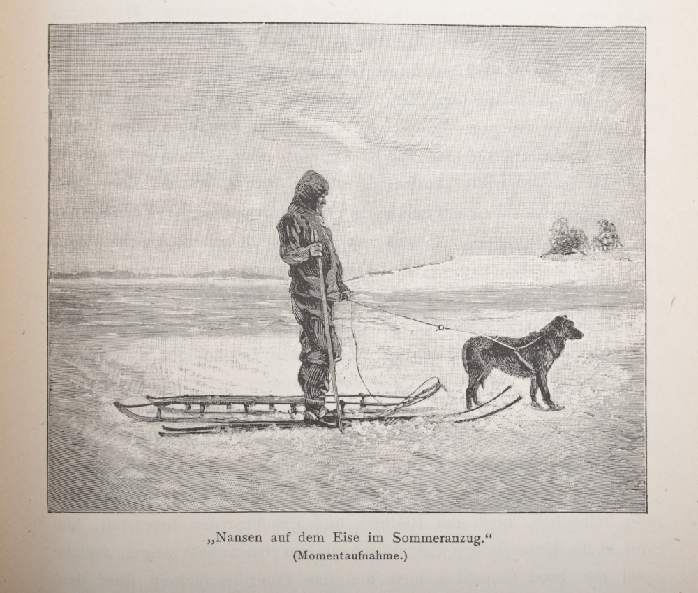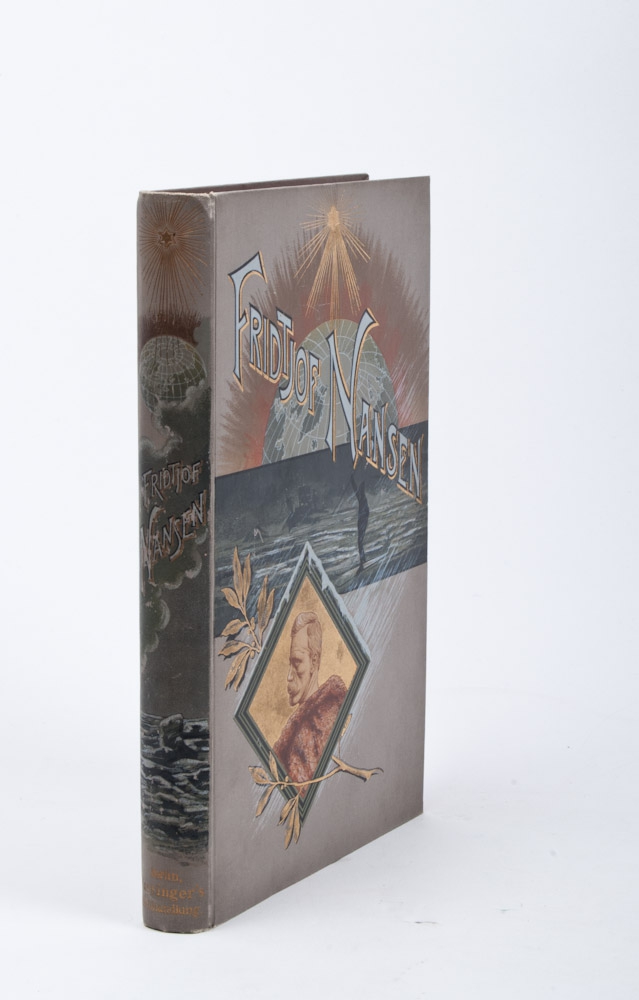 8vo., illustrated binding with title andf portrait of Nansen, 478 p. and a map of the North Pole area up to the 60th parallel north in colour lithography. With plastic cover.