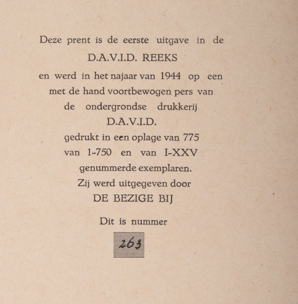 Bezige Bij. First edition in the D.A.V.I.D. Reeks, November 1944. 750 and 25 I-XXV numbered copies printed. This is number 263. Stamp "Door drukken aanvallen" on the back. 38,5 x 27 cm.