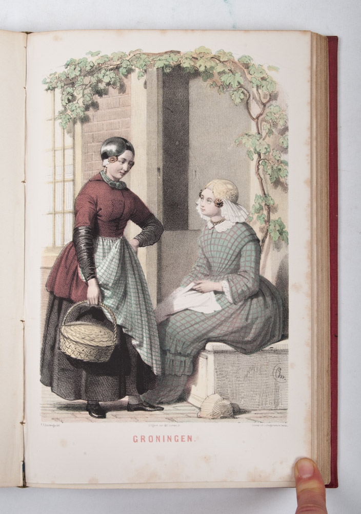 4to., half-morocco, title on spine with giltstamping, frontispiece in chromo-litho and 45 prints, 41 of which are full-page colour lithos and 4 woodcuts, also var. in-text woodcuts, XIV,(2),344 pp., rust stains. First and only edition. Important work for the depiction of traditional Dutch dress. In good condition.