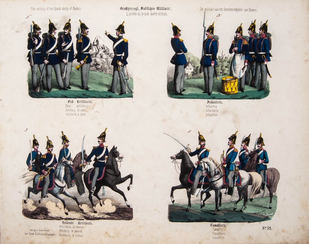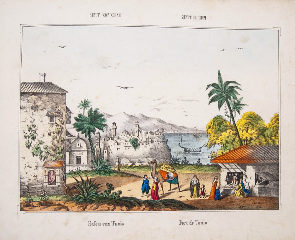 Bilderbüch für die Jugend, Stuttgart bei Hartneck and Comp. 19 hand-coloured engravings, Joseph Scholz im Mainz. Folio, (42-34 cm). Collection of prints, mostly militaria (12 prints) with e.g. Prussian, Hungarian and Austrian cavalrye - and the Battle of Dembinsky, Hungary-Russia 1849. Also 7 various prints, such as an optica of the Harbour of Tunis.