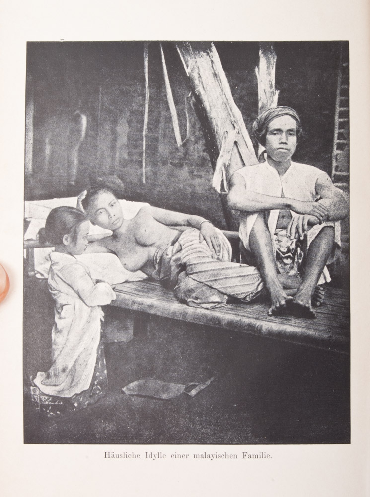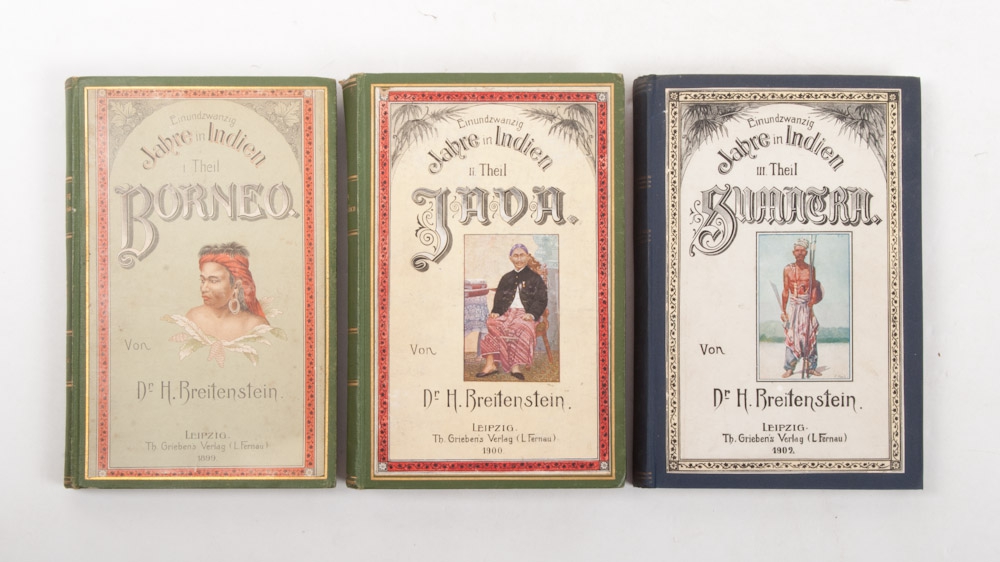 Aus dem Tagebuche eines Militärarztes. Von Dr. H. Breitenstein. Erster Theil: Borneo. Zweiter Theil: Java. Dritter Theil: Sumatra. Leipzig, Th. Grieben (L. Fernau), 1899-1902, 3 parts, VIII,264;XII,407,(1); VIII,232 p., with 3 frontispieces and 8/ 29/ 26 illustrations (on plates), original uniform cloth with gilt spine (I-II), different cloth (III), all parts with original, illustrated paper binding title on front casing.
