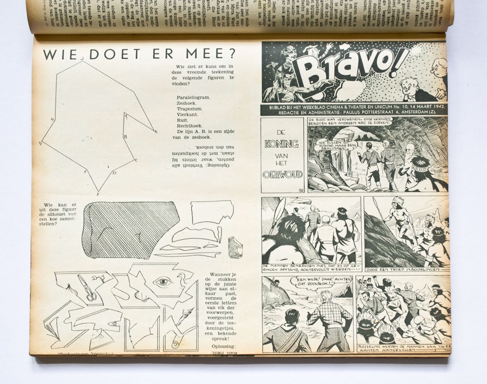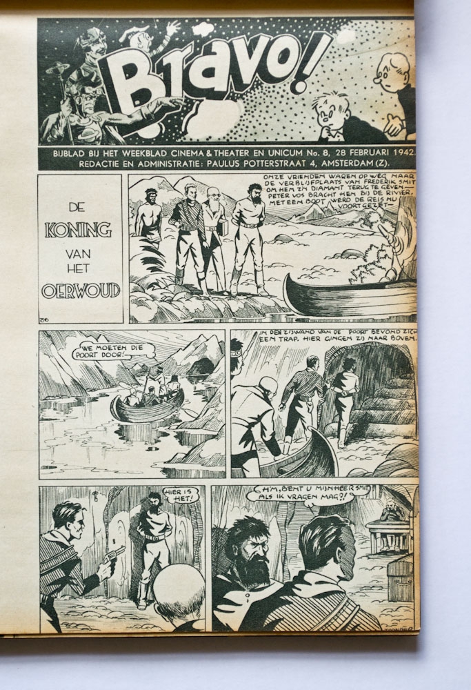 22nd vol. nr. 2 to nr. 14, 1942. With supplement: cartoon magazine "Bravo!" with strips such as '25 km onder de aarde' by Tadema and 'Jim en Soe' and 'Dikkie en Dunnie' by Marten Toonder.