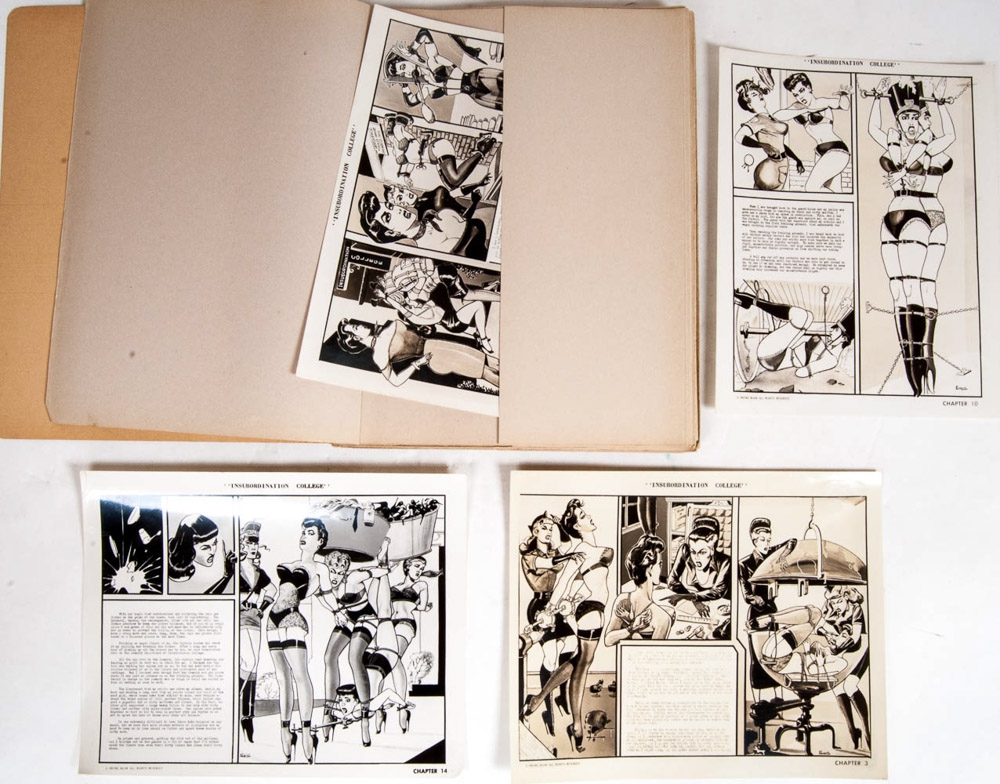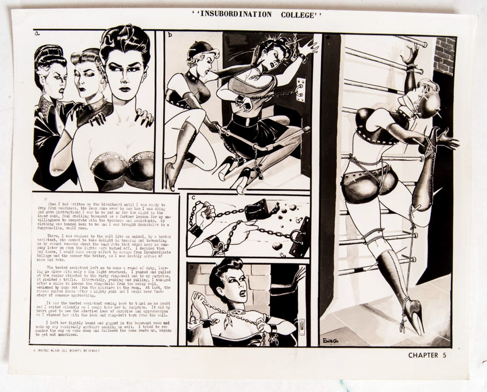 Insubordination College, Irving Klaw, 1955. Complete story in photo proofs. 30 pp. SM story with drawings by Bilbrew, with text in image. 20,5 x 25,5 cm per leaf. Each page loosely inserted in sleeve.