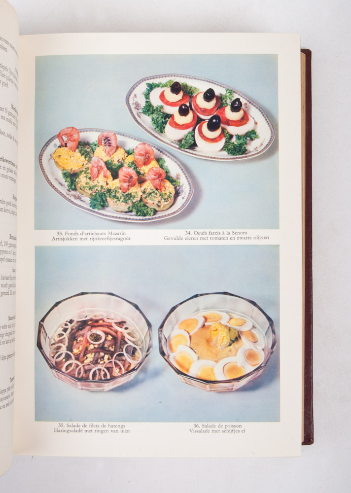 Sm. 4to., faux lether, 2 volumes with 480 - 972 pp., and added: Handboek voor het Hotel - Café - Restaurant met een inleiding van F.A. Pfeifer and in cooperation with C.S. Baljon, J.W.F. Werumeus Buning and many others. Universum, Amsterdam and Antwerpen, 1954. Faux leather, 503 pp. the 3 books unformly bound and complete with recipies and illustrations in colour and black & white.