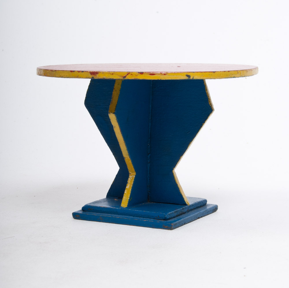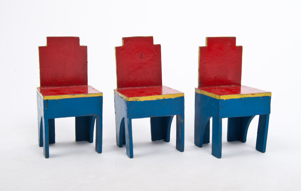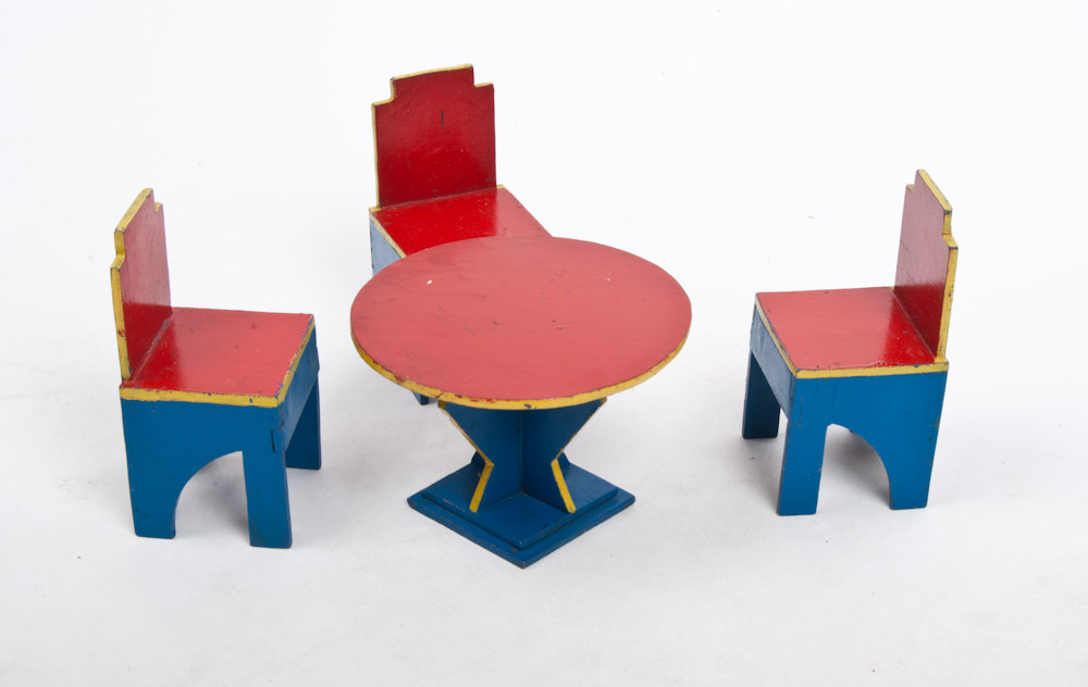 Wooden doll furniture. 2 armchairs, 3 chairs and a table. All in blue, red and yellow. Unmarked, circa 1935. Height armchairs 11.5 cm.