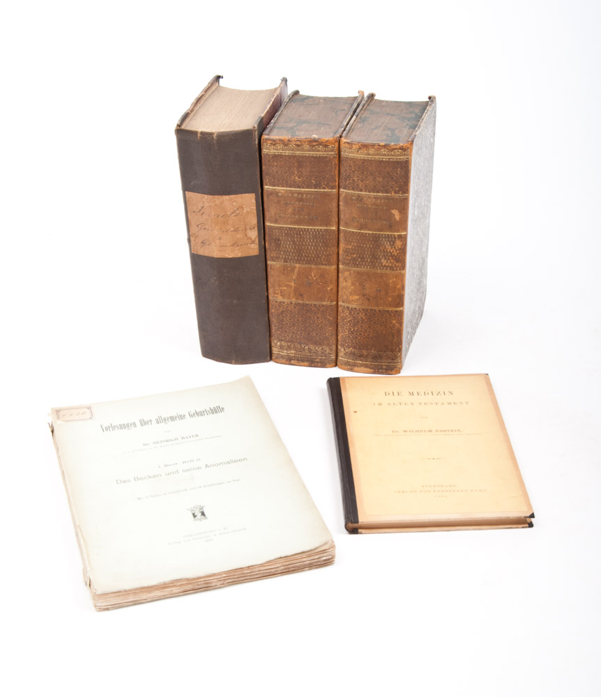 2 vols., 8vo., half-leather, gilt-stamped title on spine, marbled page edges, 566,576 and 610,576 pp., First Dutch edition. Standard work and: 8vo., half-cloth, XX,929 pp. + 2 other medical works. (5 in total)