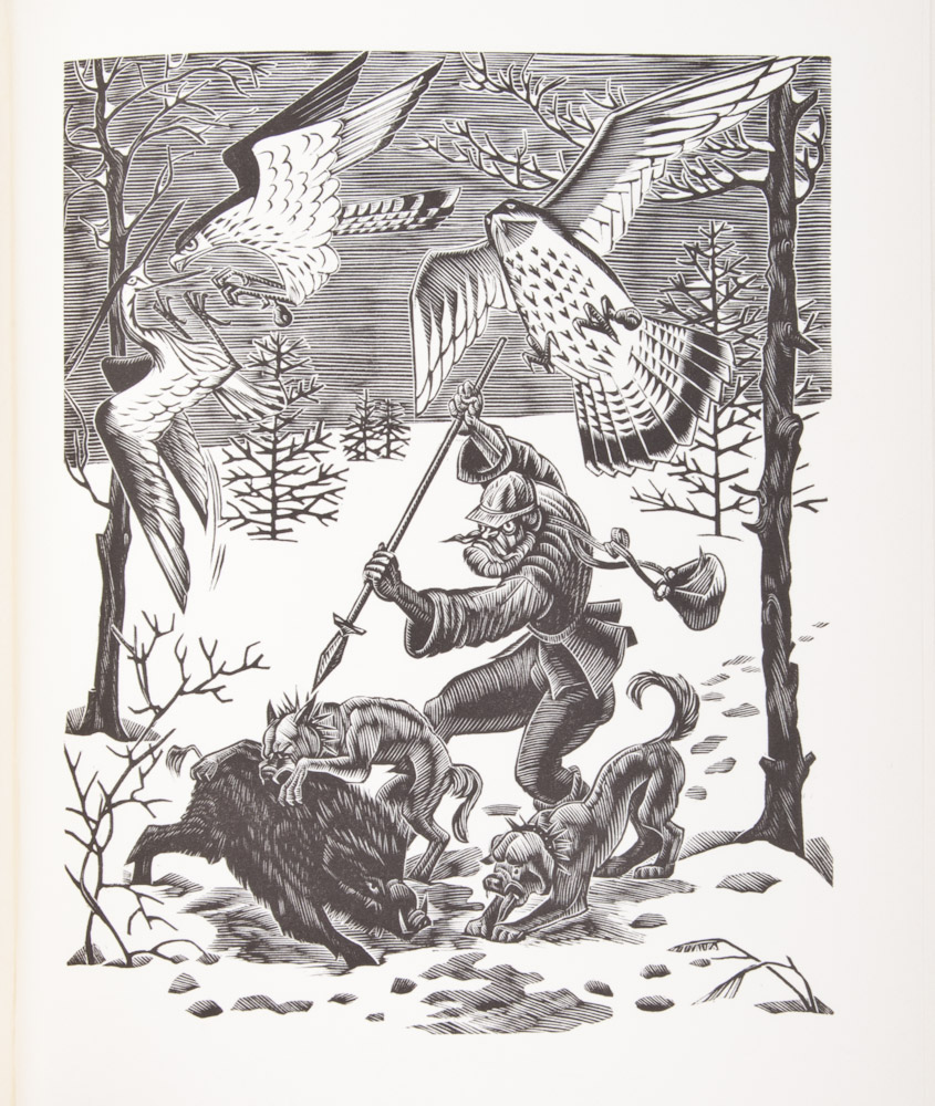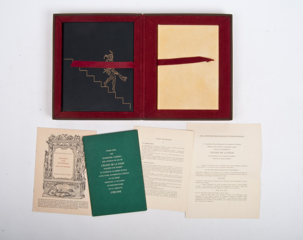 Paris, Union Latine d'Editions, 1967, Edition du Bibliophile, Lausanne. 1. Facsimile of the Latin edition of 1515 by Froben, illustrated by Holbein and kept in Basel, Paris, Maurice Robert, 1967, artificial leather binding. 2. Presentation of the French translation by Jacques and Anne-Marie Yvon with original woodcuts by Jean Chieze, Paris, Union Latine d'edition, 1967, 4to., black gilt-stamped leather, ill. 180 p. and 3. Study by Dr. Hanspeter Landolt concerning the Basel edition and the Holbein illustrations. This facsimile edition appeared on the occassion of the Erasmus birth year commemmoration, 500 years ago.