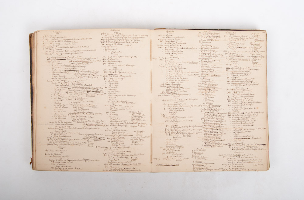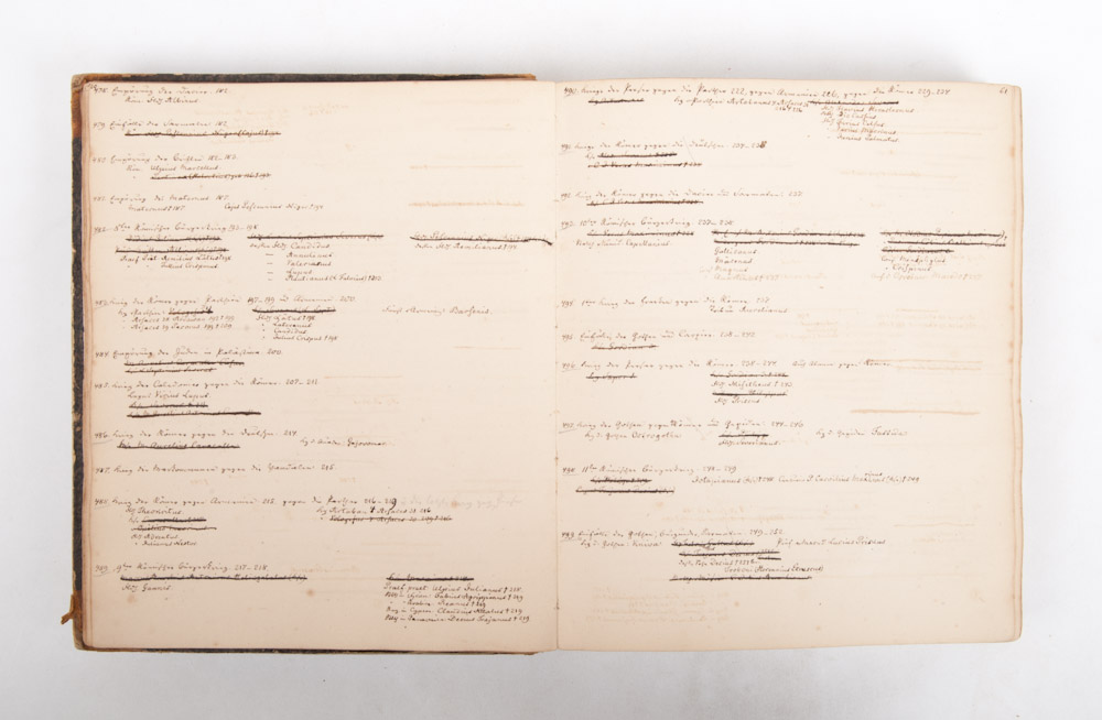 Unusual, massive work in which the writer has finished the seemingly impossible chore of writing down over 3000 wars in chronological order, with details such as years of important persons (some very long lists of persons for several 18th and 19th-cy wars). The last contributions mentions the war of Montevideo against Rivera, 1846. Under the title, a different hand in pencil mentions the name "v. Loebell", who may have been the writer of the ms.