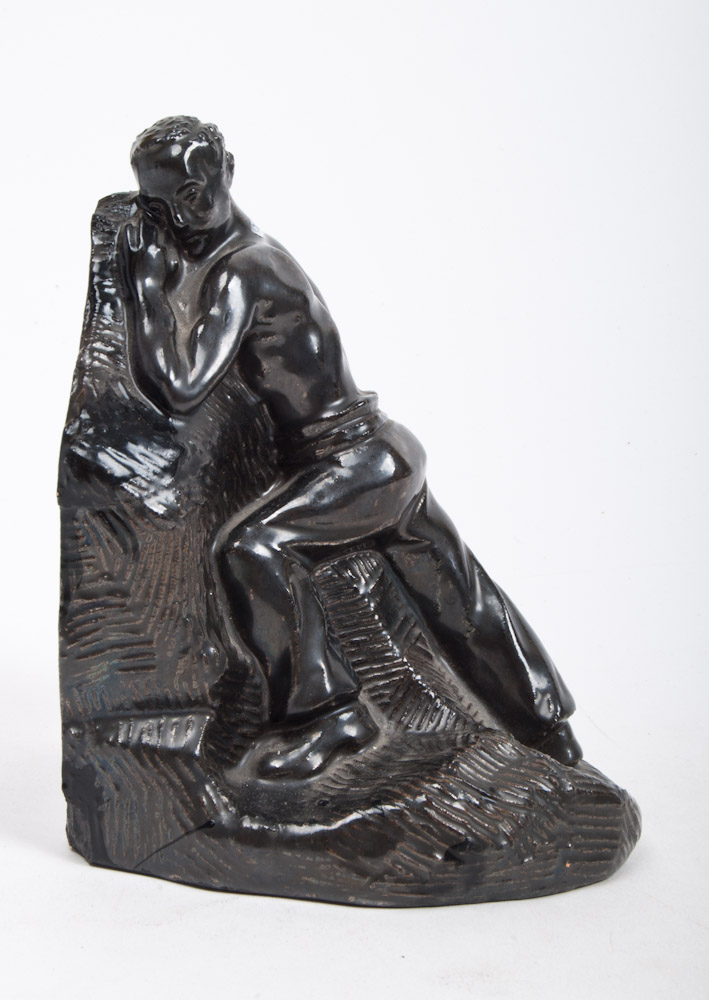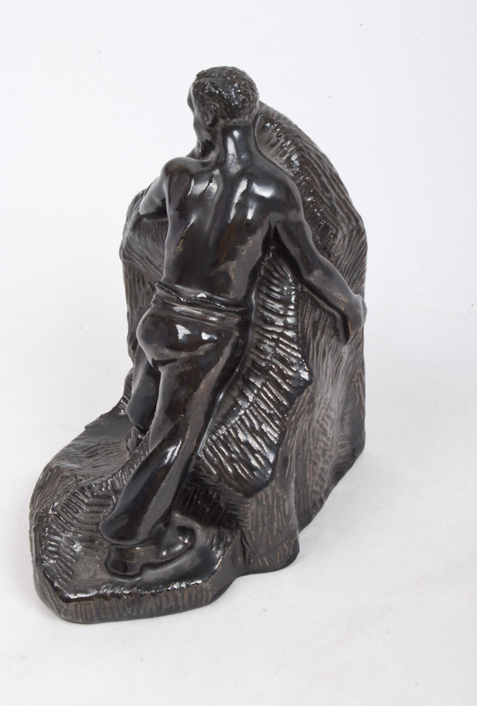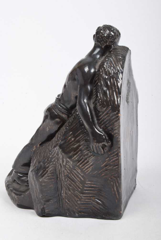 Ceramic, black glazed, in the shape of a pushing and shoving man. Circa 1920, height 19 cm.